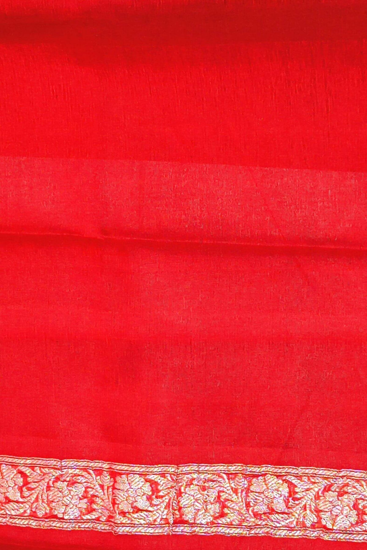 Description: Banarasi silk chiffon saree in bottle green with silver buttis & border and a contrast pallu in red