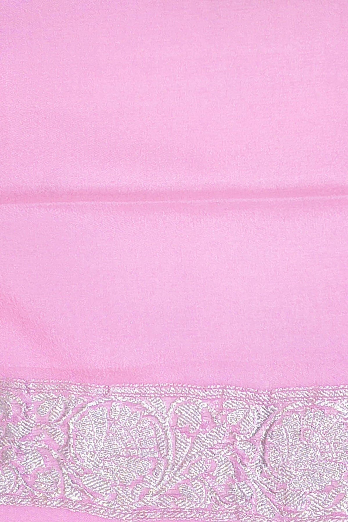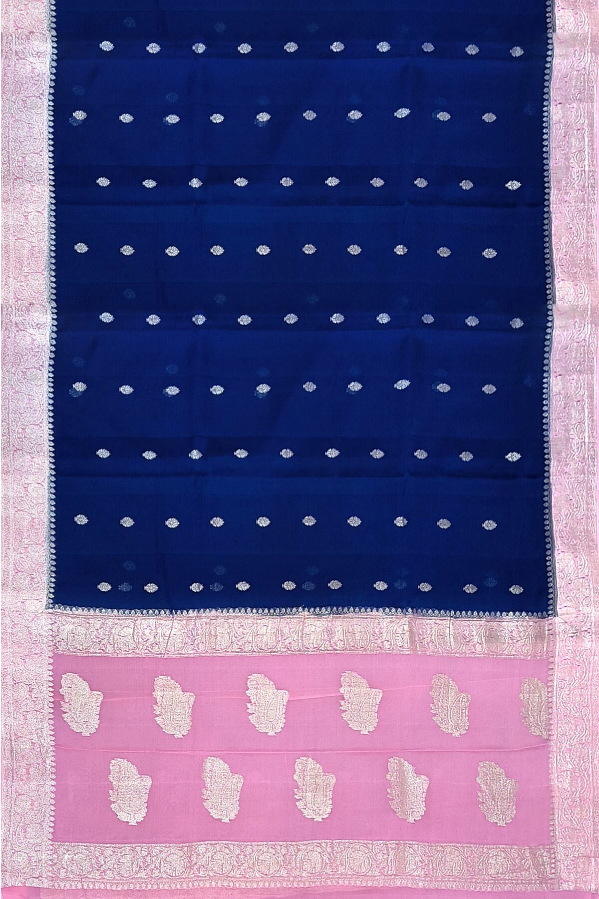 Description: Banarasi silk chiffon saree in navy blue with silver buttis & border and a contrast pallu in pink