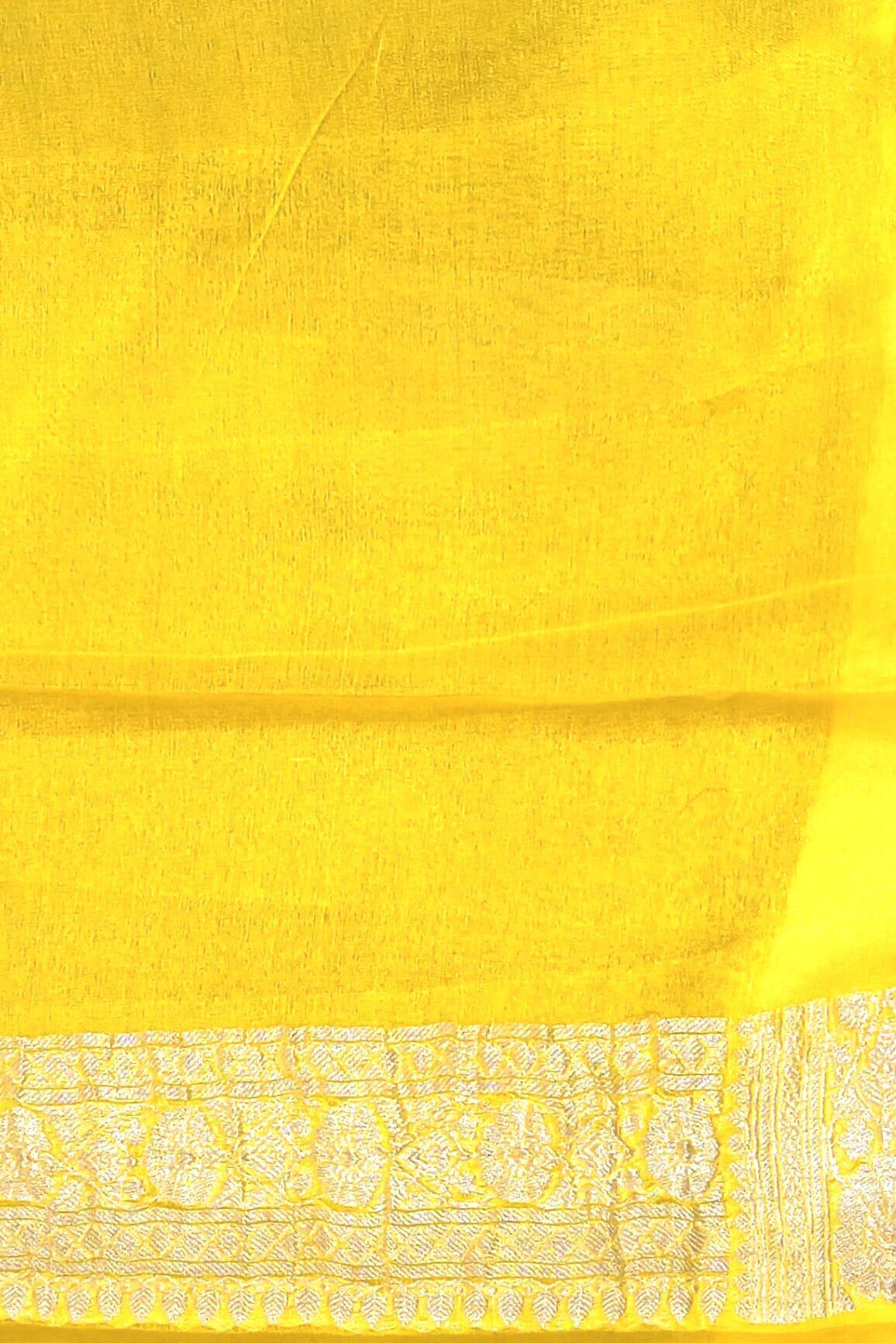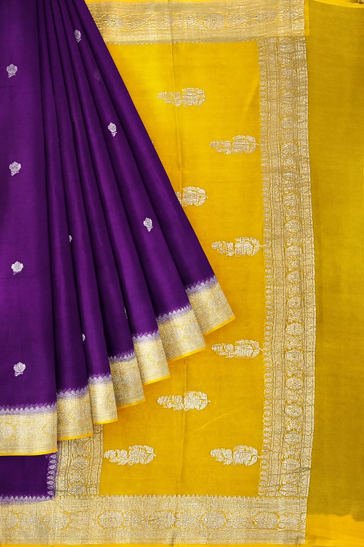 Description: Banarasi silk chiffon saree in purple with silver buttis & border and a contrast pallu in yellow