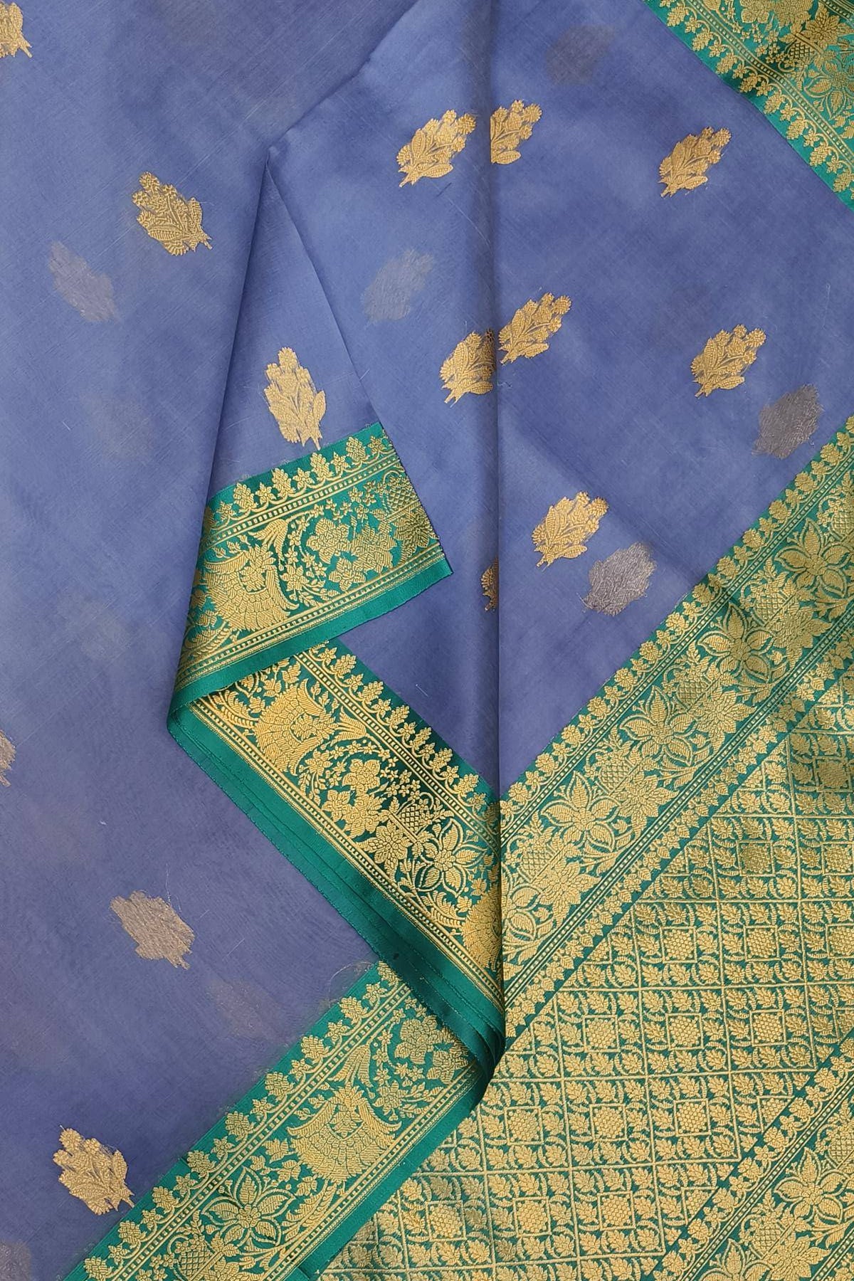 Description : Banarasi kora katan pure silk saree in steel blue . ( Organza body , katan pallu , borders & blouse)