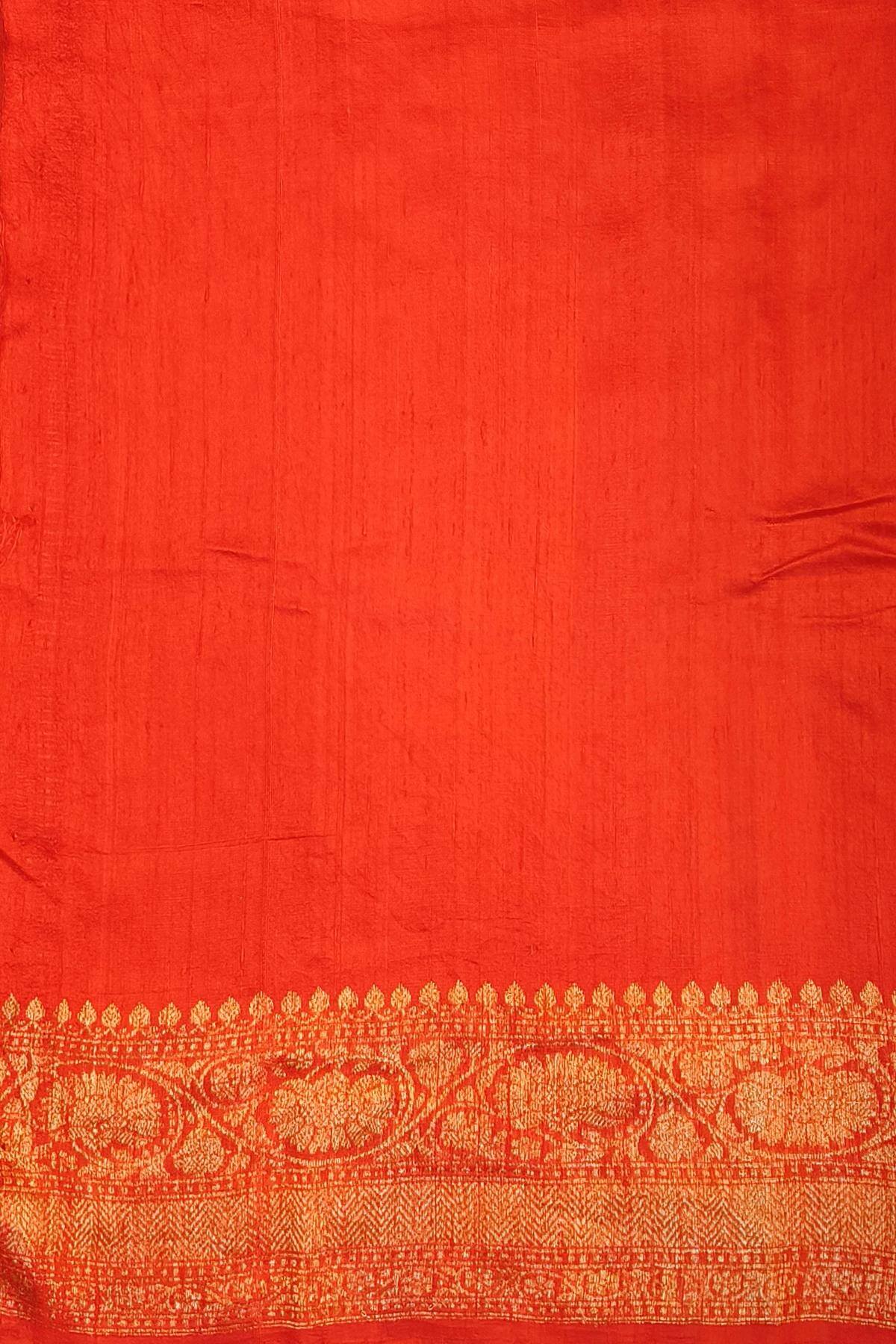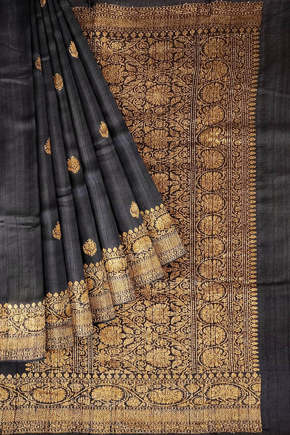 Description : Handloom Banarasi katan pure silk saree in black in dupion finish with floral motifs . Complemented with rich pallu & border in antique zari and contrast blouse in red.