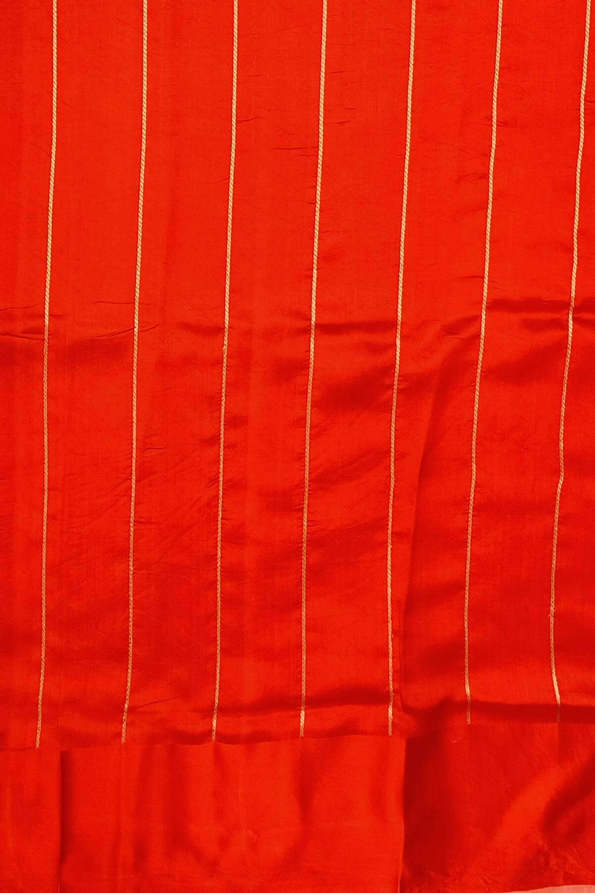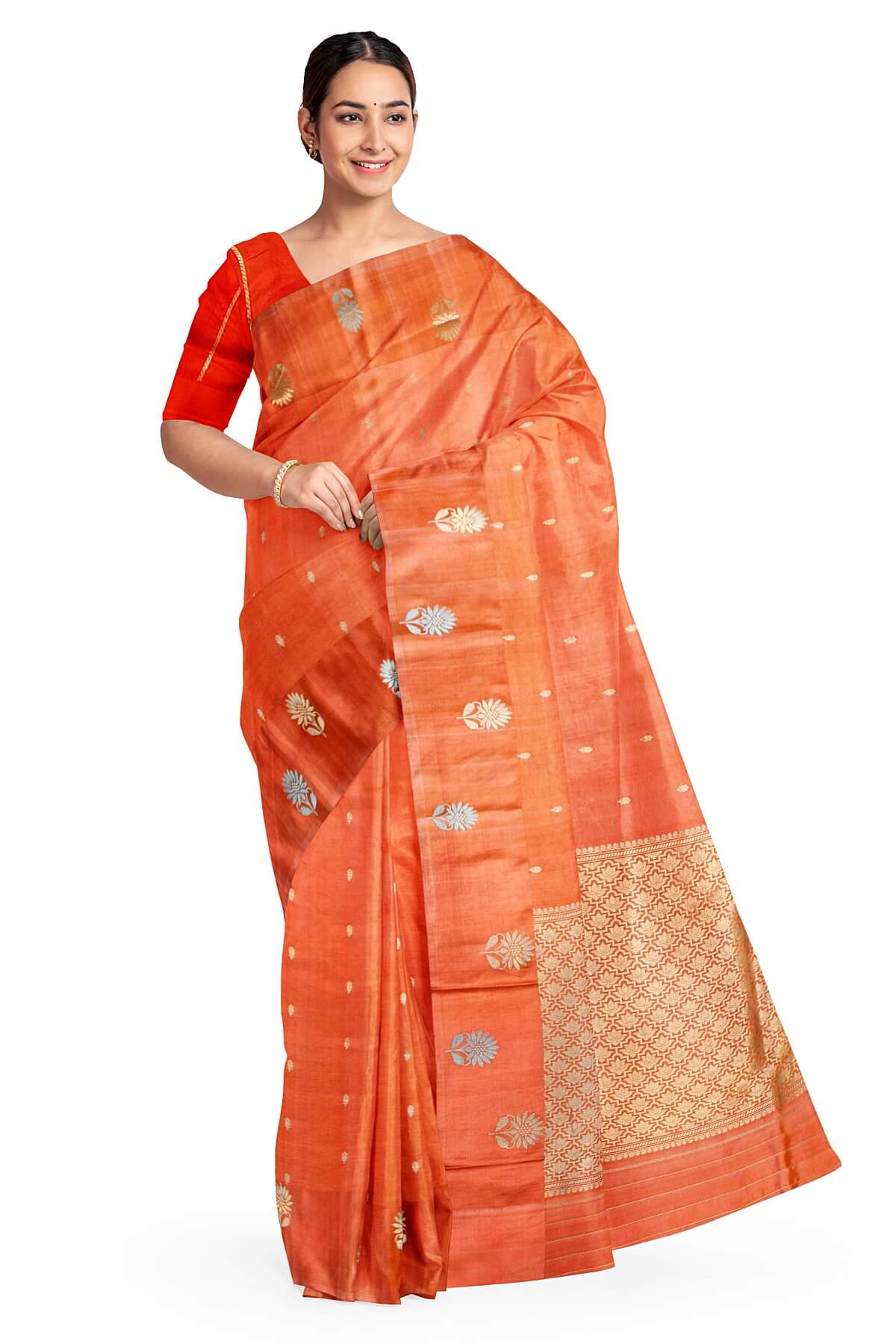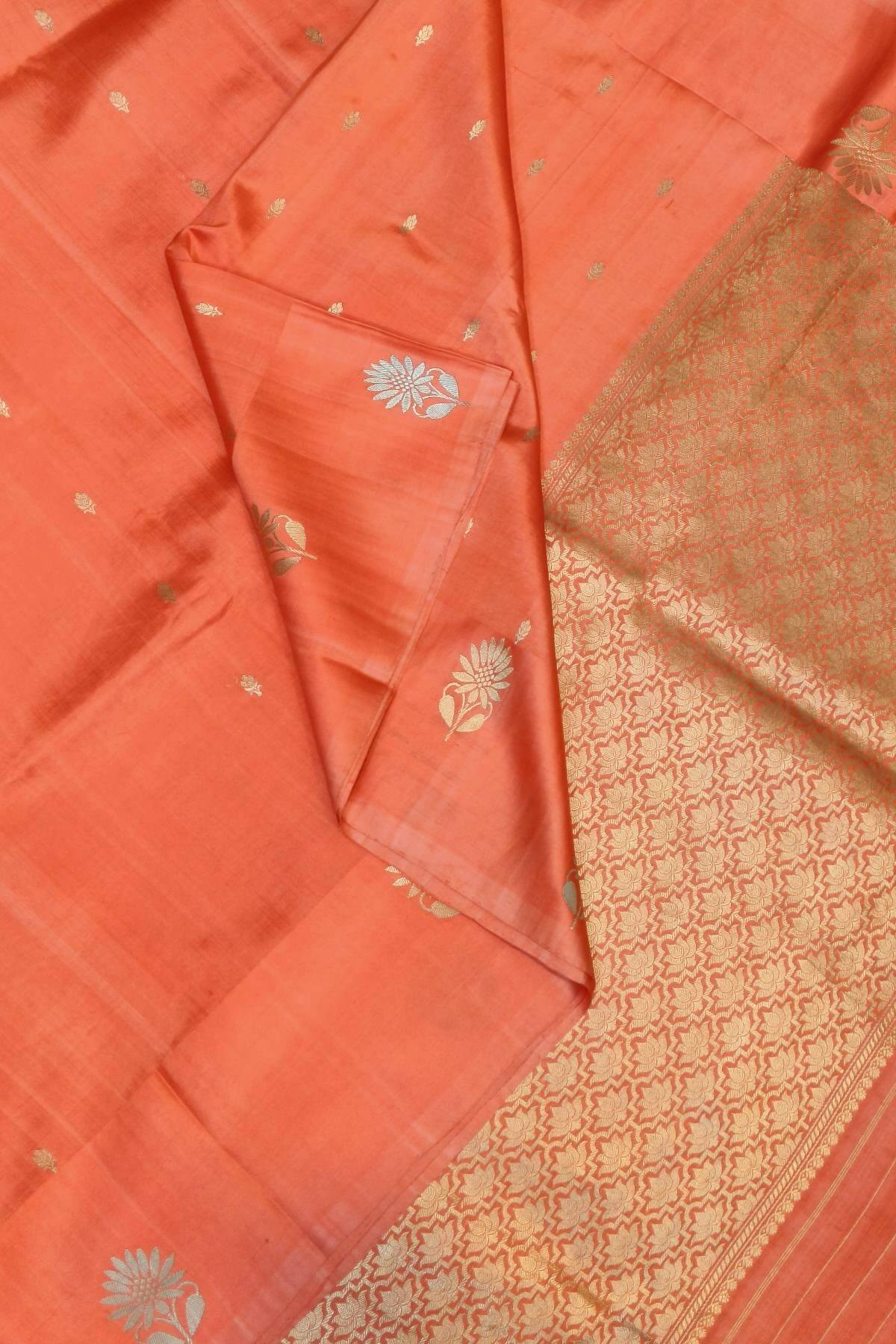 Description : Handloom Banarasi katan pure silk saree in dark peach with small motifs and a rich pallu. Beautiful floral motifs in gold & silver on the border and a contrast blouse in red. Soft , smooth & lustrous . Trendy and contemporary design.