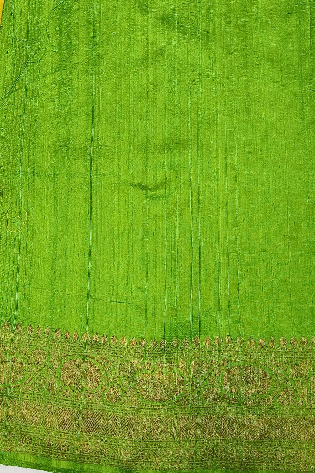 Description : Handloom Banarasi katan pure silk saree in green gram in dupion finish with floral motifs . Complemented with rich pallu & border in antique zari and contrast blouse in leaf green.