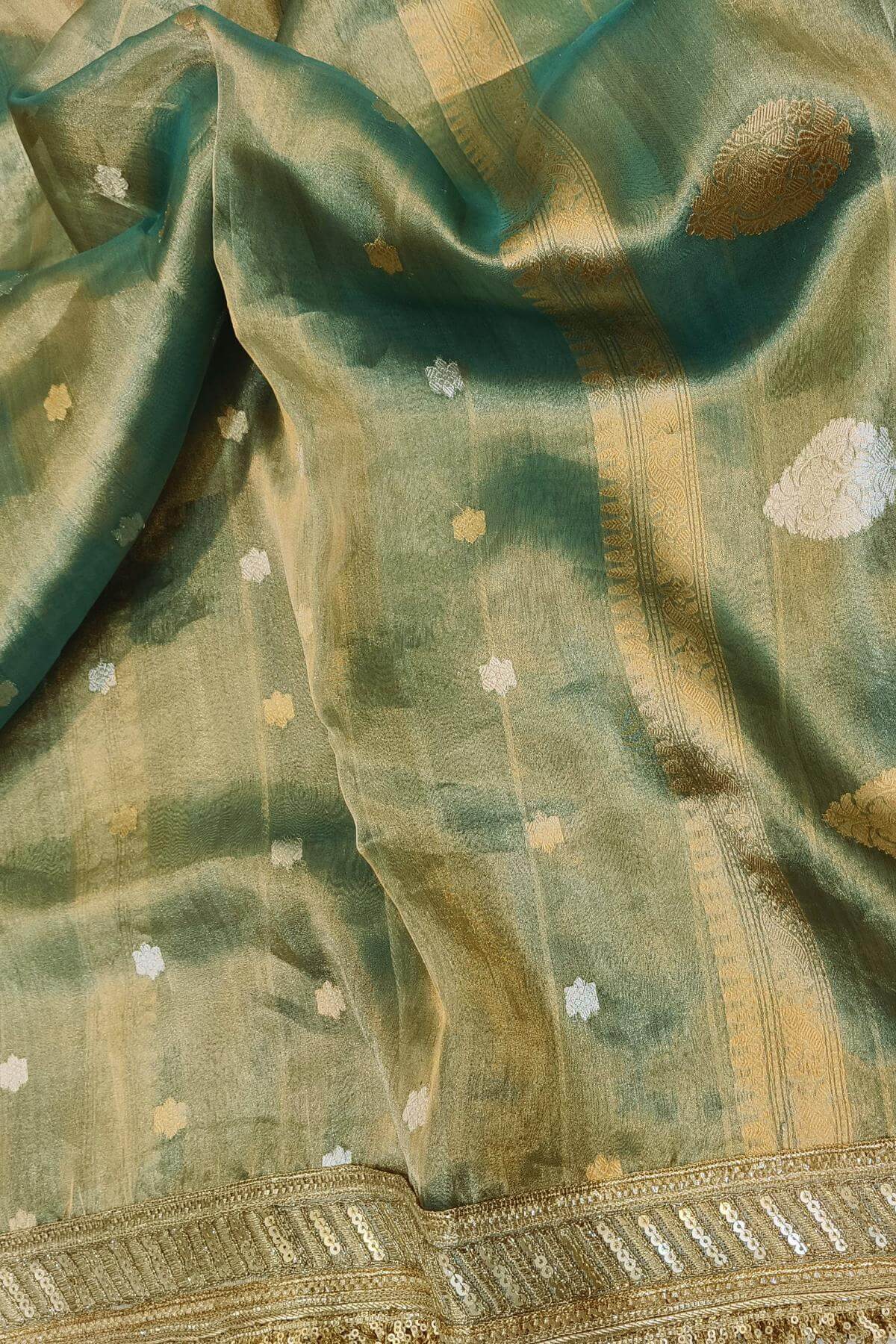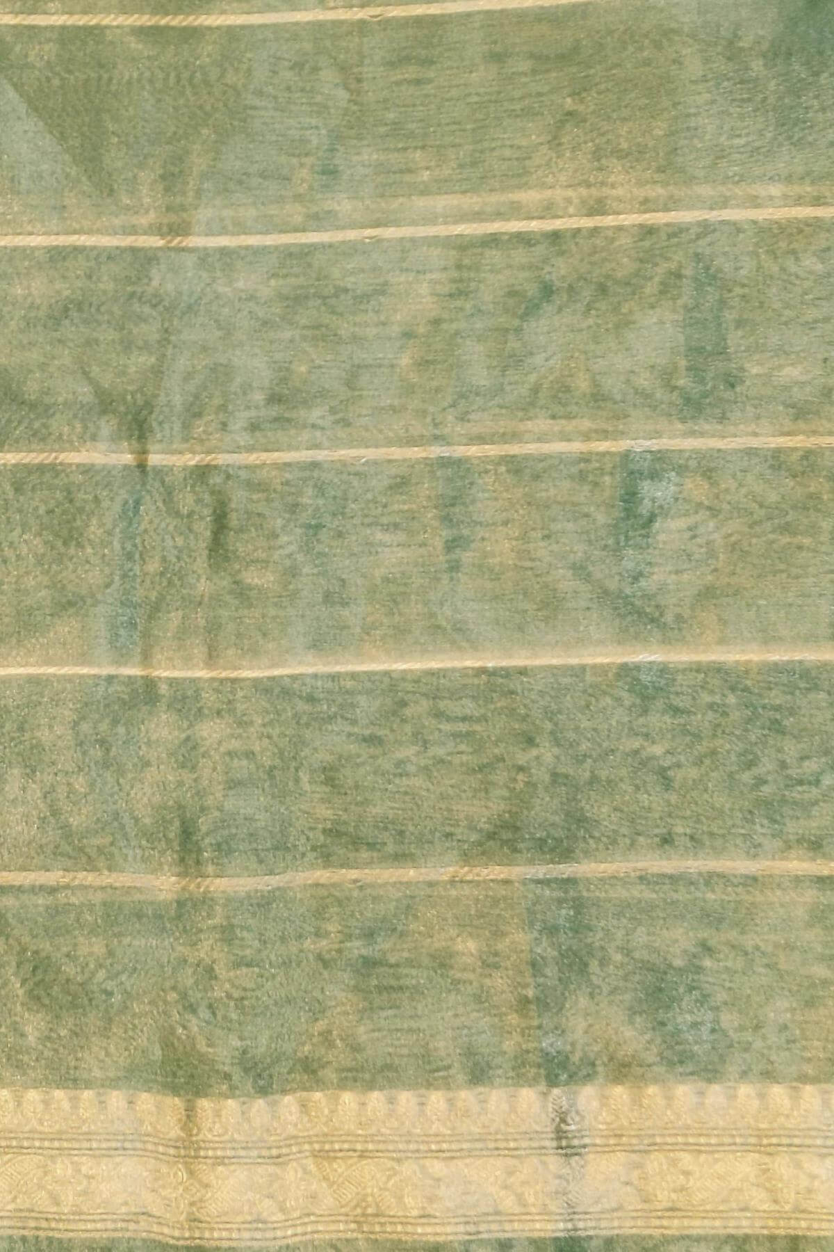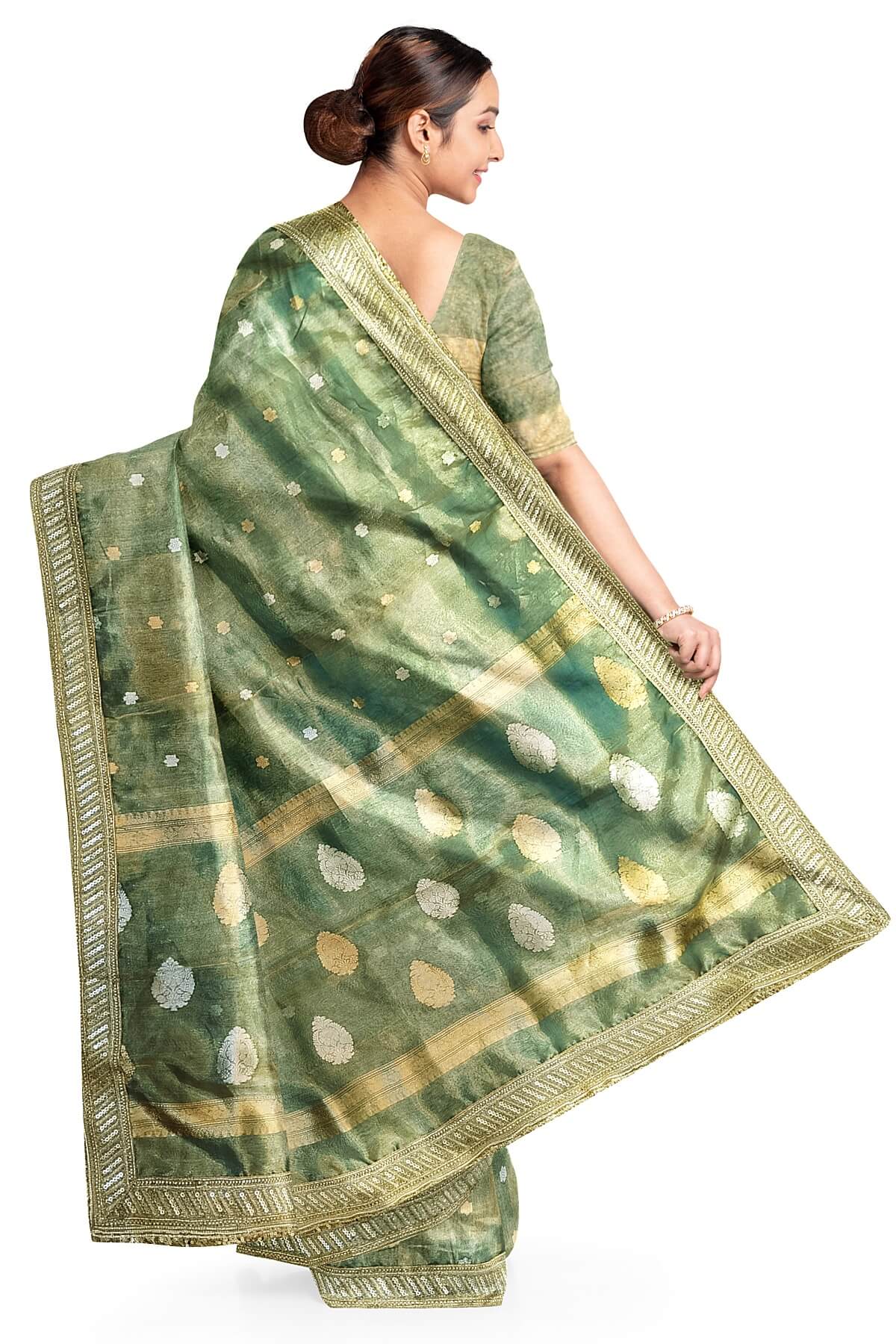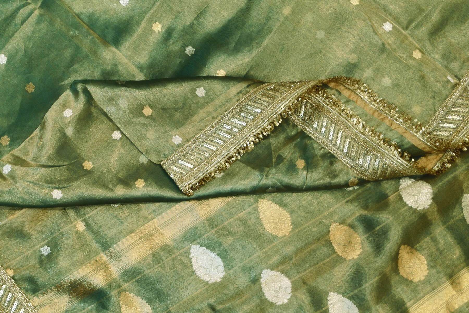 Description: Handloom Banarasi silk tissue saree in sage green with floral motifs in gold and a lace border.