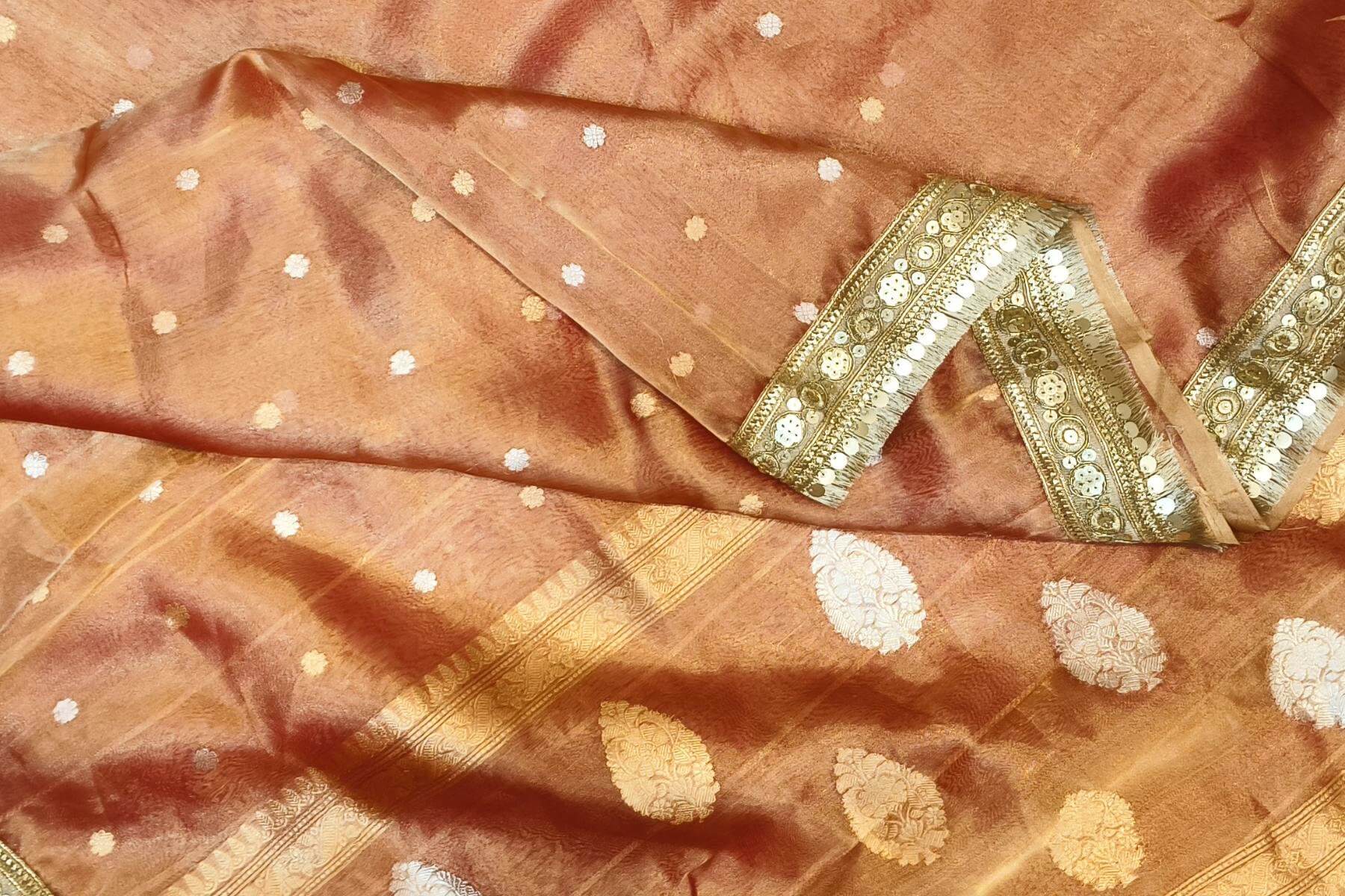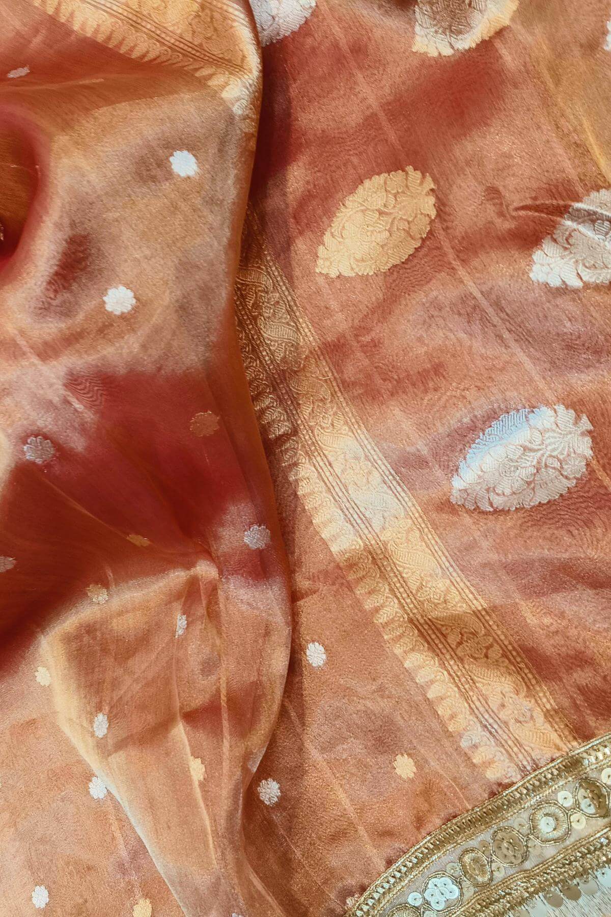 Description: Handloom Banarasi silk tissue saree in rust with floral motifs in gold and a lace border.