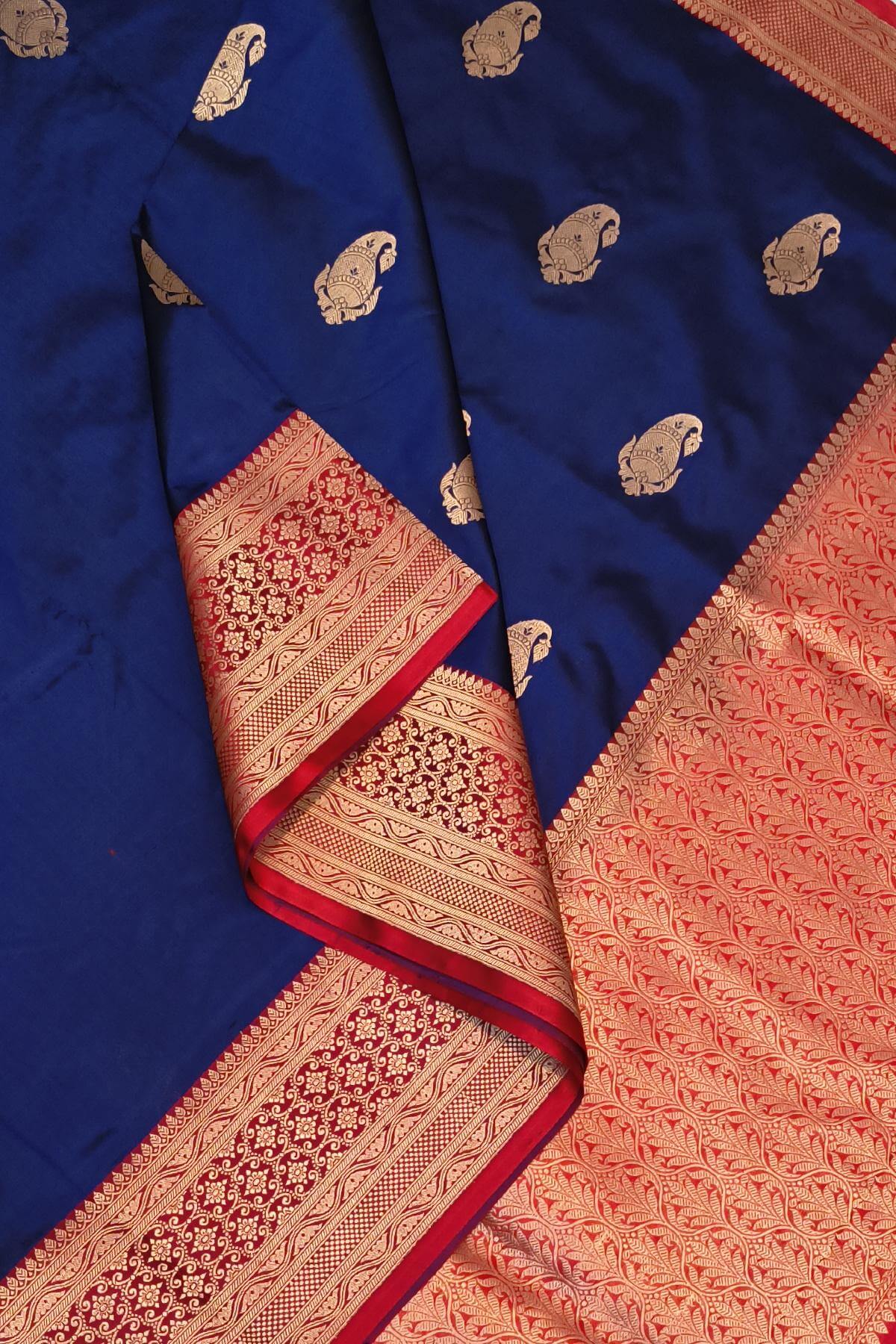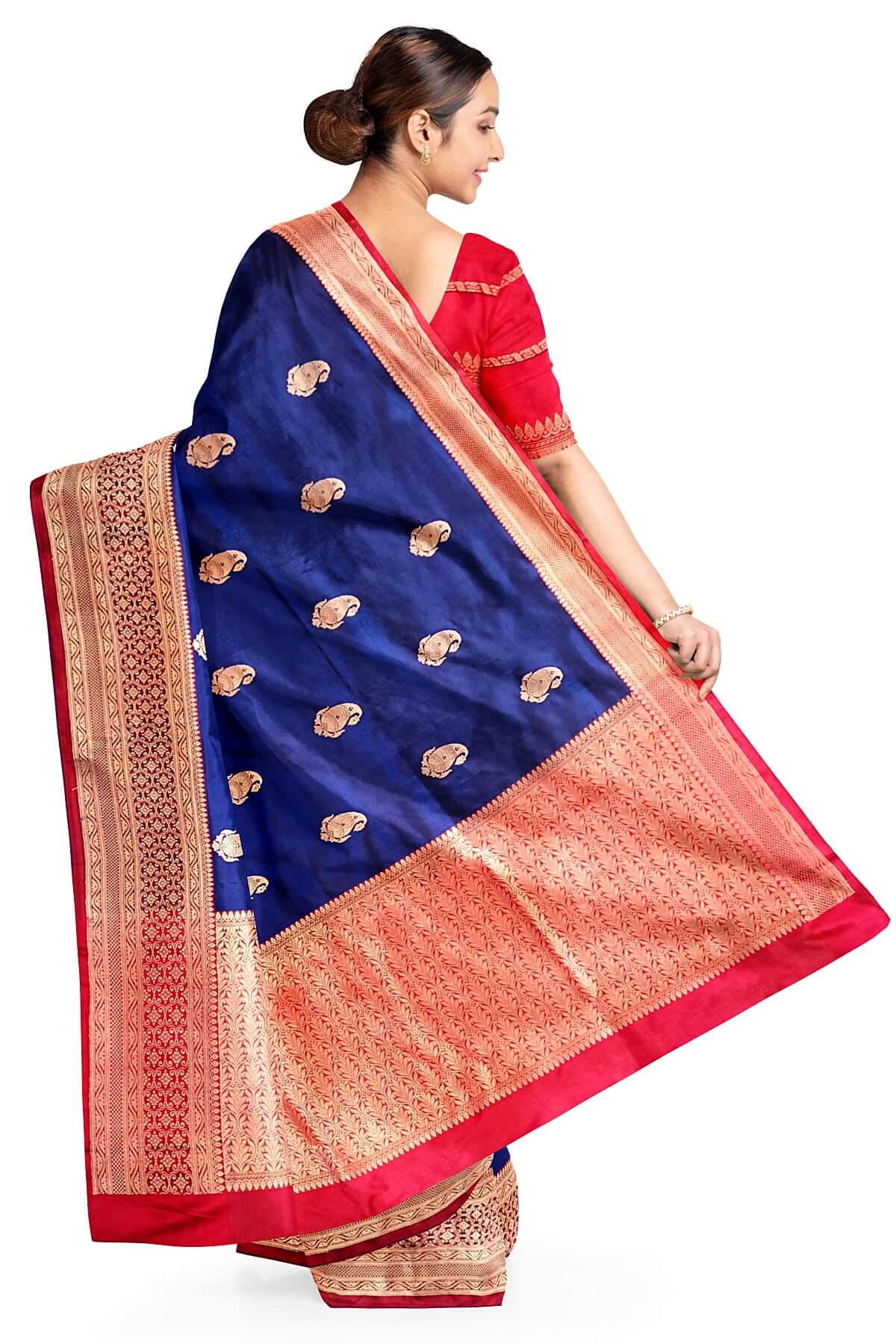 Description : Handloom Banarasi katan pure silk saree in blue with paisley motifs and a contrast pallu in red