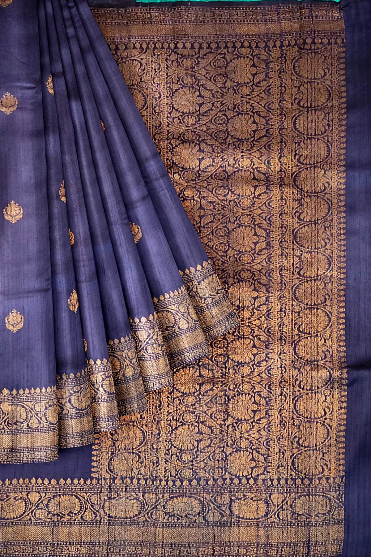 Description : Handloom Banarasi katan pure silk saree in navy blue in dupion finish with floral motifs . Complemented with rich pallu & border in antique zari and contrast blouse in teal.