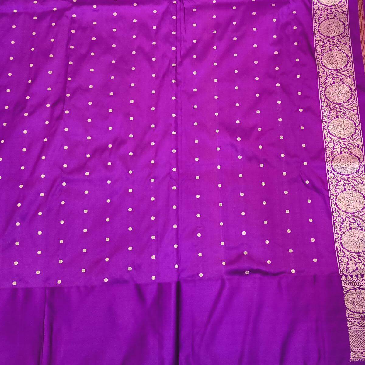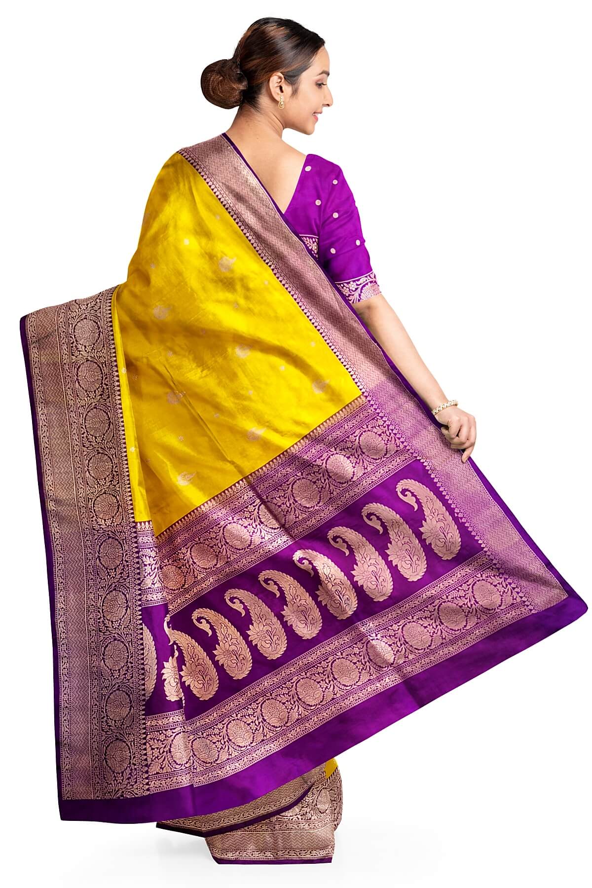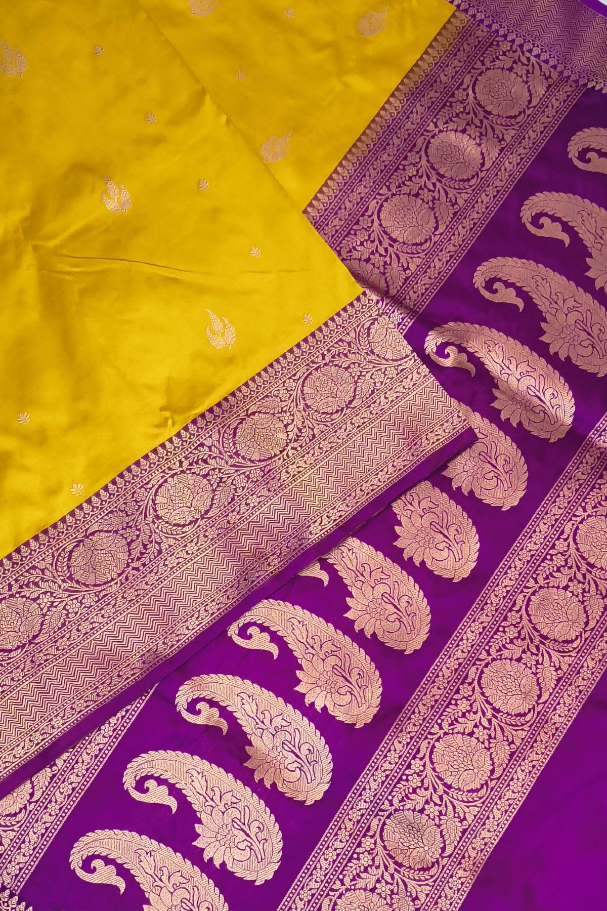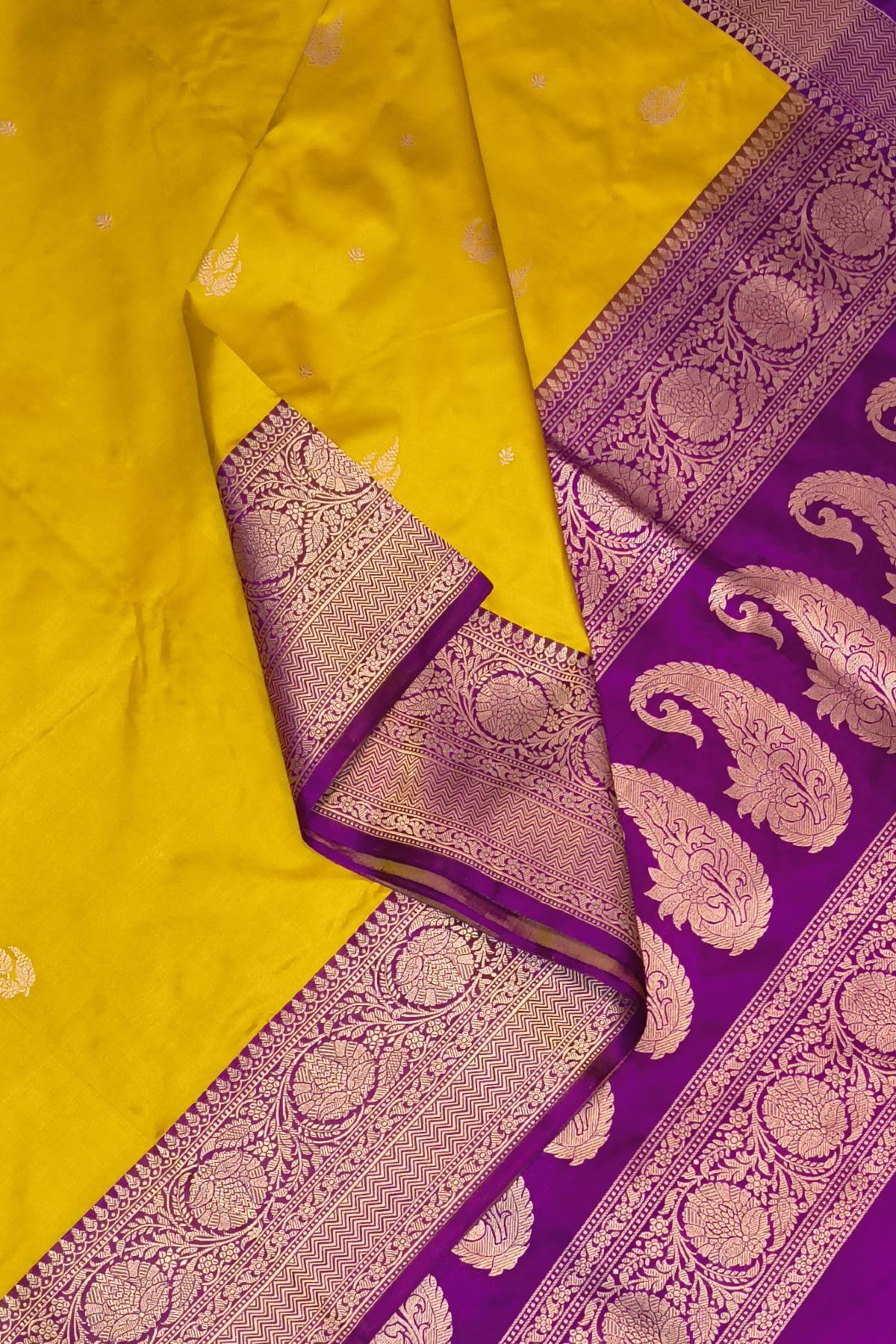 Description : Handloom Banarasi katan pure silk saree in yellow with leaf & floral motifs and a contrast pallu in purple.