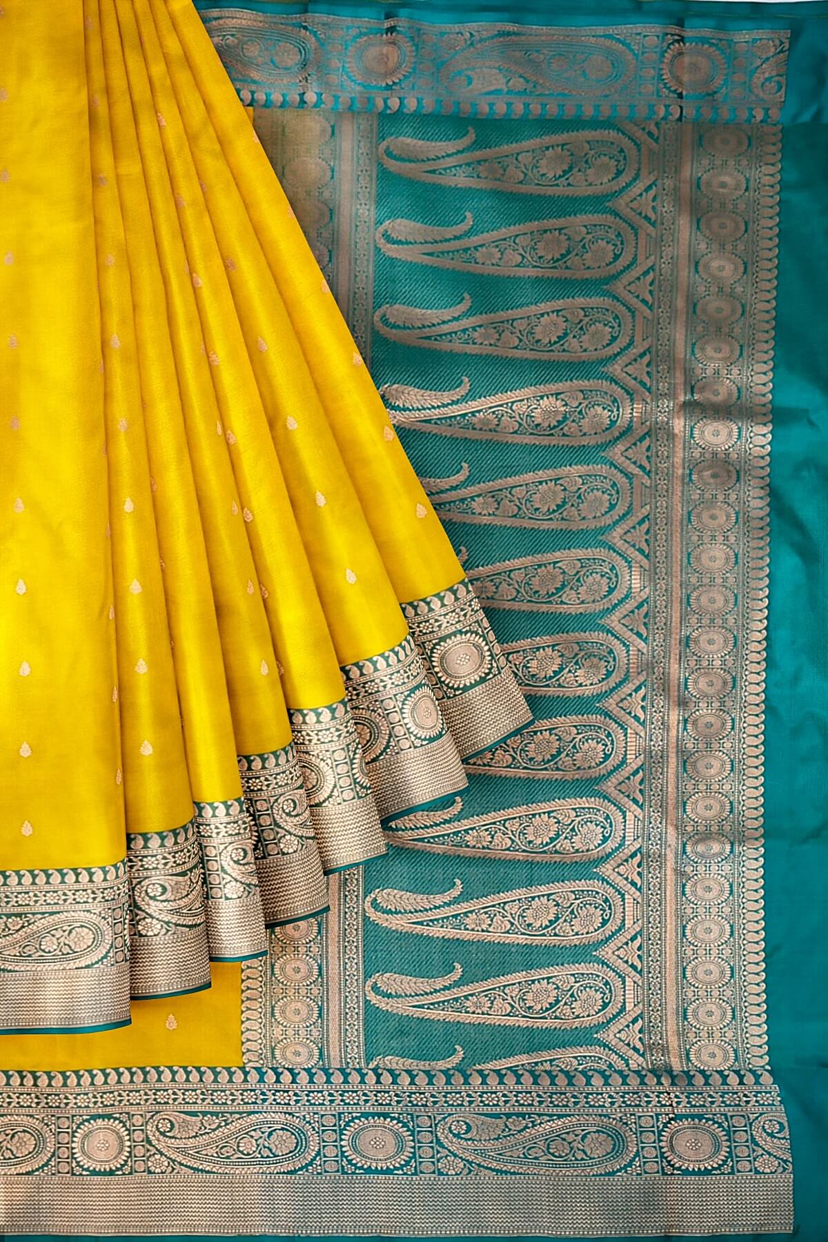 Description : Handloom Banarasi katan pure silk saree in yellow with small motifs and a contrast pallu in teal