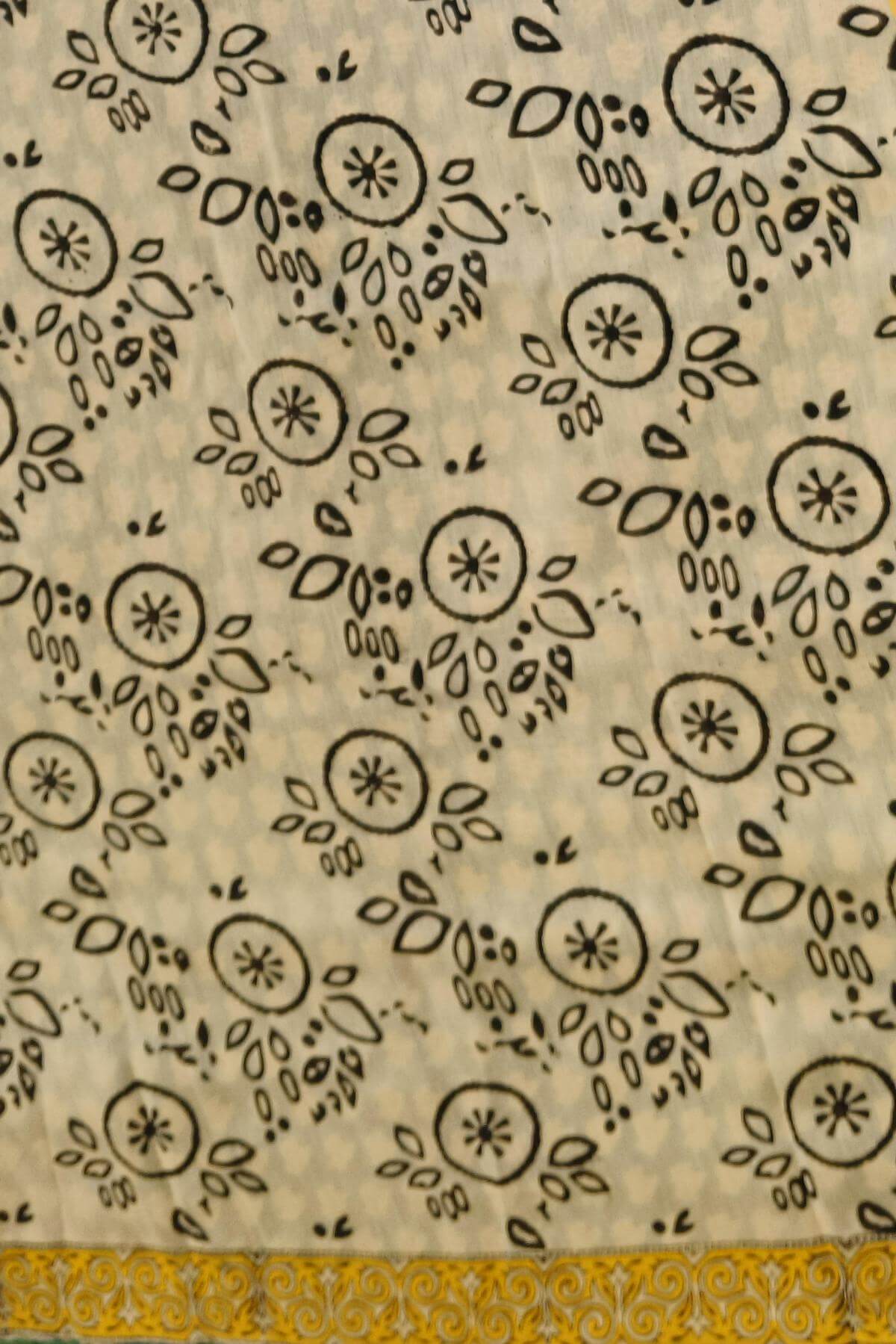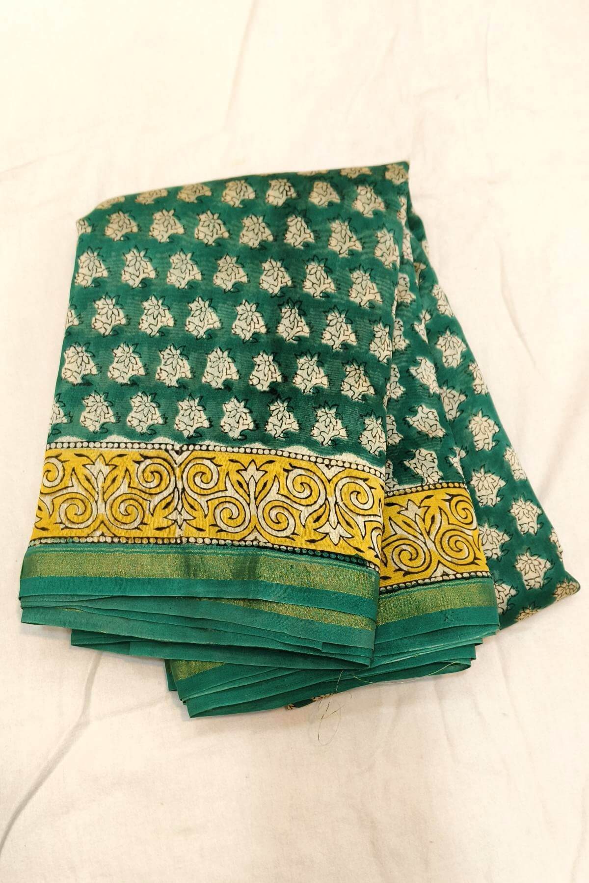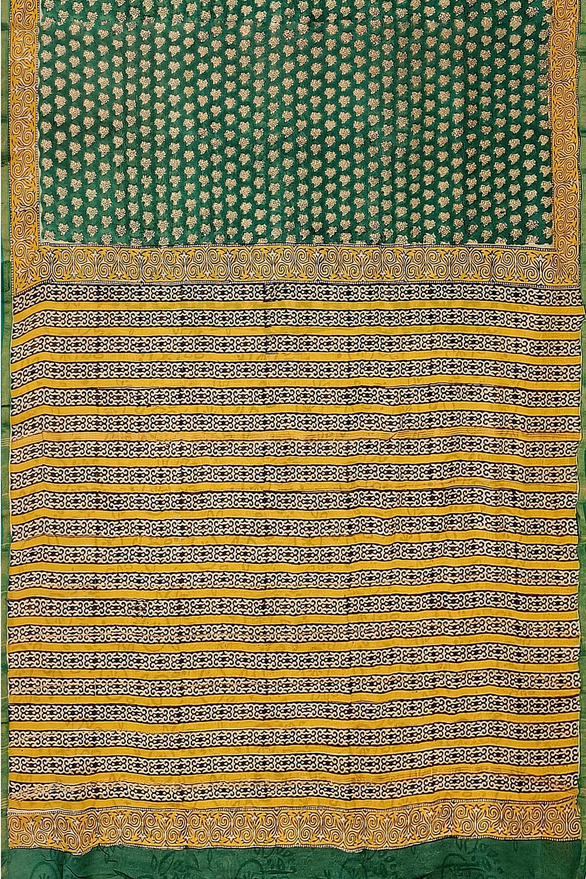 Description : Bagru hand block print on Chanderi silk cotton saree in green & mustard in floral pattern