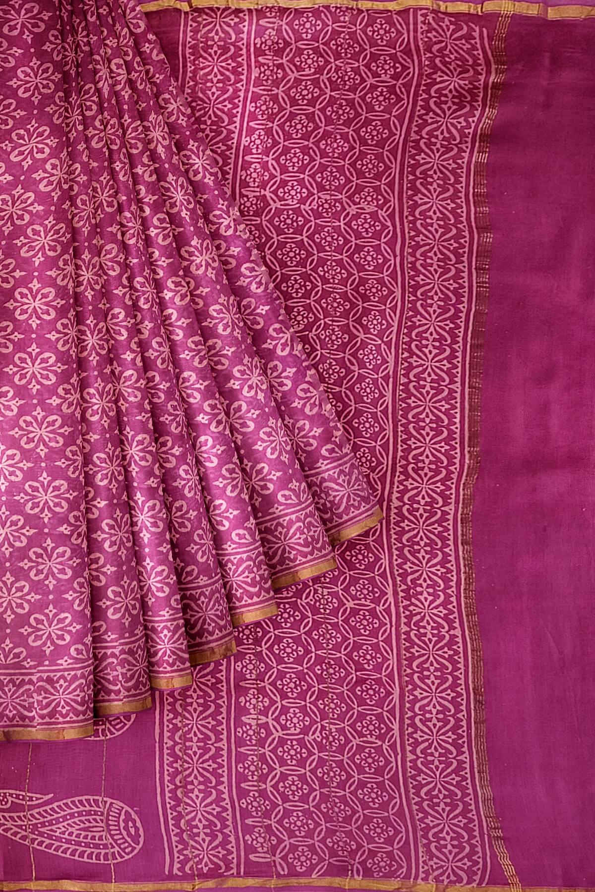 Description : Bagru hand block print on Chanderi silk cotton saree in purple in floral pattern