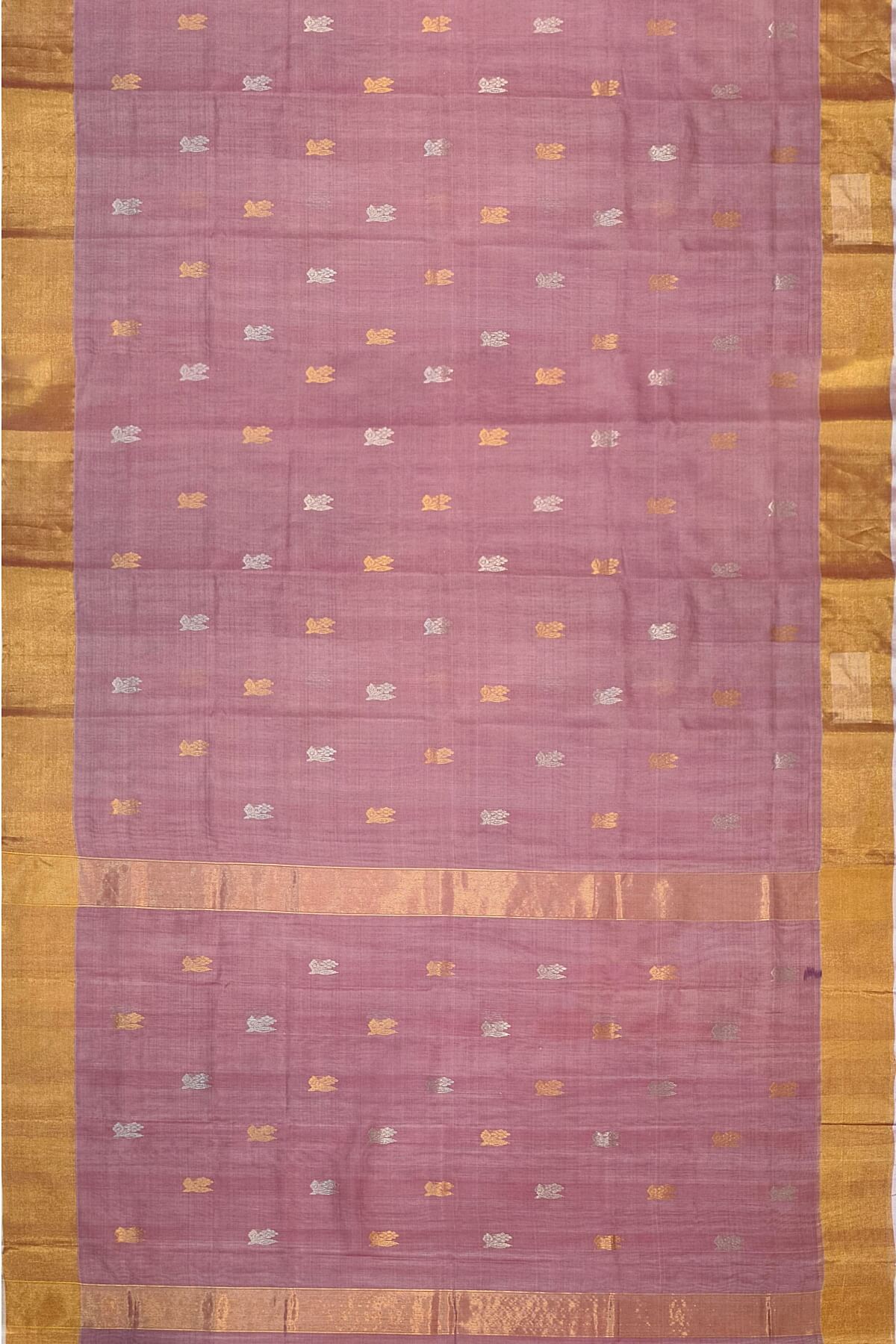 Description : Chanderi silk cotton saree in onion pink with gold & silver motifs and a 4 inch border