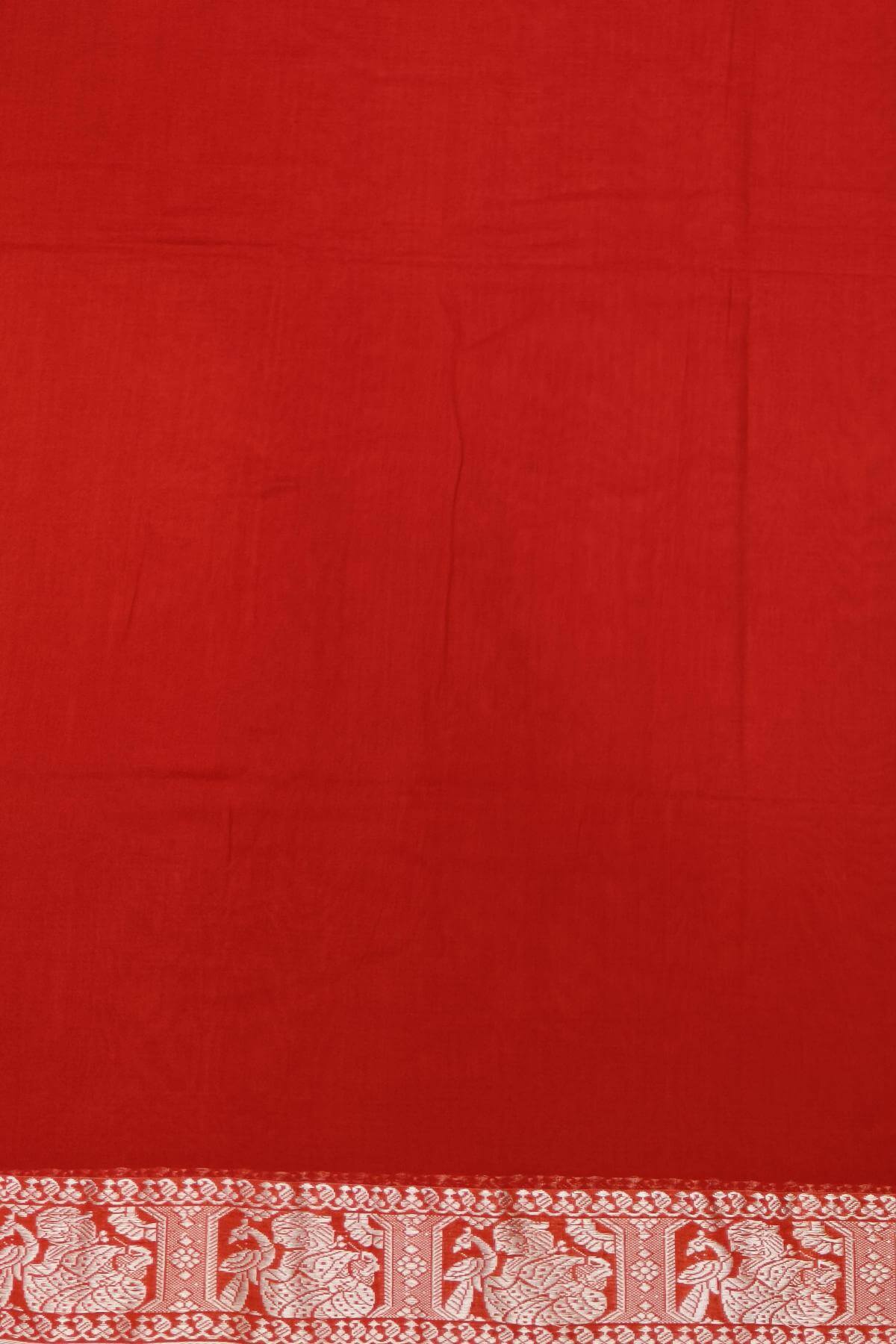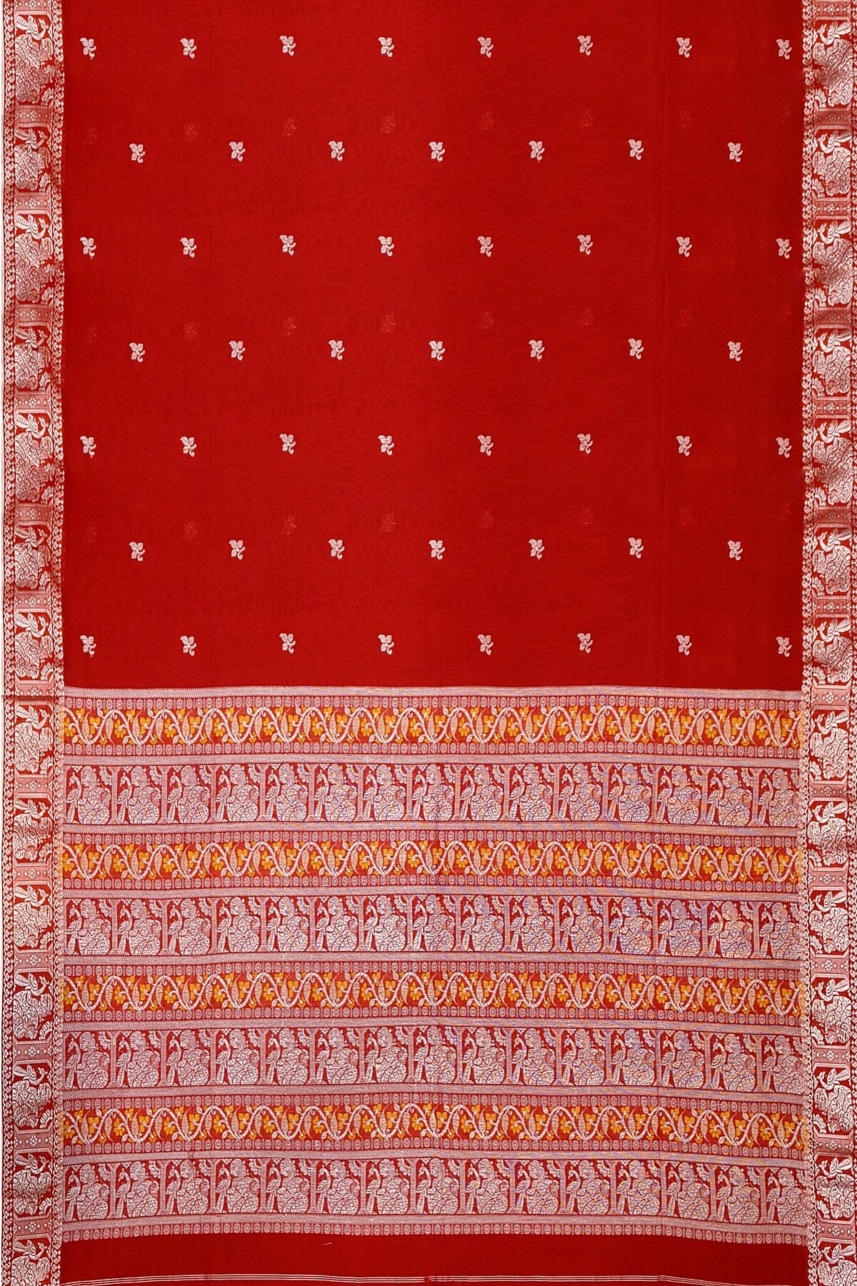 Description : Baluchari cotton saree in red with small floral motifs and thread worked pallu & border