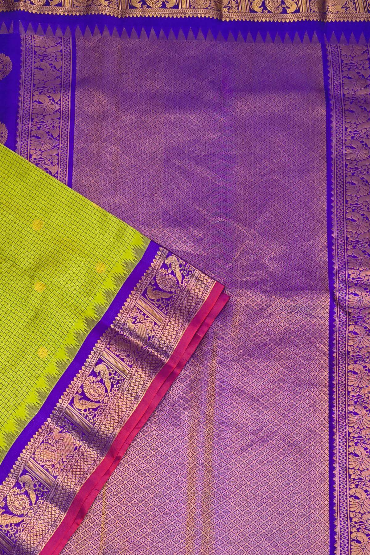 Description : Gadwal pure silk saree in radium green & purple with checks & buttis. This is enhanced with a rich pallu and a temple border.