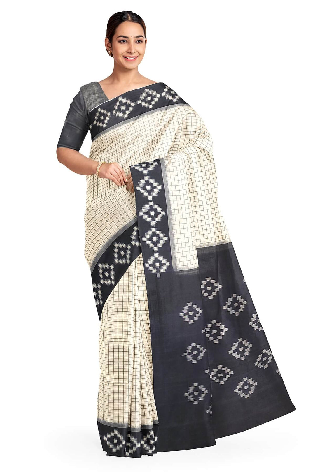 Handwoven double ikkat pure cotton saree in off white in fine checks