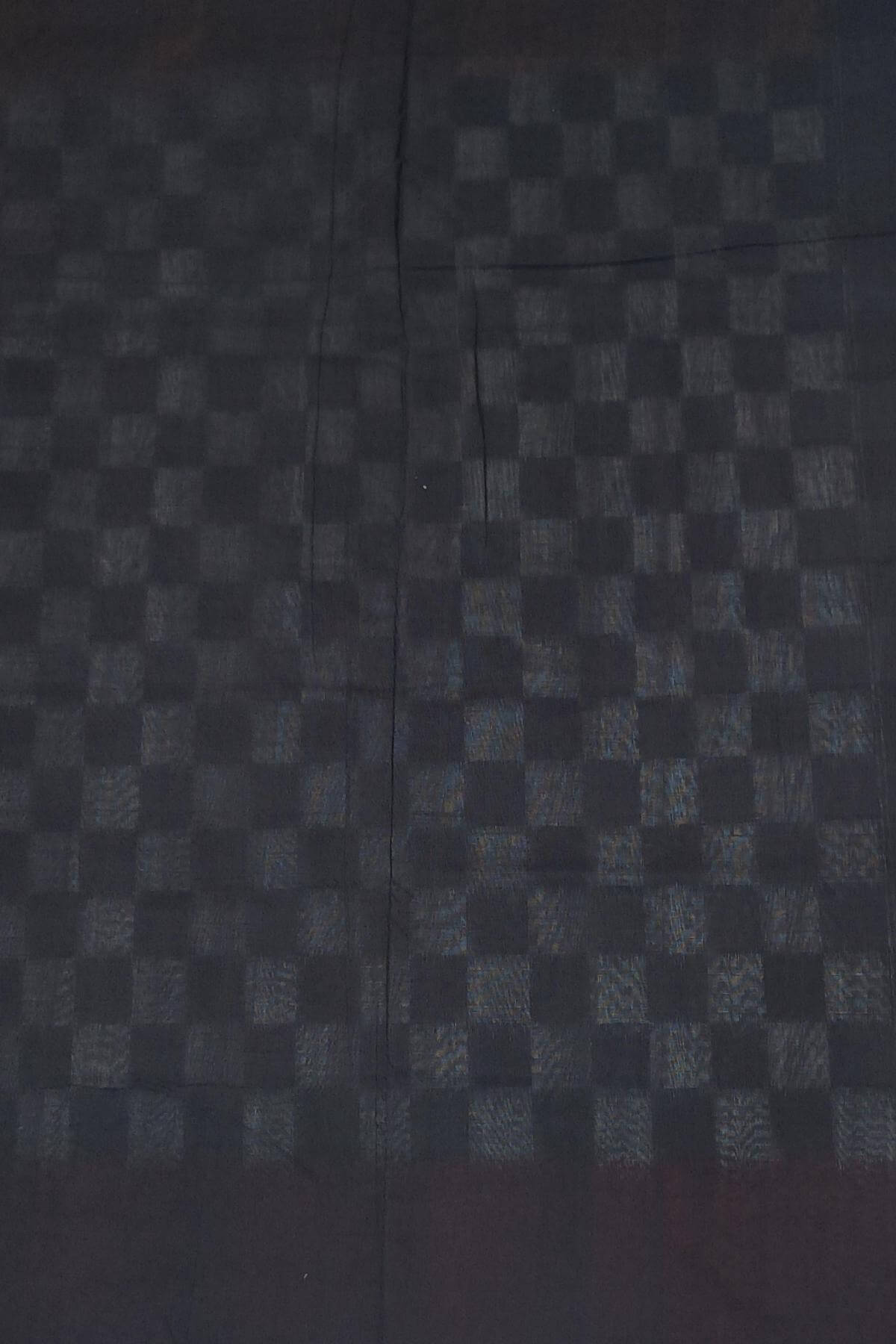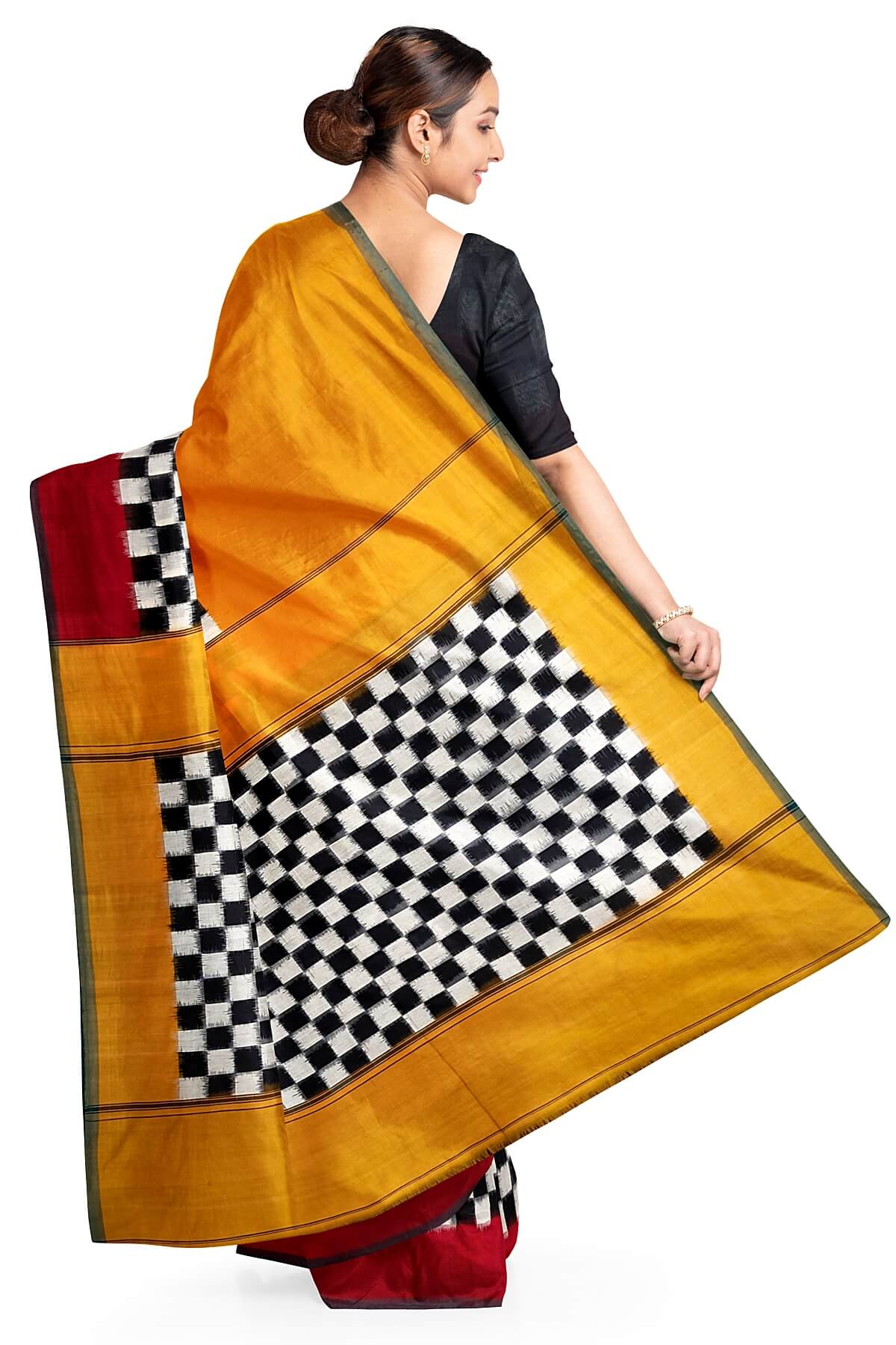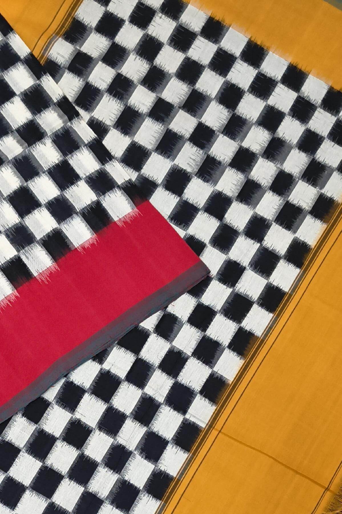 Description: Handwoven double ikkat pure cotton saree in mustard and black & white checks. This has a Ganga Jamuna border.