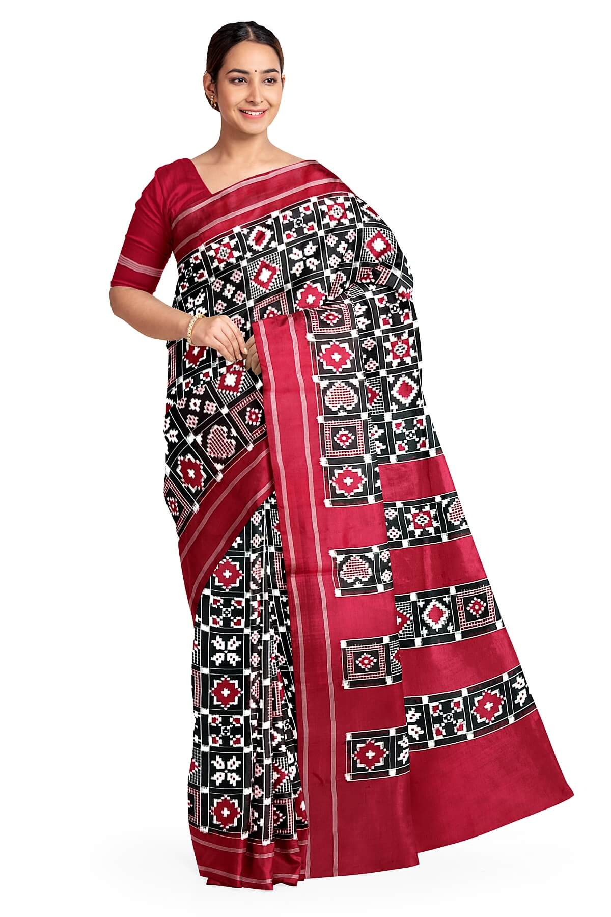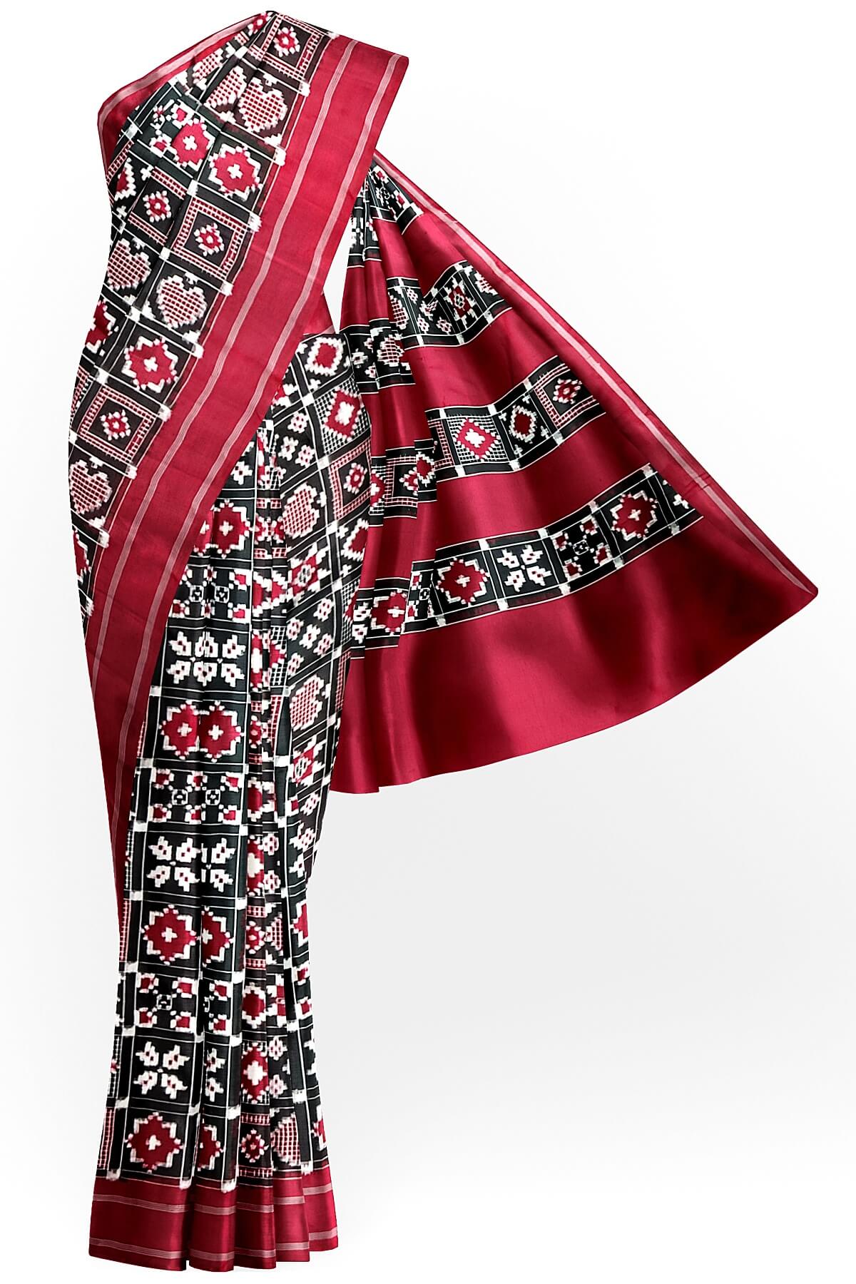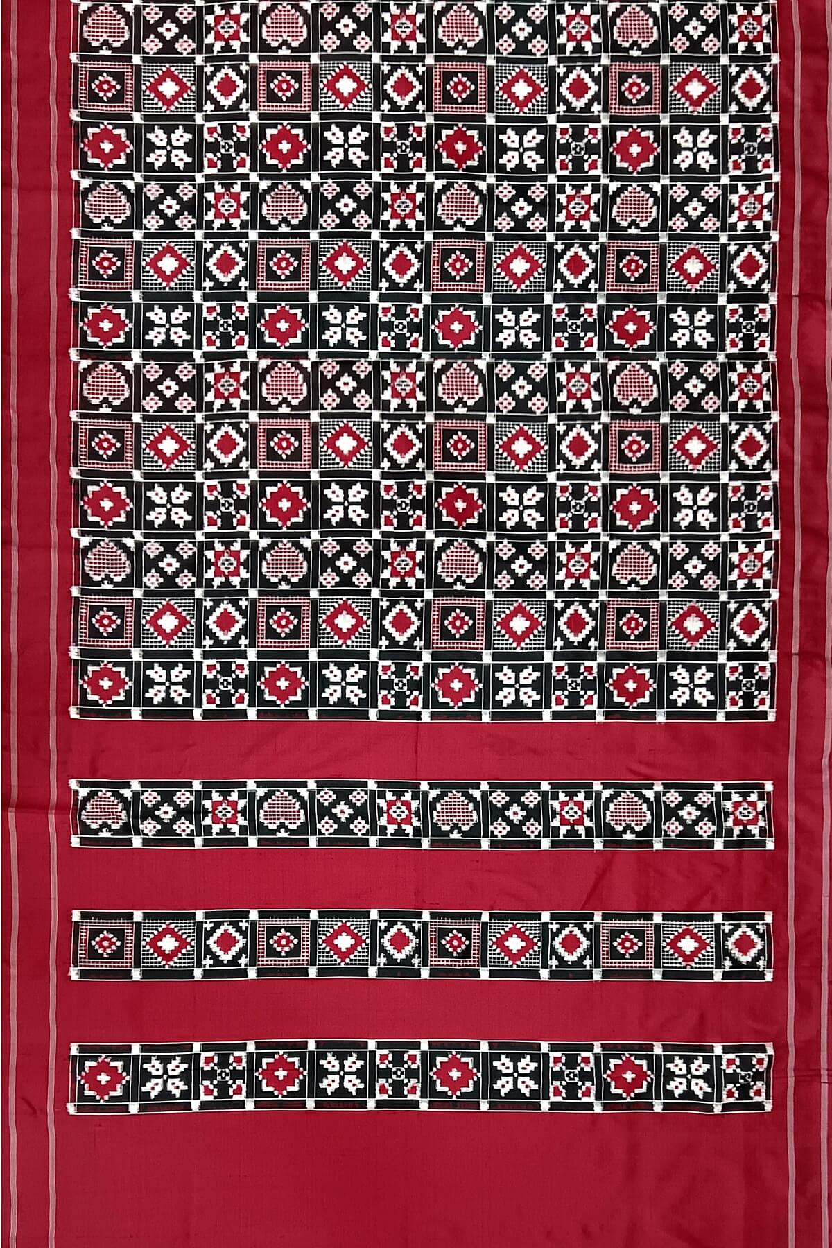 Description: Gorgeous handwoven double Ikat telia pure silk saree in black in 9 motifs pattern.