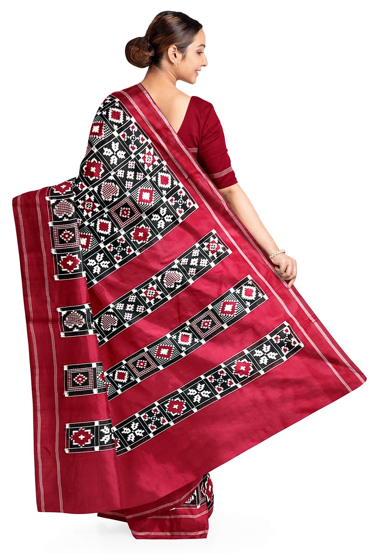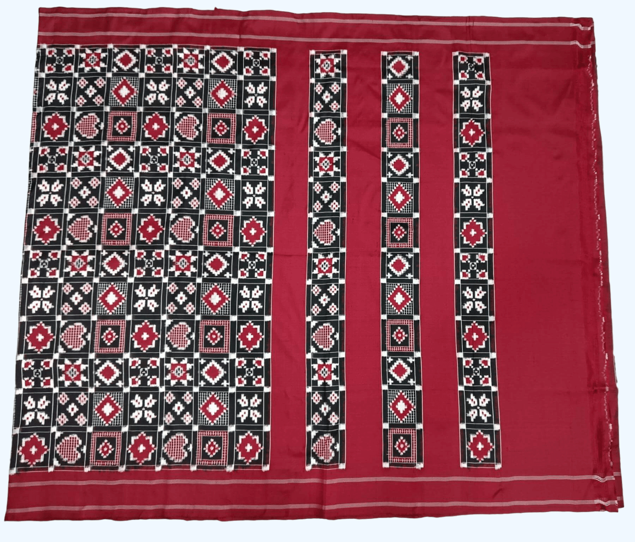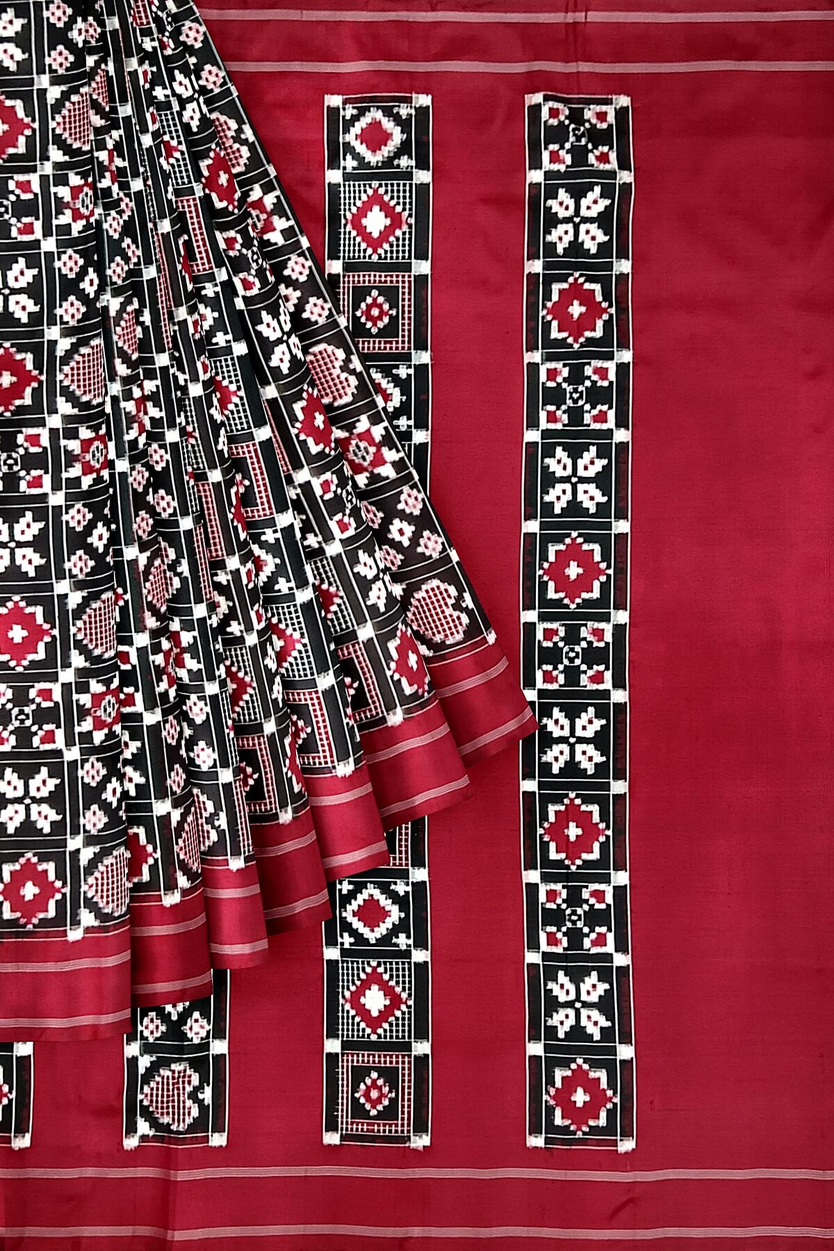 Description: Gorgeous handwoven double Ikat telia pure silk saree in black in 9 motifs pattern.
