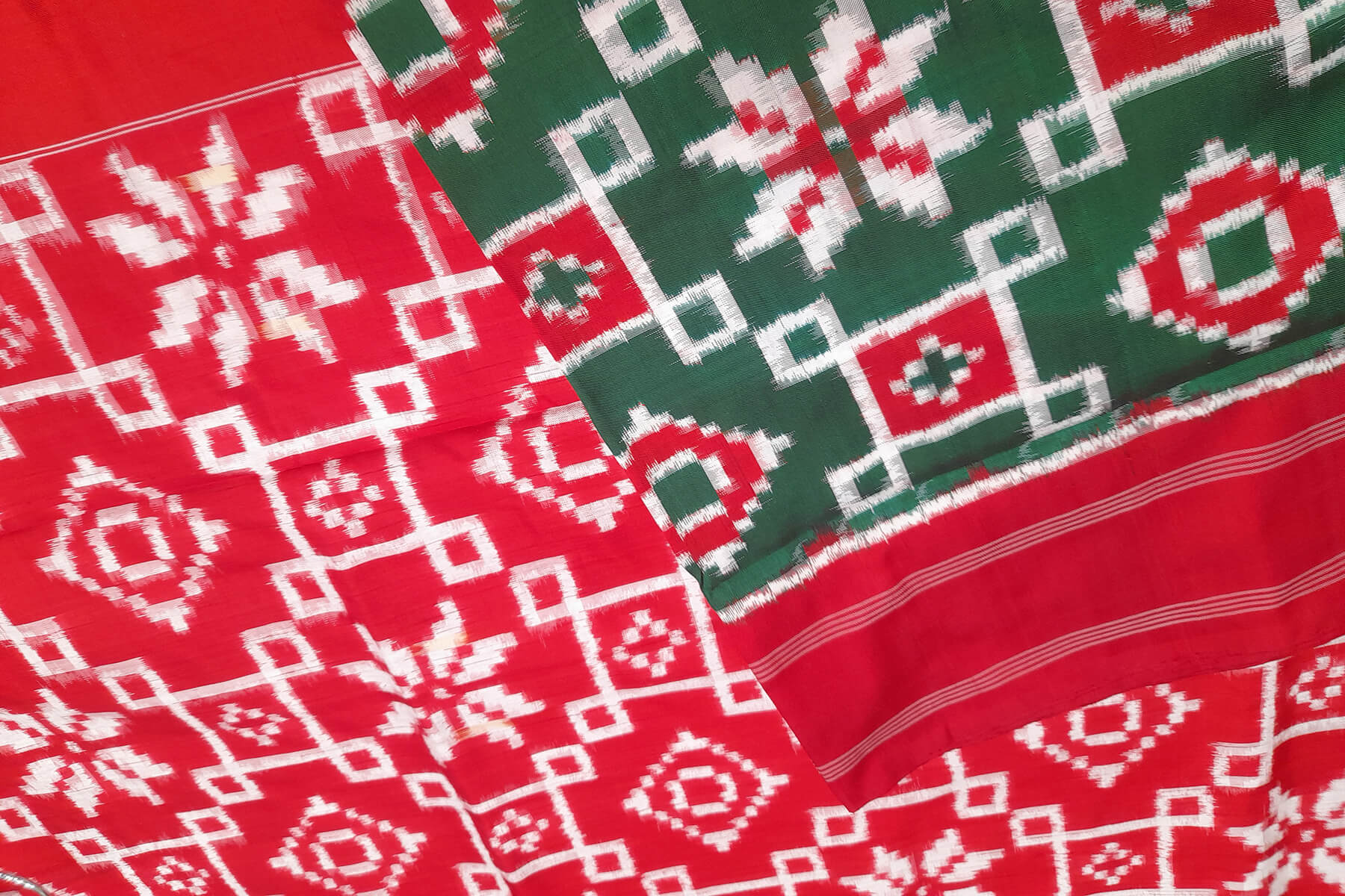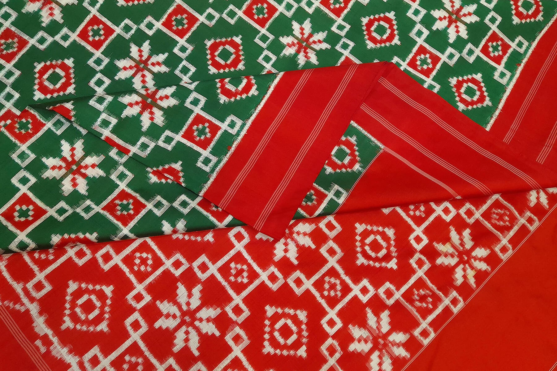 Description: Handwoven double Ikat telia pure silk saree in green with floral motifs on the body & pallu and a plain silk border in red.