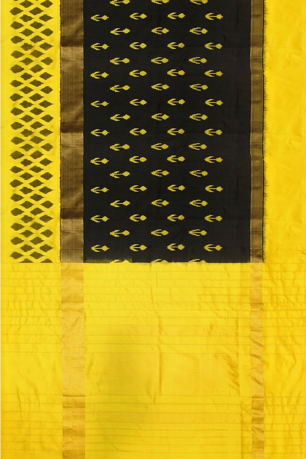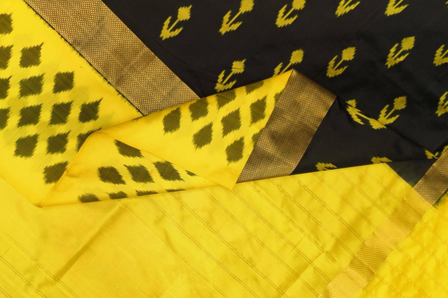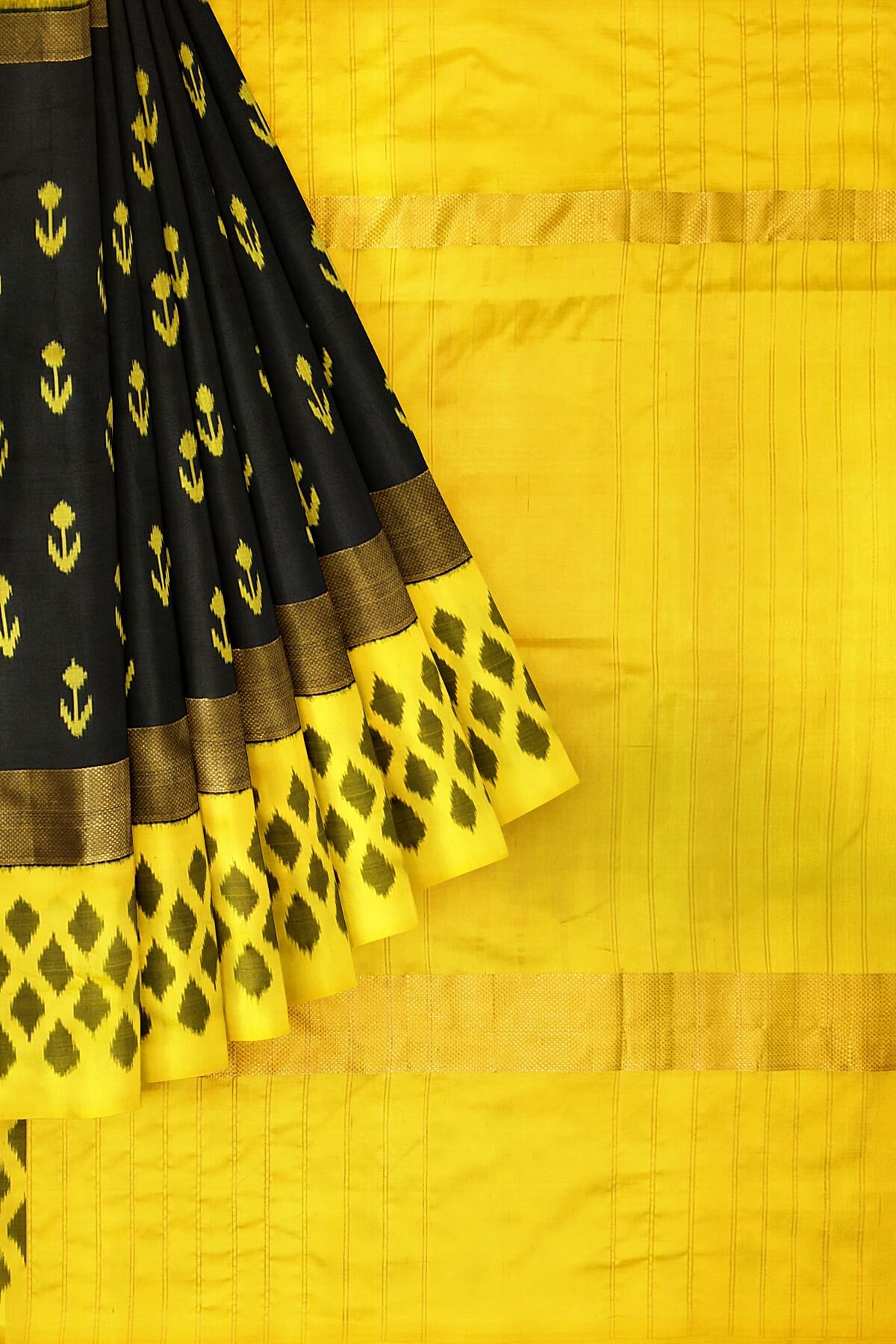 Description : Handwoven ikat pure silk saree in black with anchor motifs all over the body and a contrast pallu in yellow.