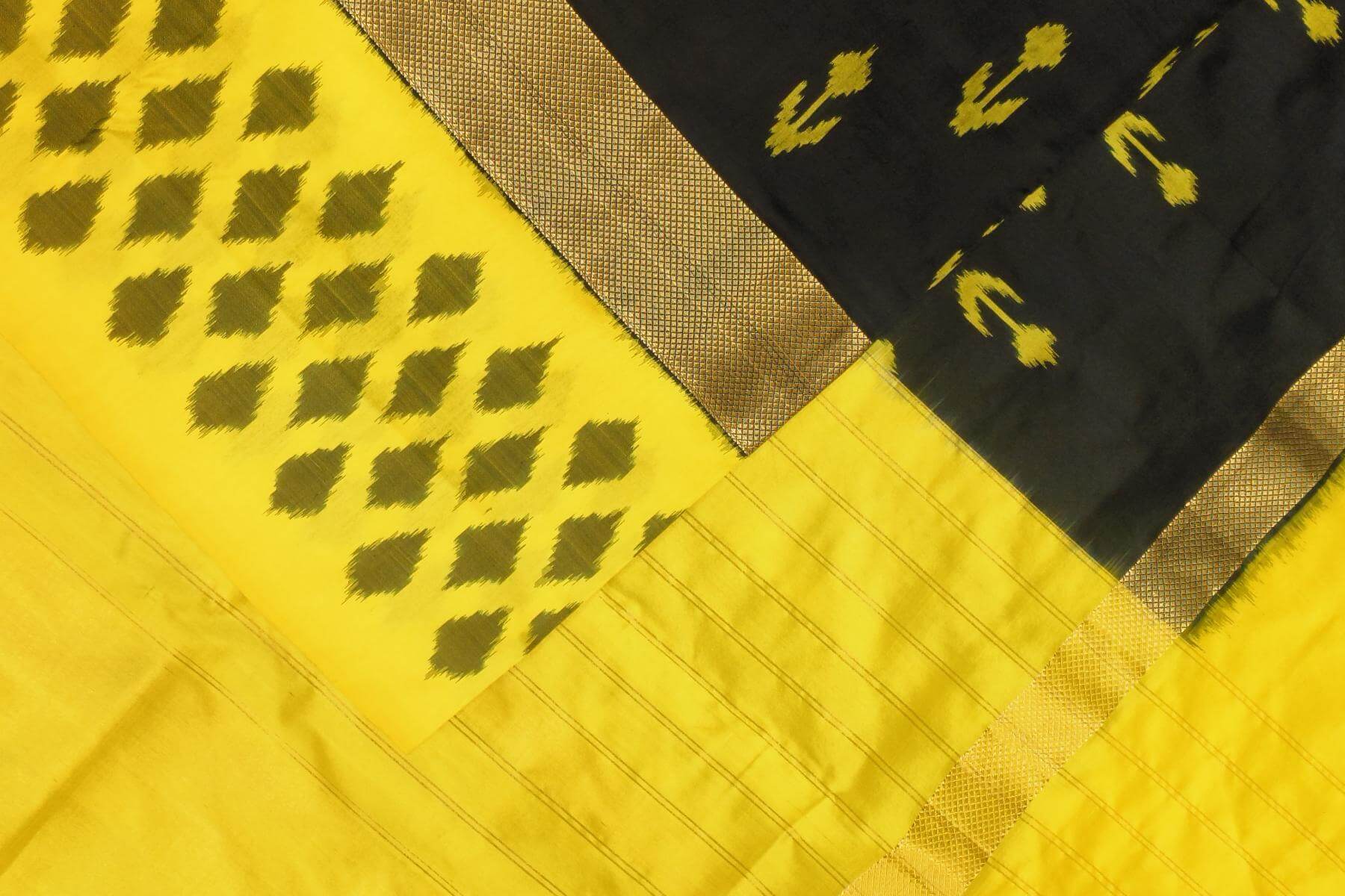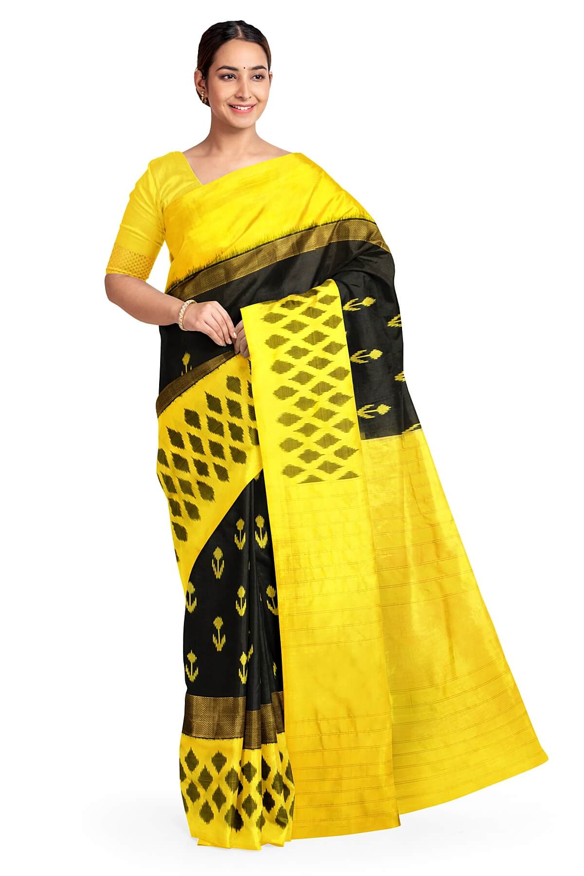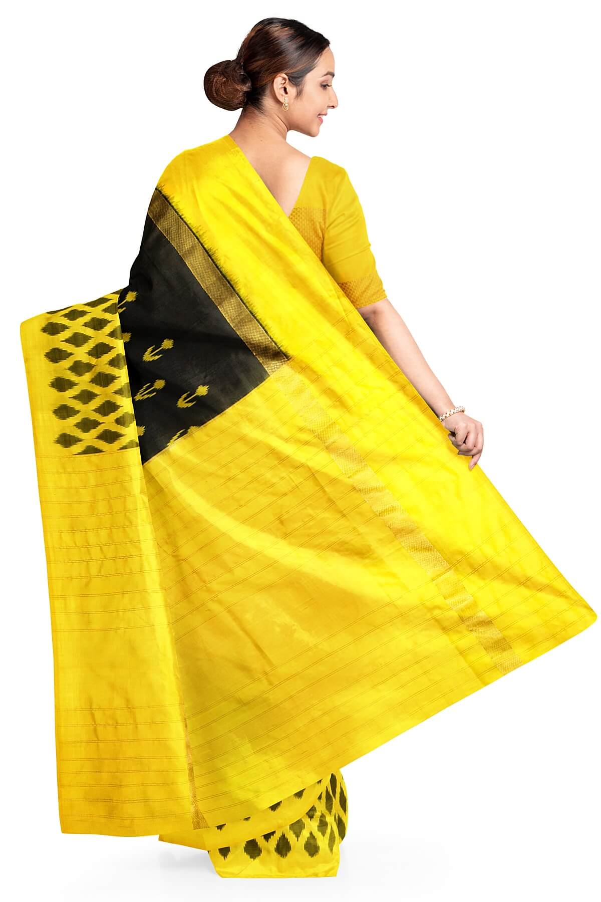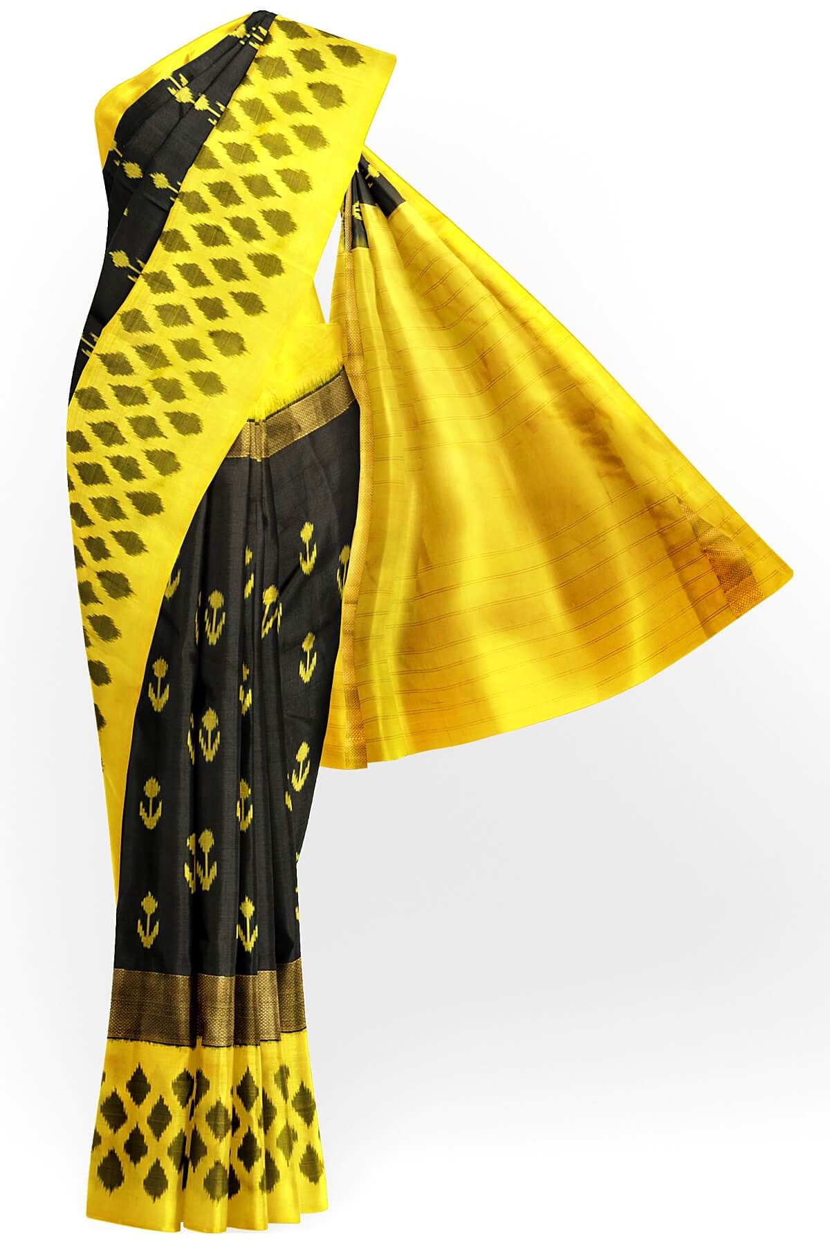 Description : Handwoven ikat pure silk saree in black with anchor motifs all over the body and a contrast pallu in yellow.