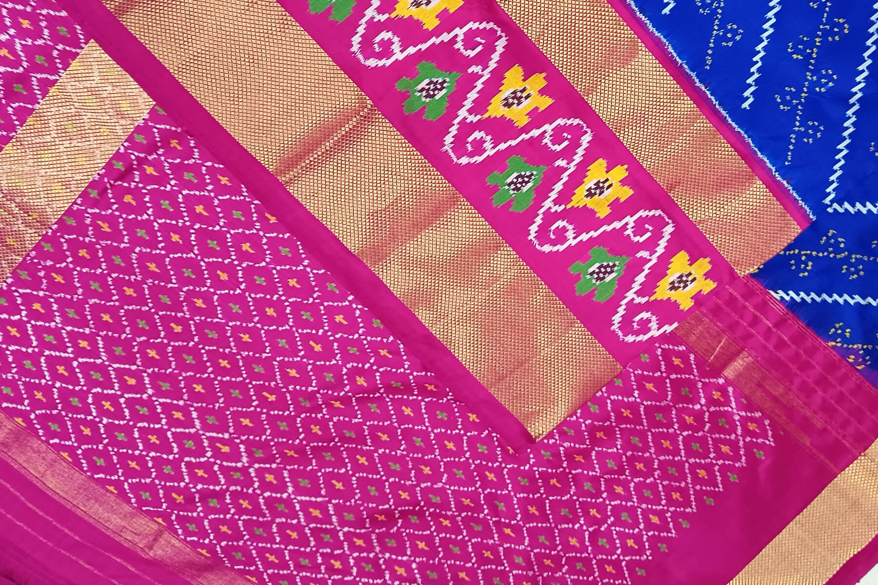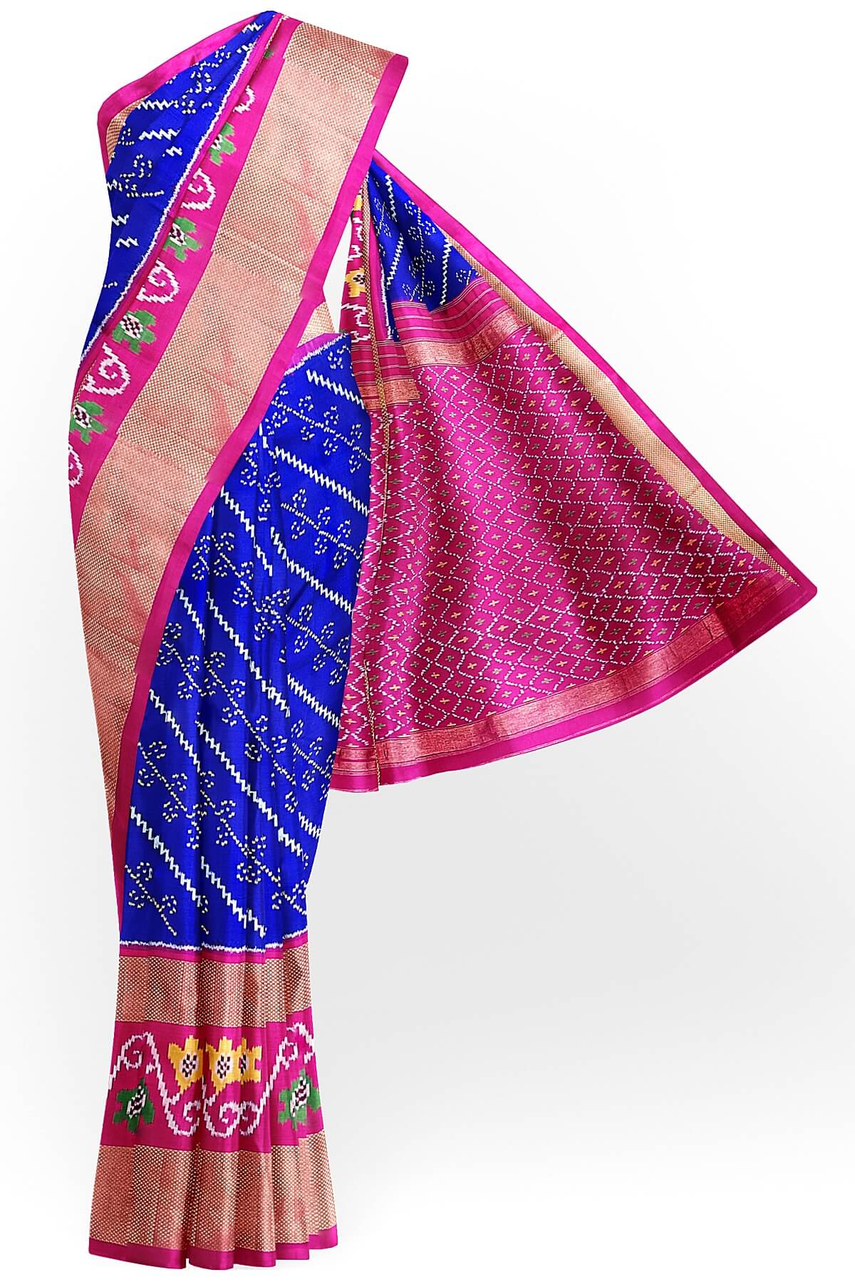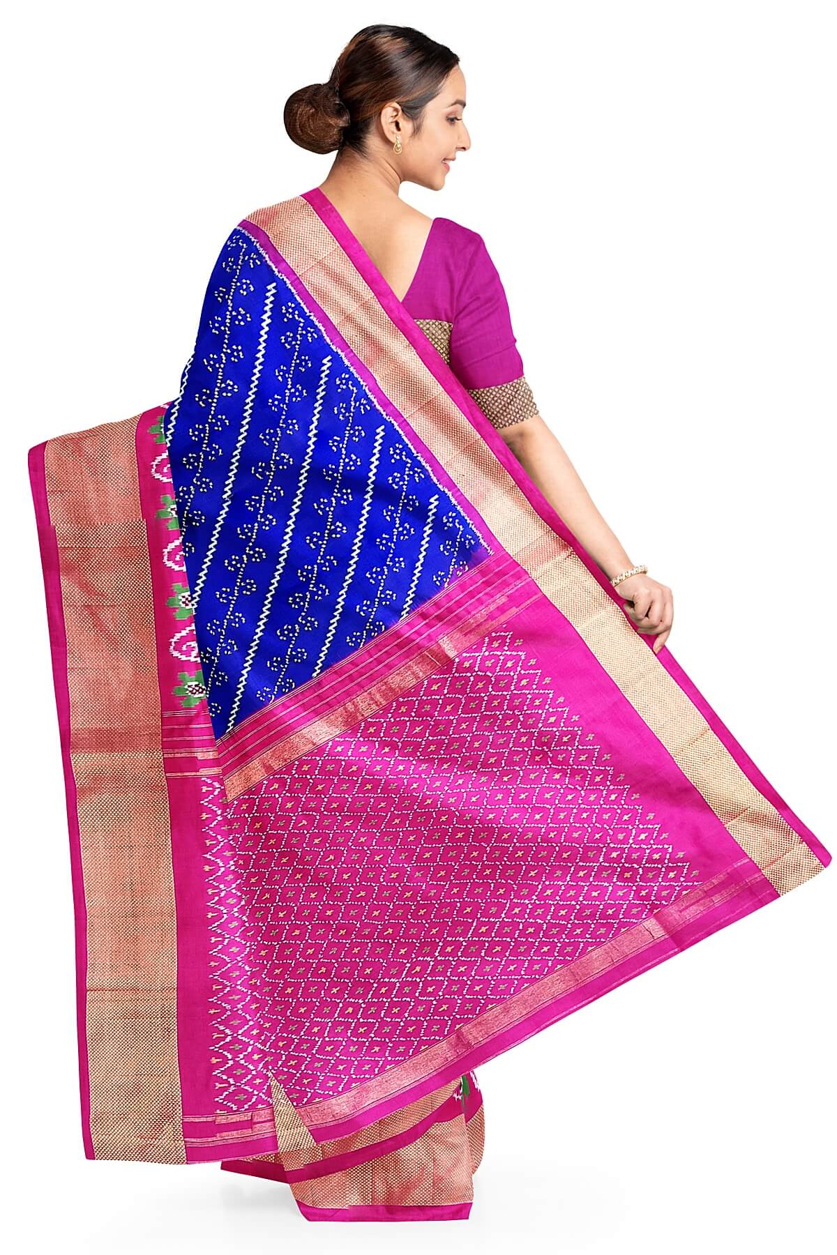 Description: Handwoven Ikat pure silk saree in blue with diagonal lines and floral motifs in skirt border. The contrast pallu in pink and a double zari border.