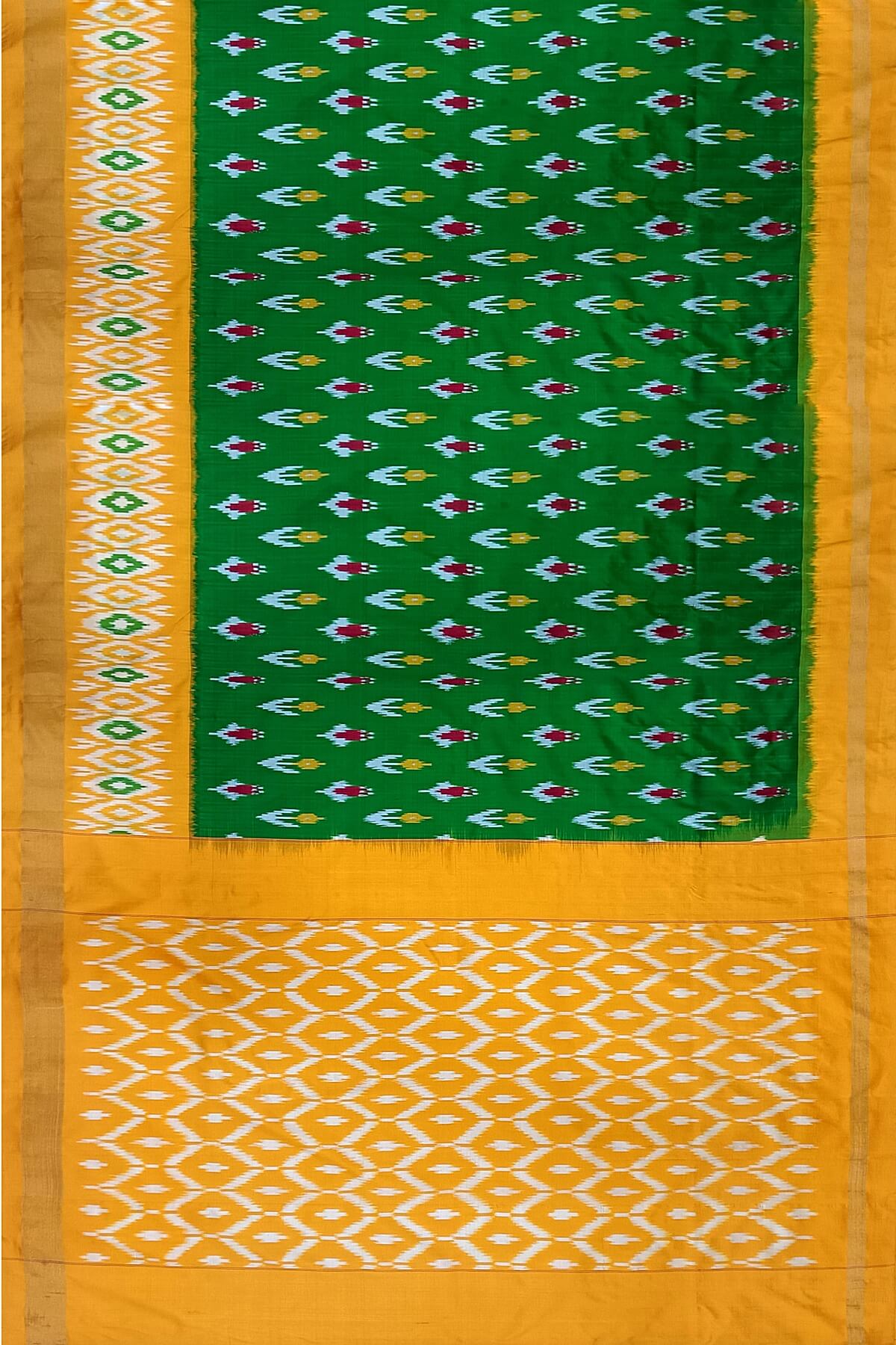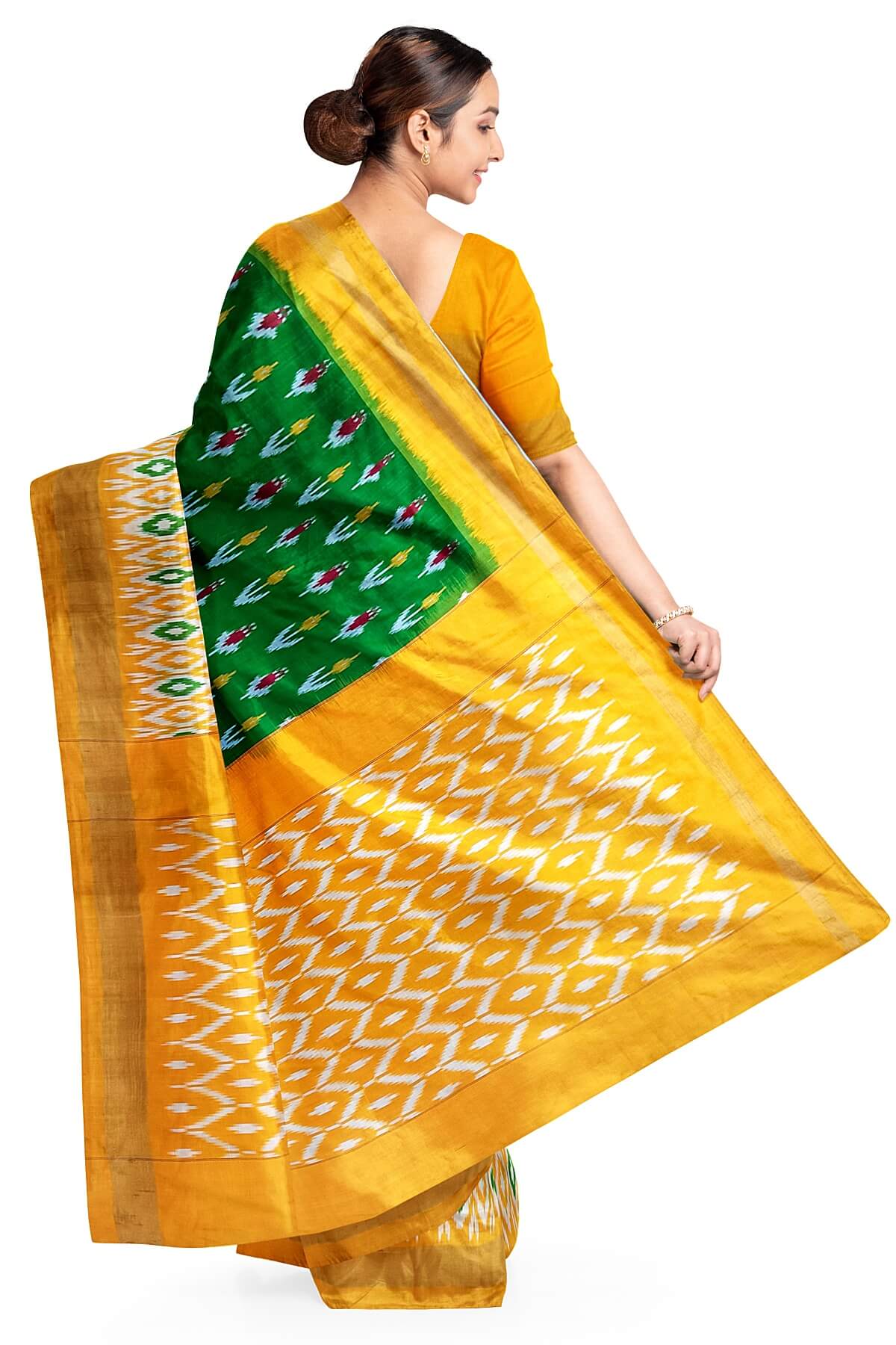 Description : Handwoven ikat pure silk saree in green with anchor motifs on the body and a skirt border