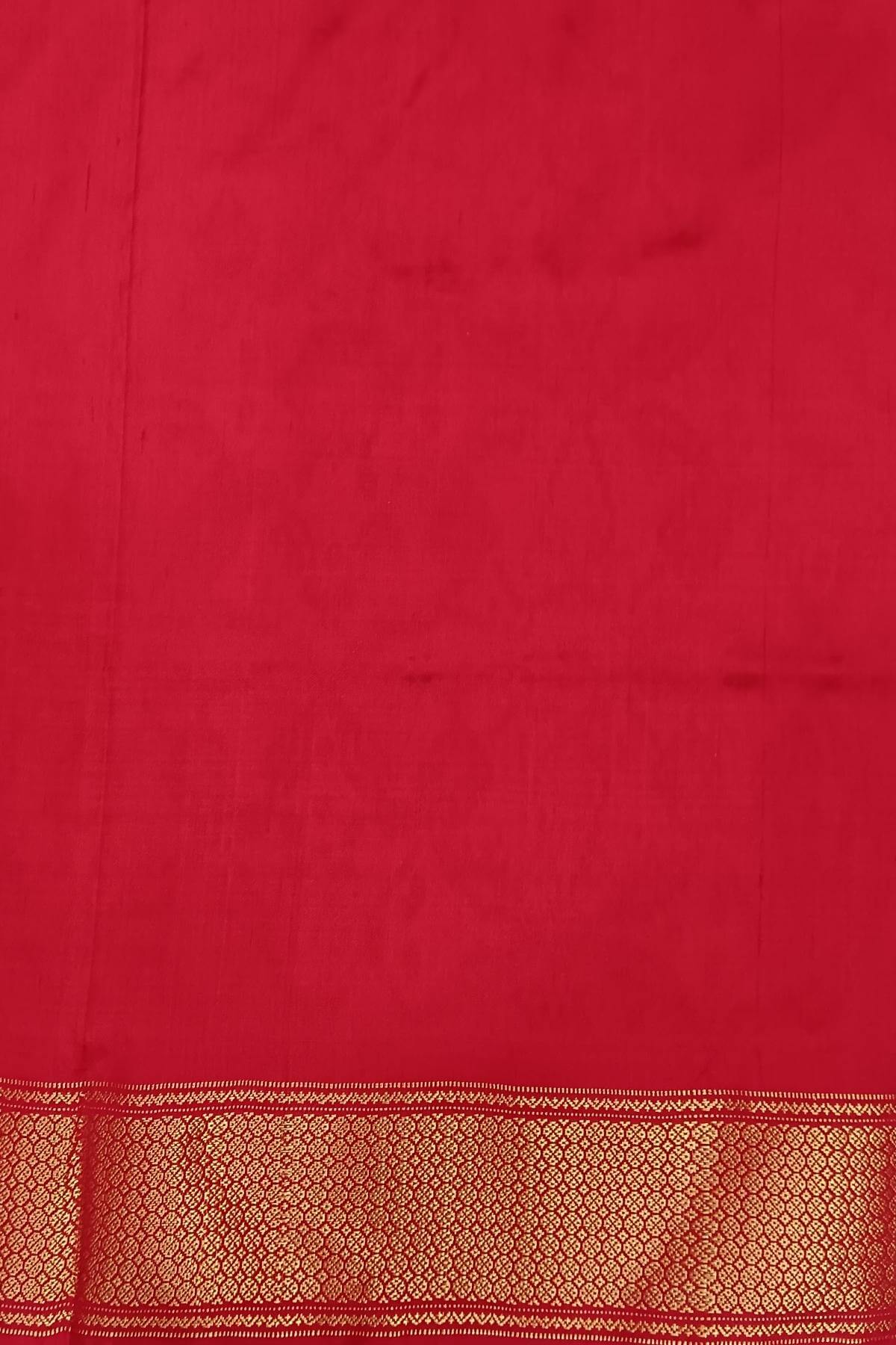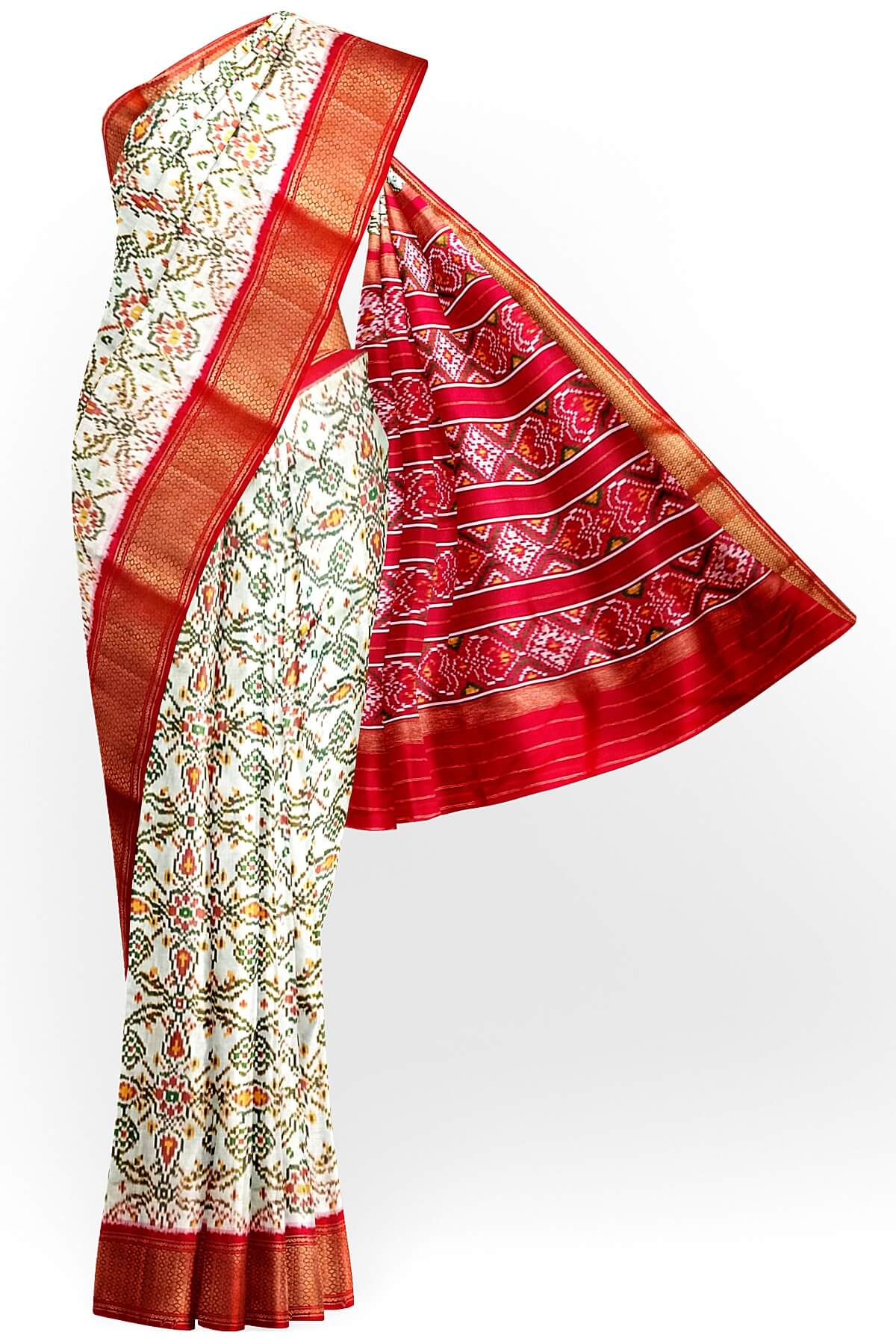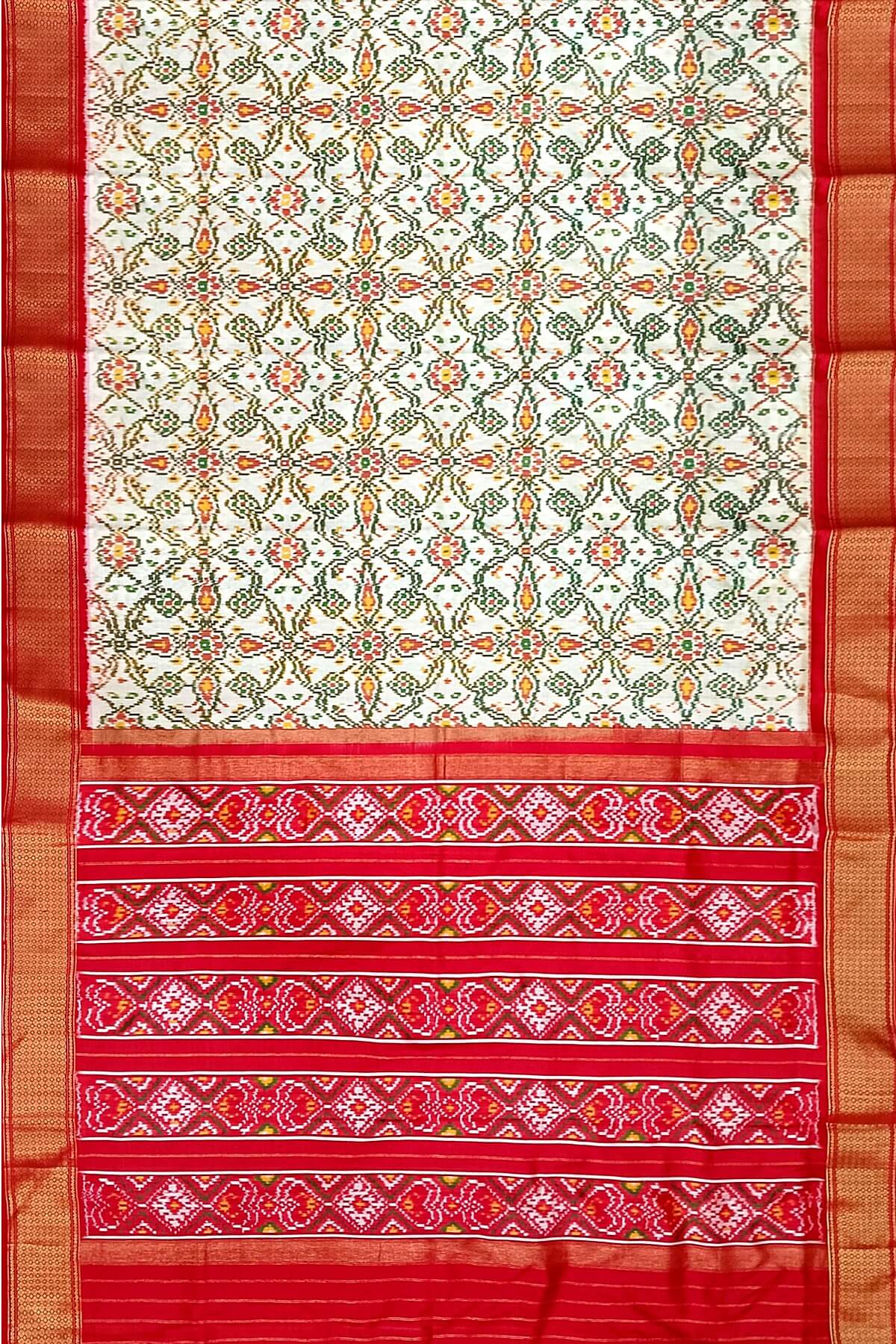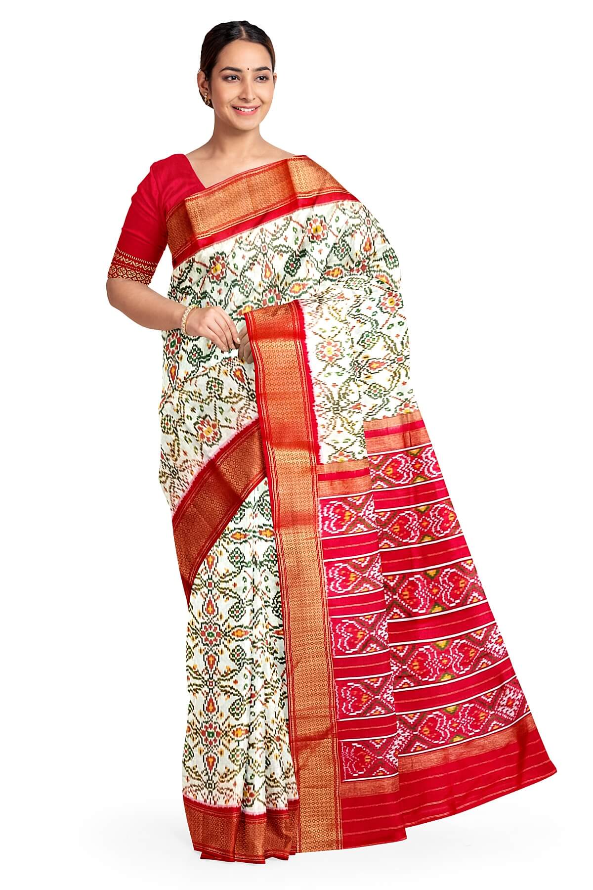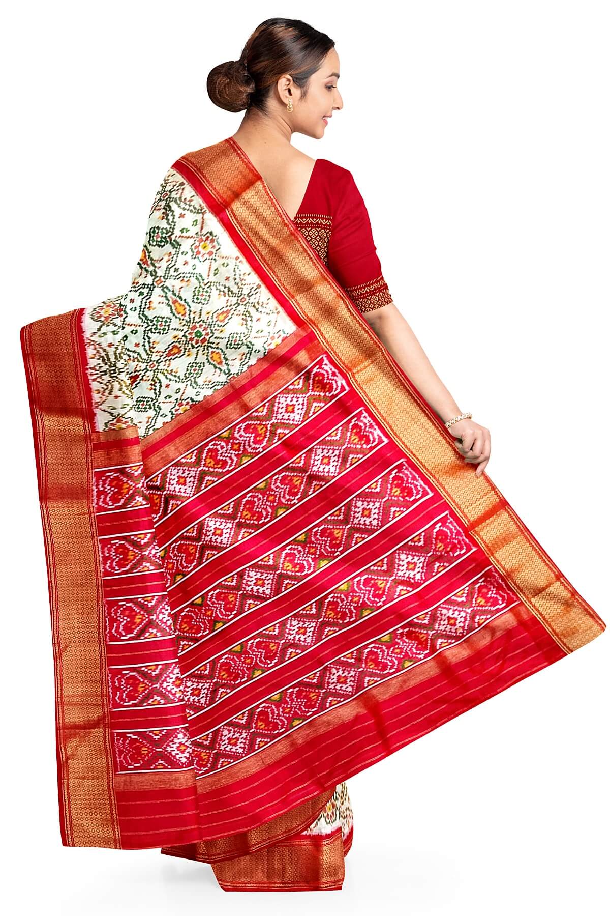 Description : Handwoven ikat pure silk saree in off white in pan bhat pattern and a contrast pallu in red