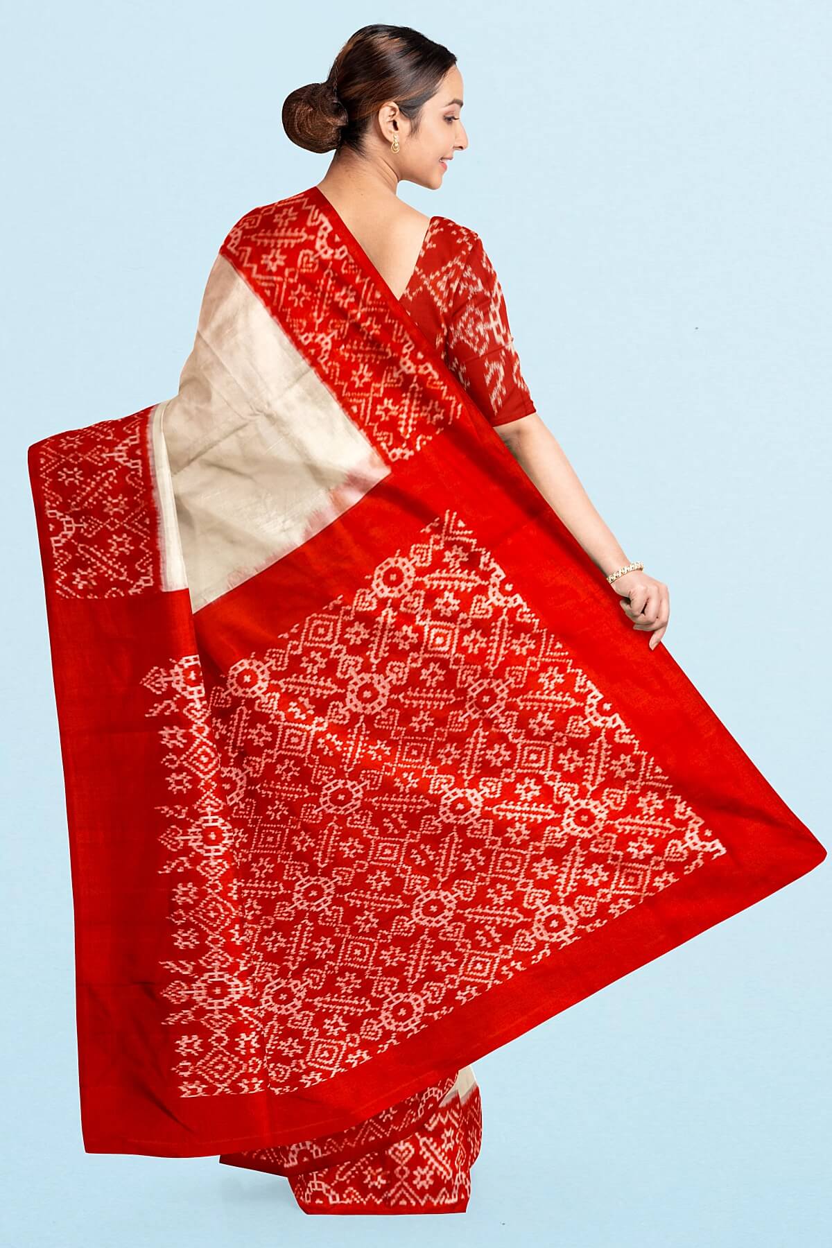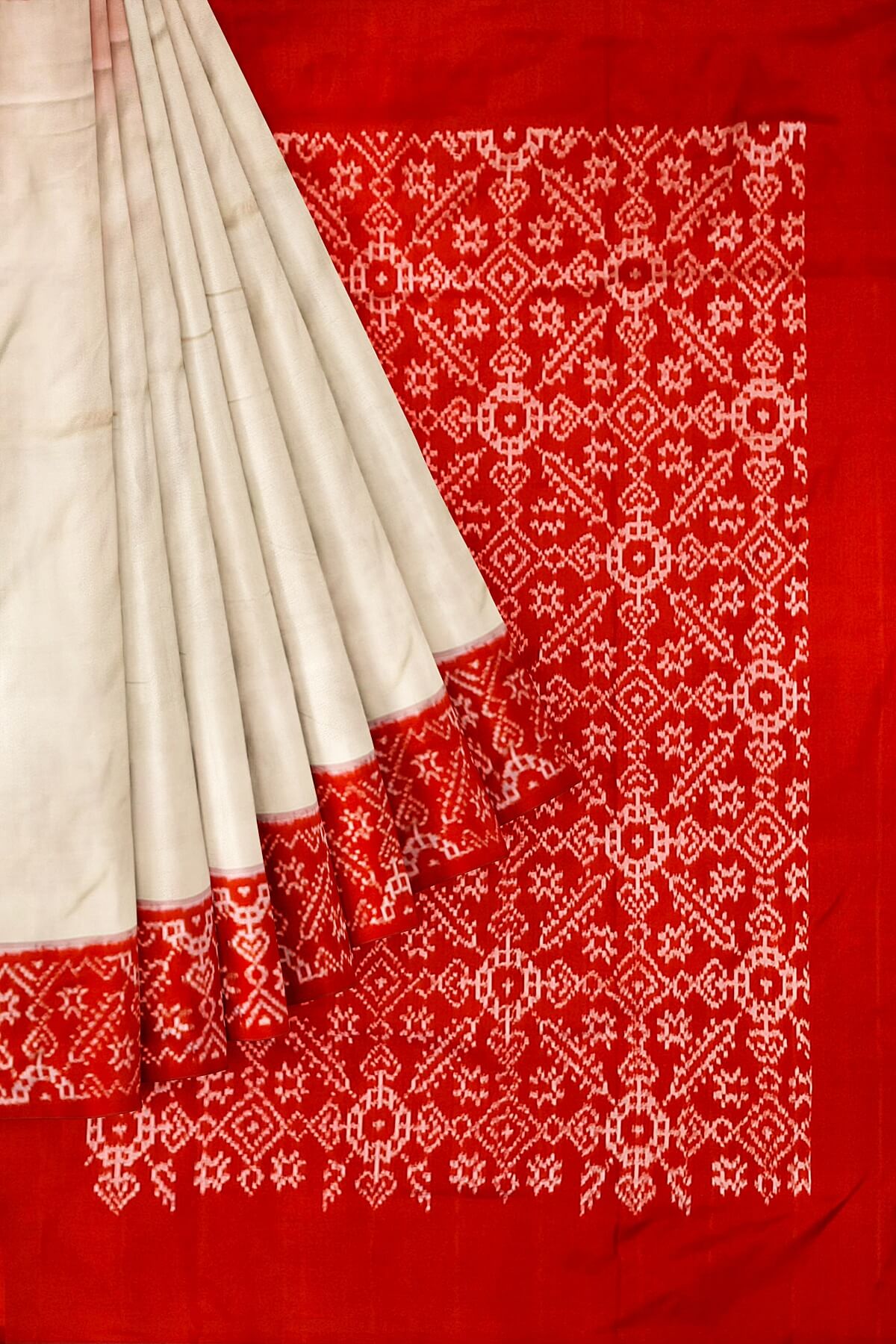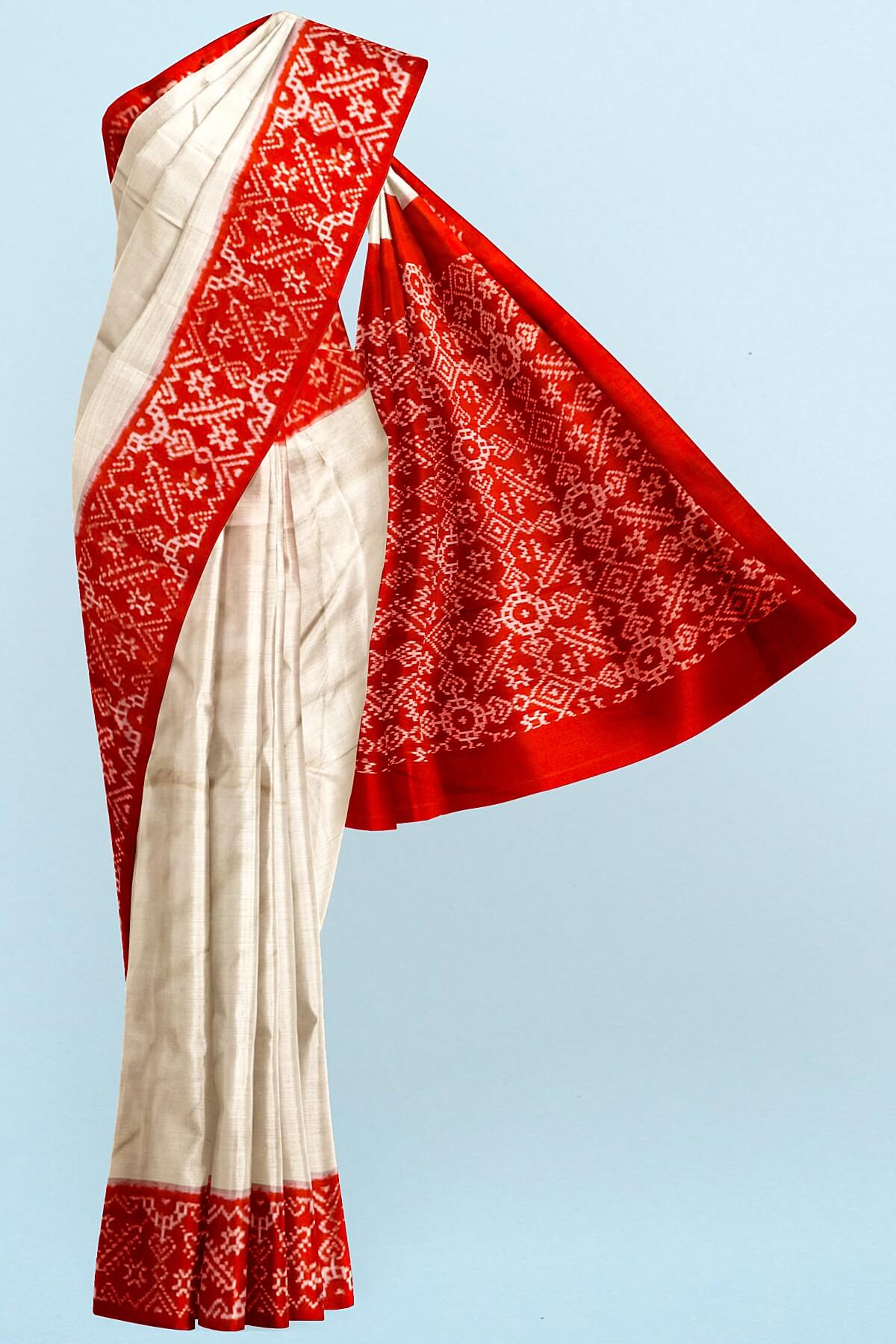 Description: Handwoven Ikat pure silk saree in off white & red with pan bhat pattern in borders , pallu and blouse