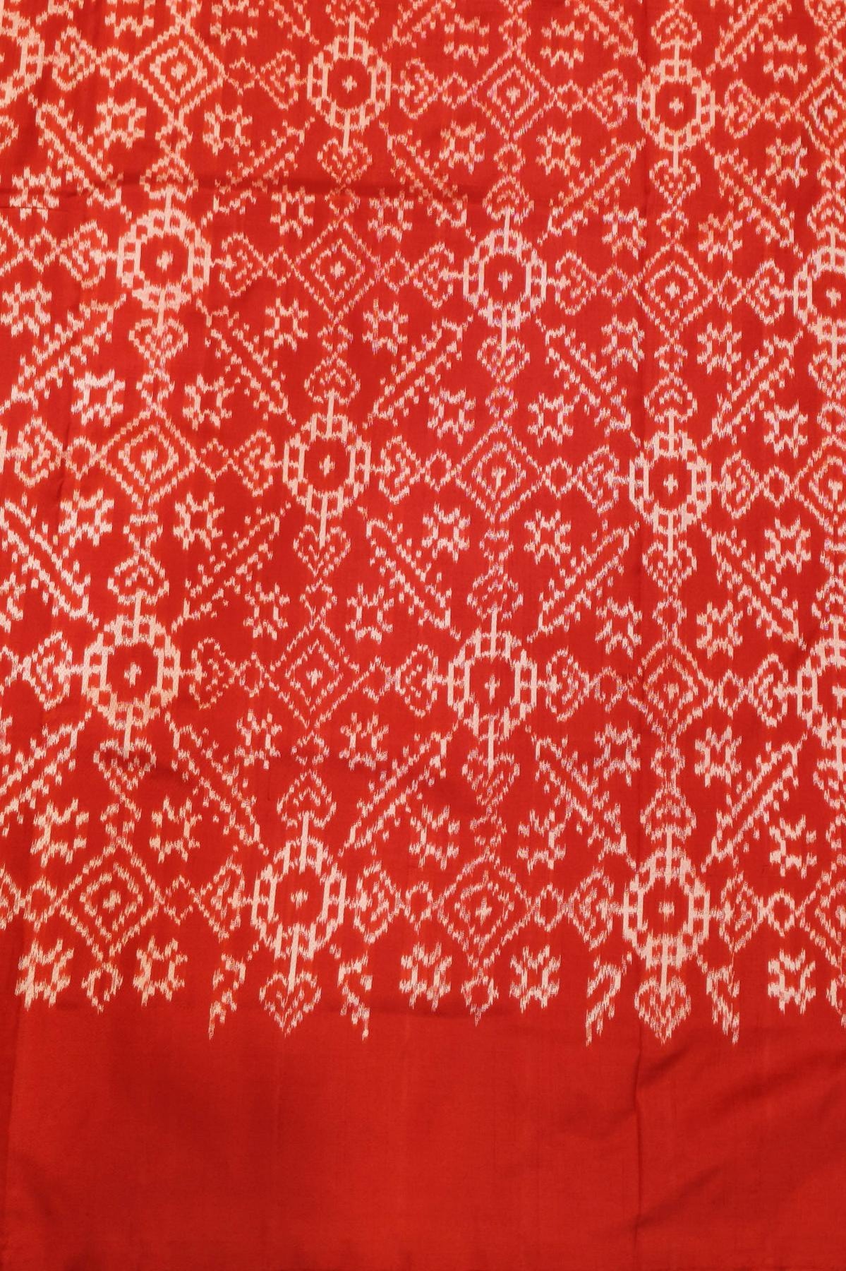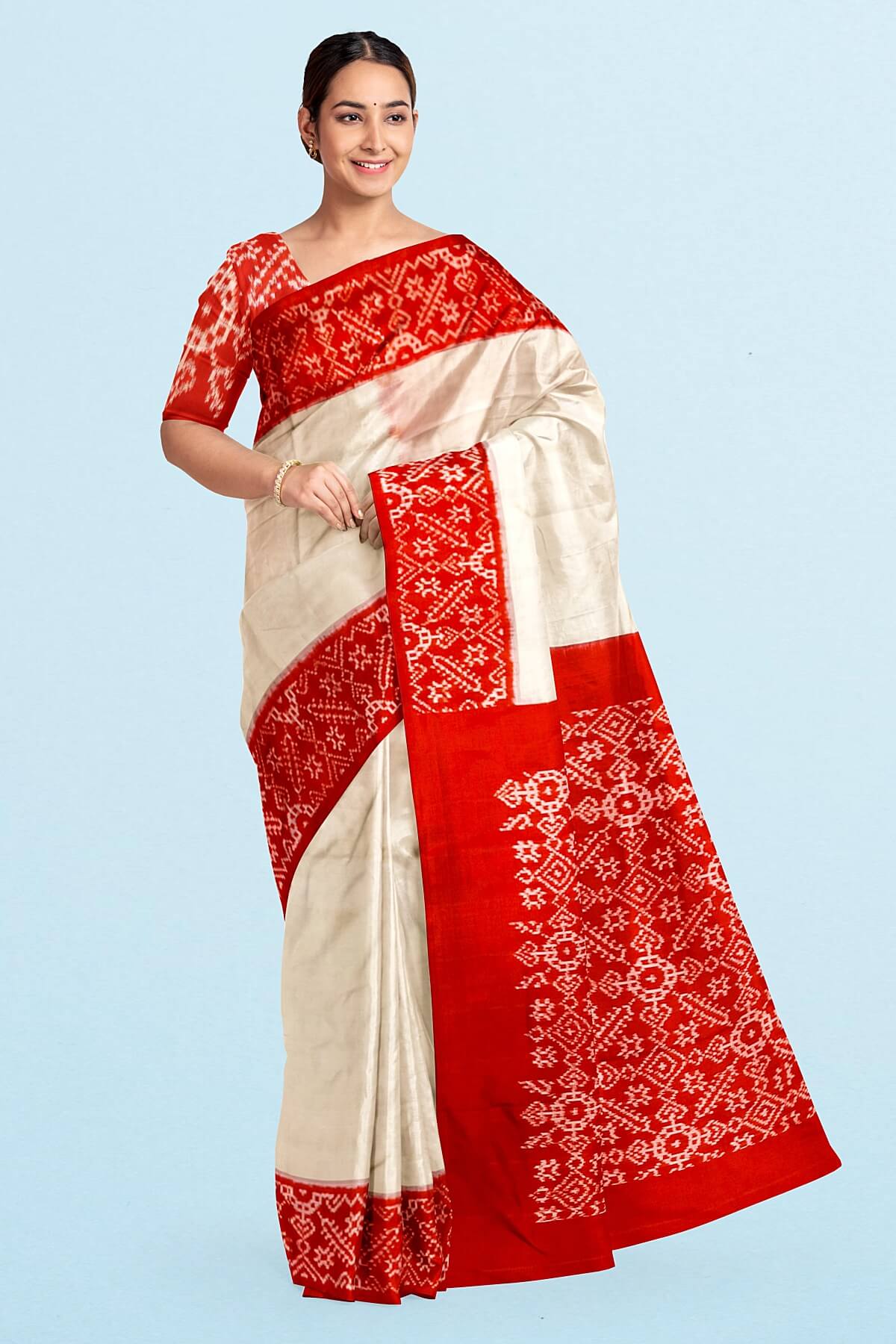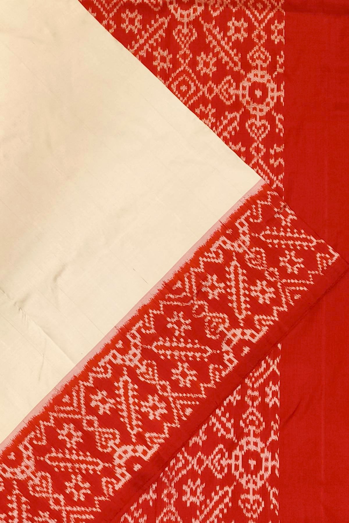 Description: Handwoven Ikat pure silk saree in off white & red with pan bhat pattern in borders , pallu and blouse