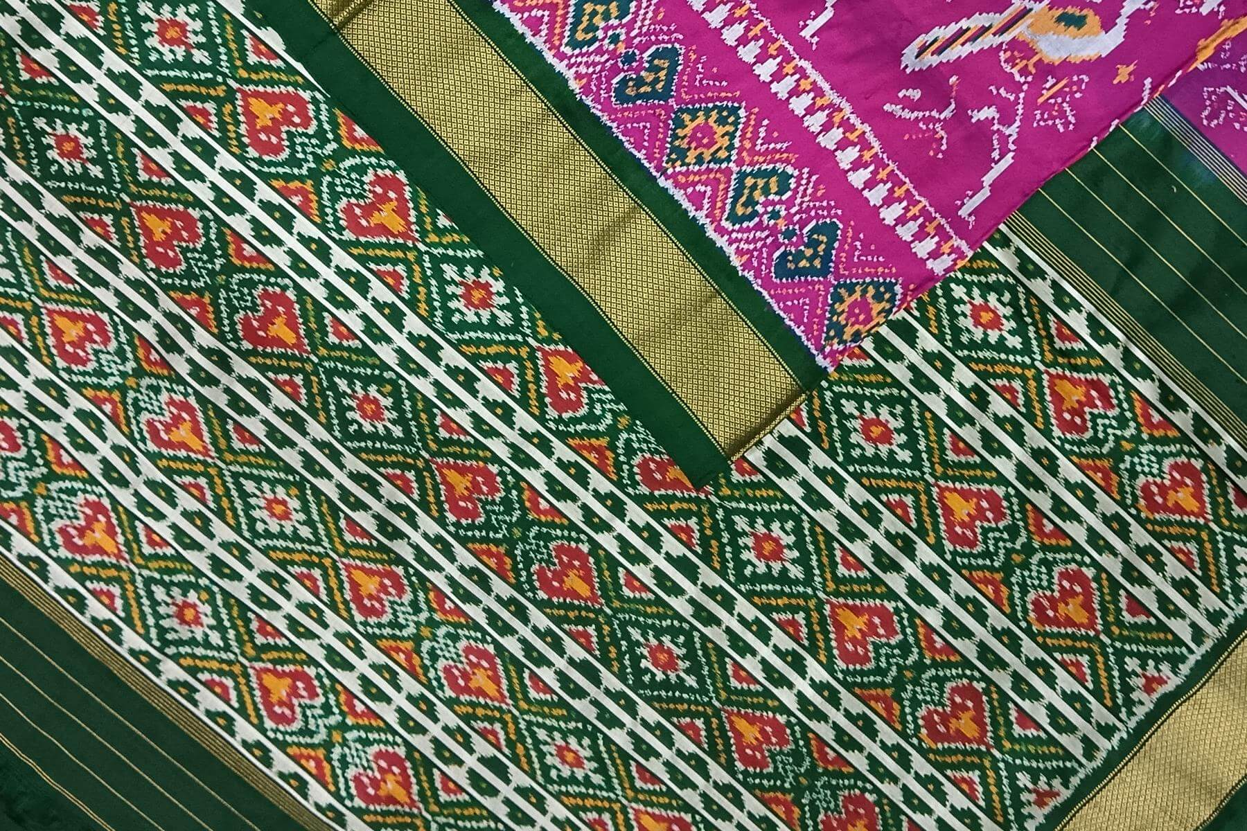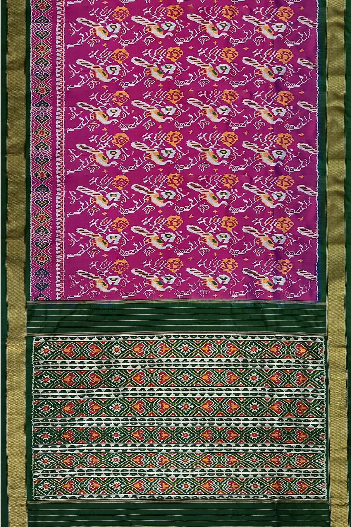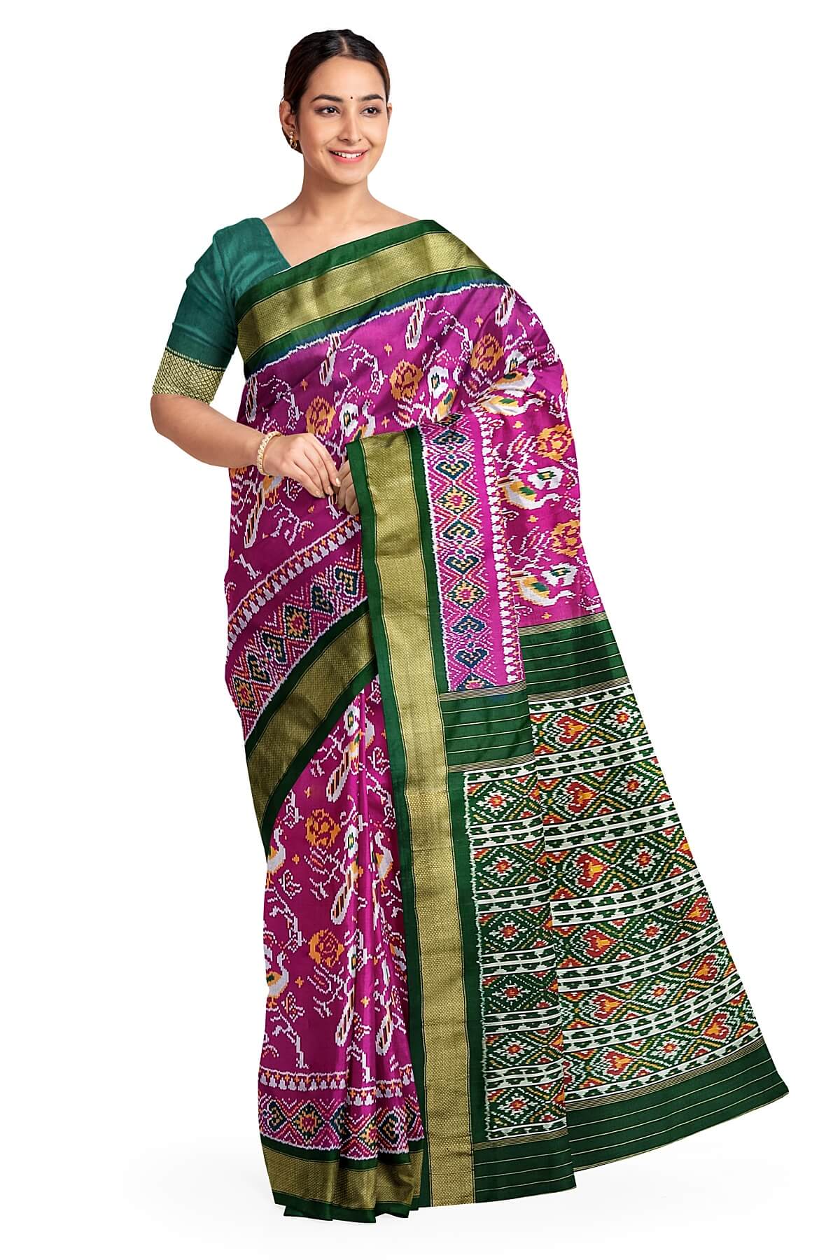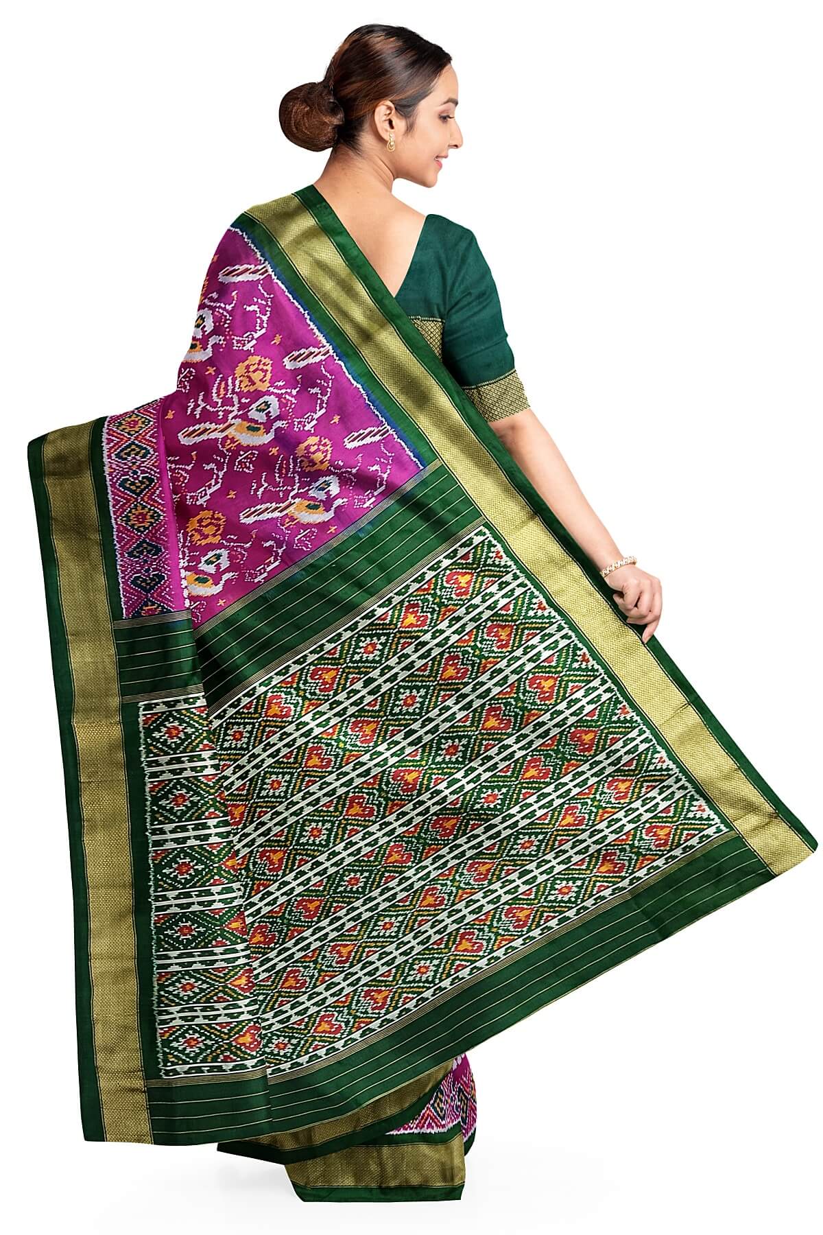 Description : Handwoven ikat pure silk saree in purple with bird motifs and a contrast pallu in diamond pattern.