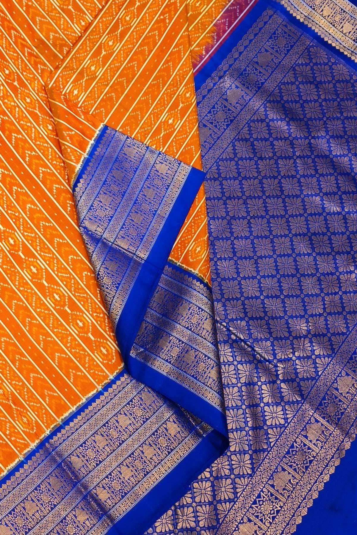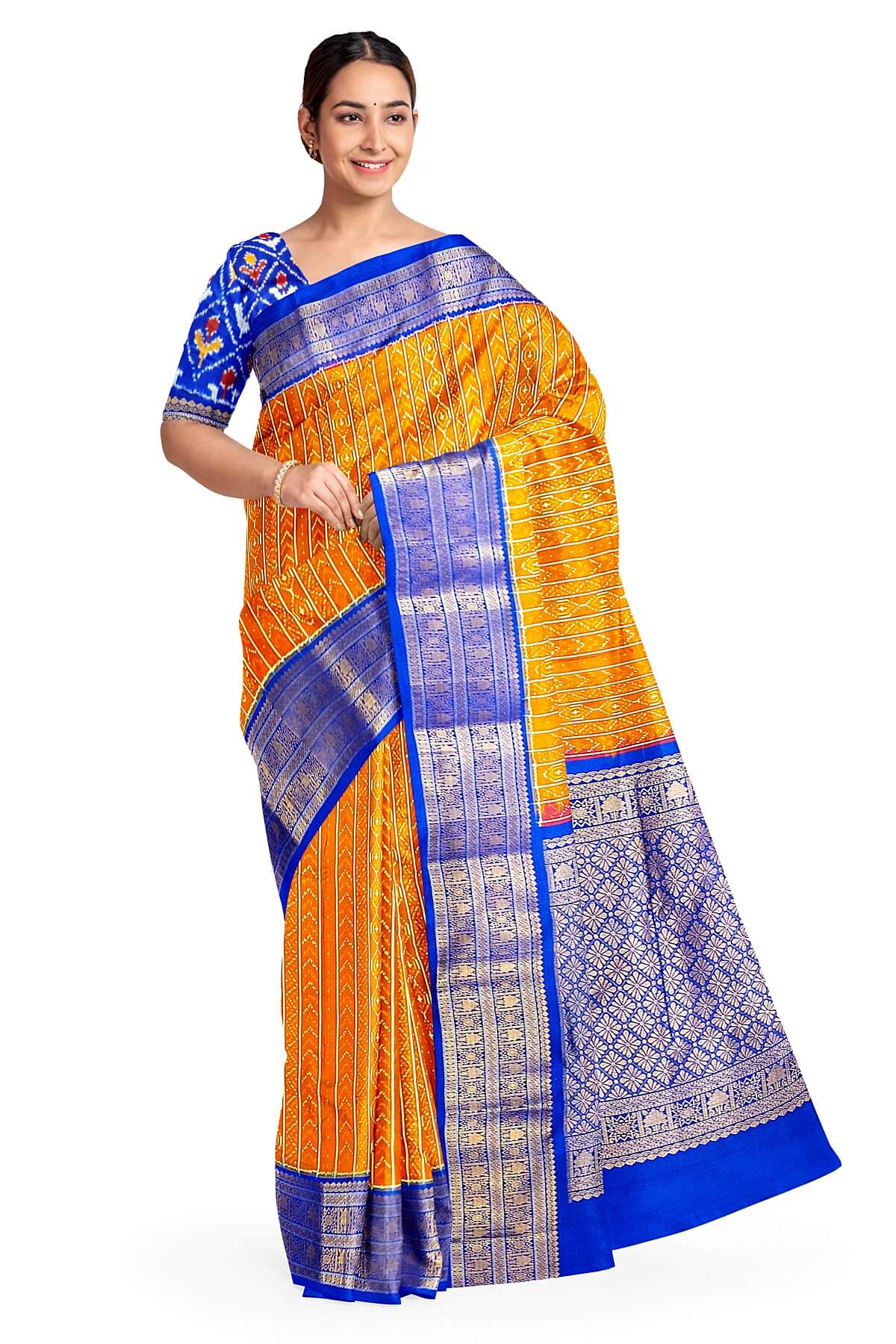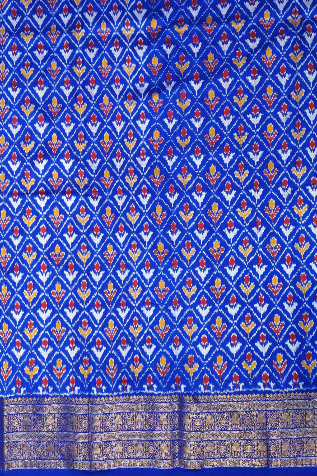 Description : Handwoven ikat pure silk saree in rust colour with geometric pattern and a rich kanchi patterned pallu & borders. This is enhanced with blue coloured floral motifs blouse.