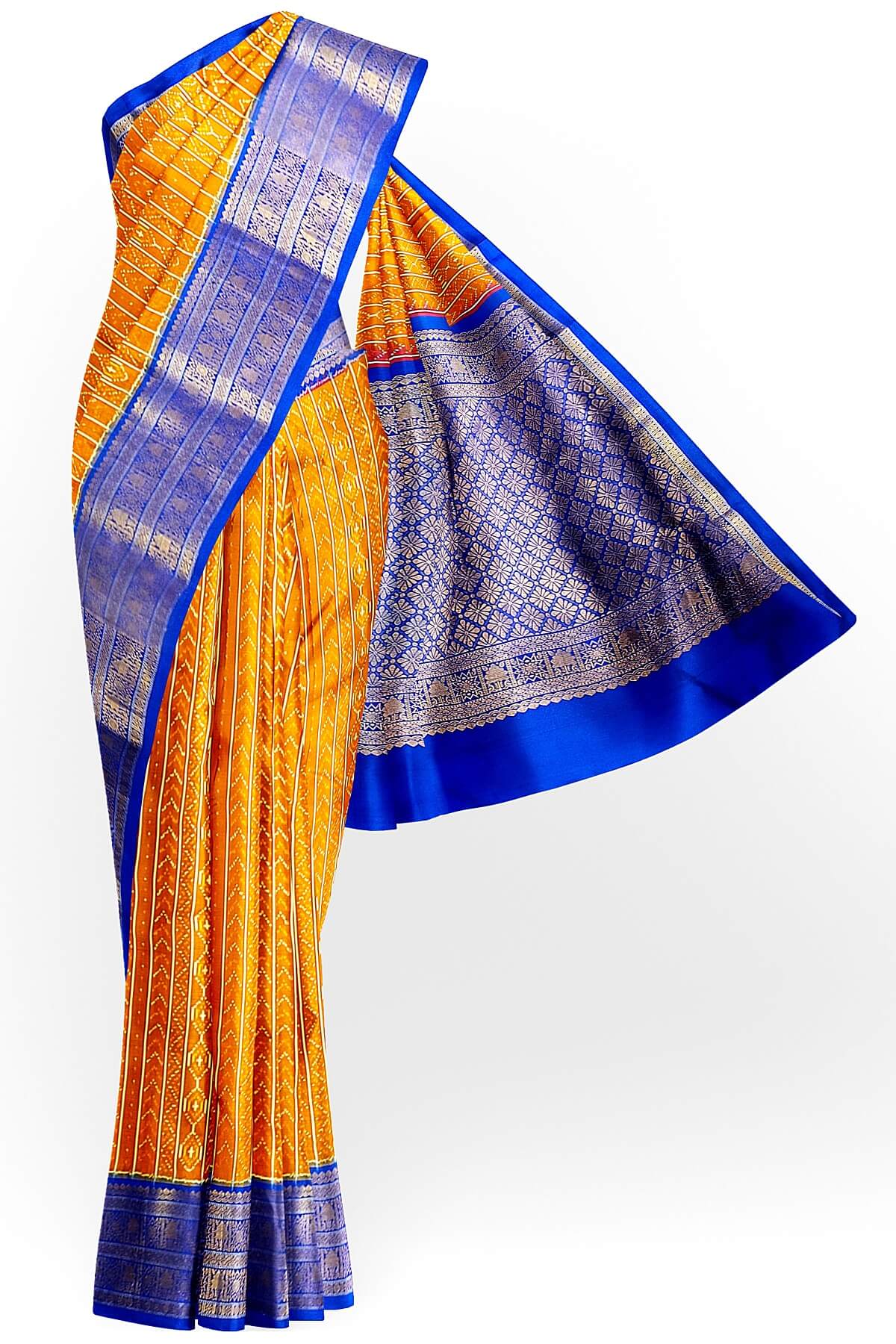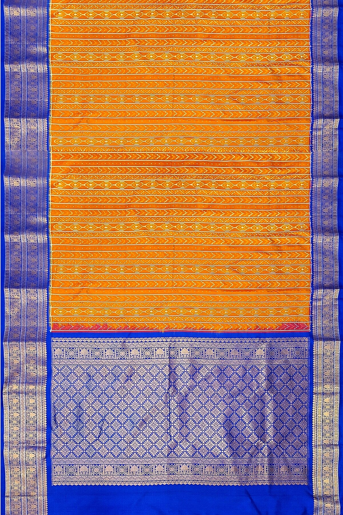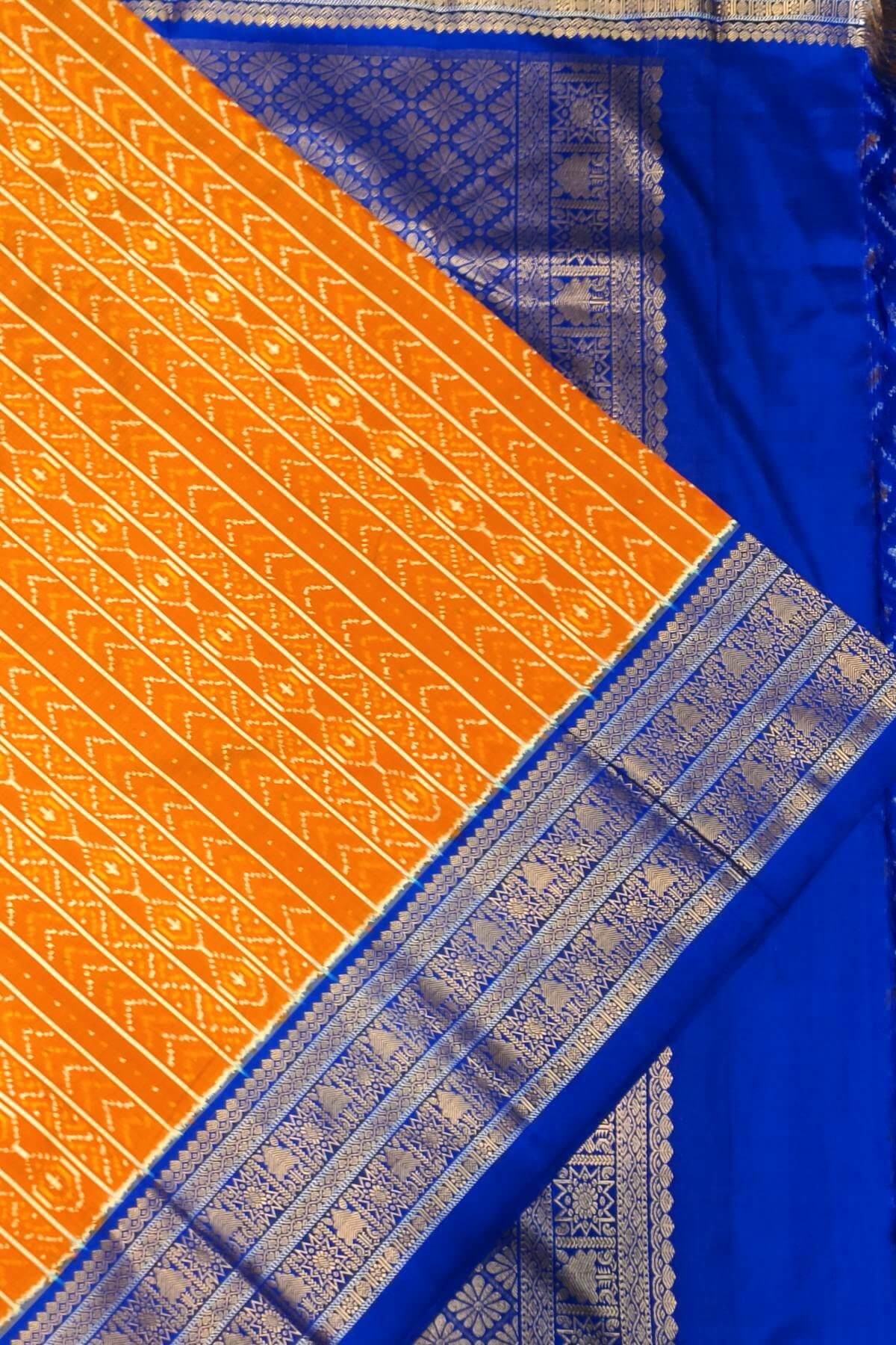 Description : Handwoven ikat pure silk saree in rust colour with geometric pattern and a rich kanchi patterned pallu & borders. This is enhanced with blue coloured floral motifs blouse.