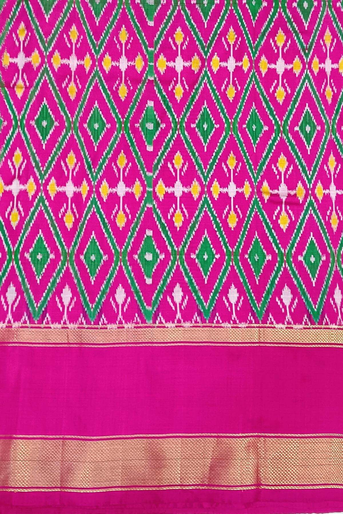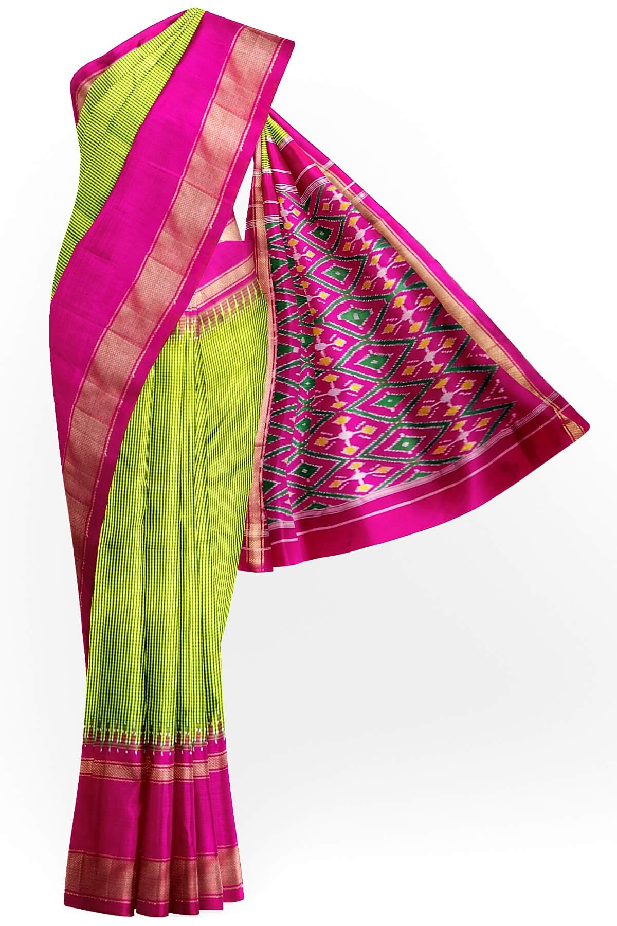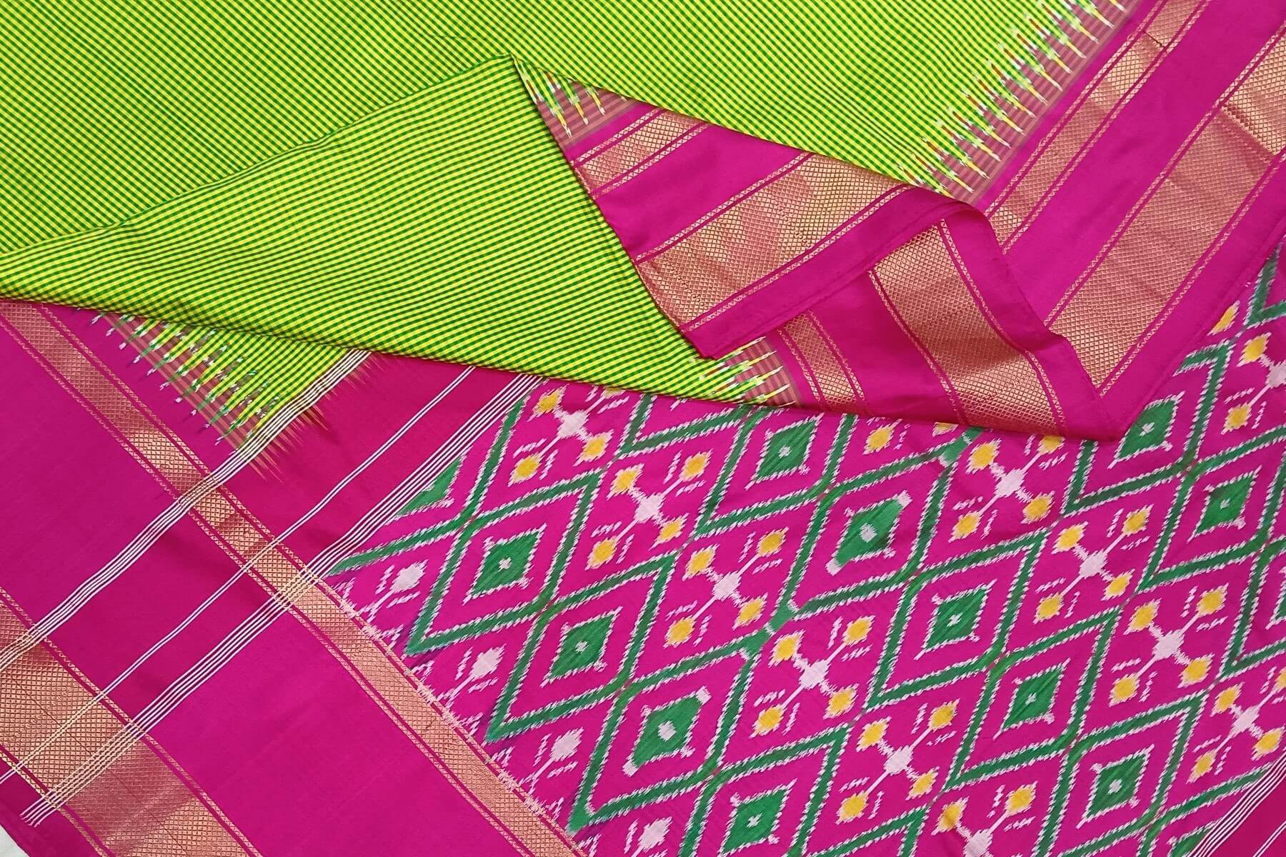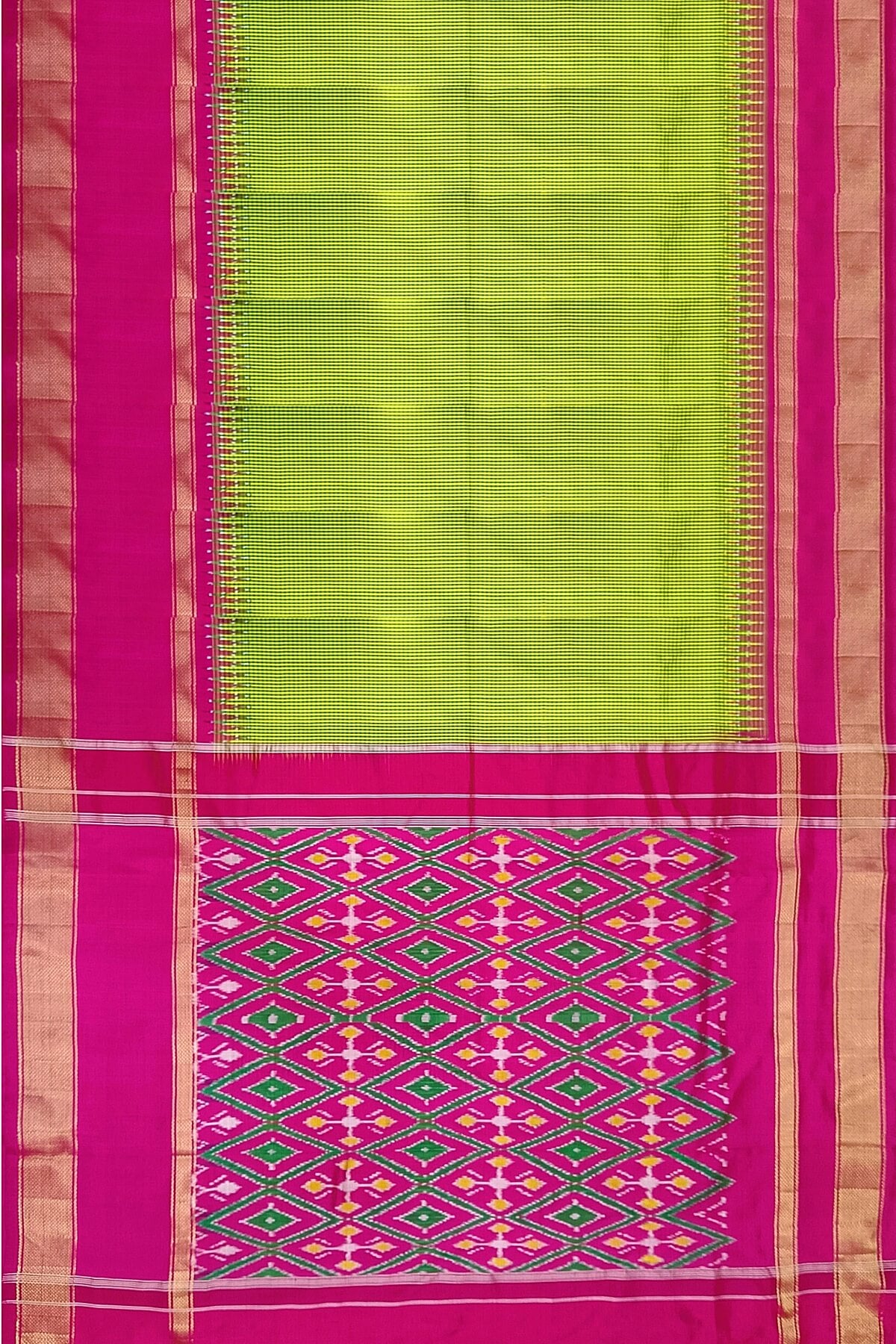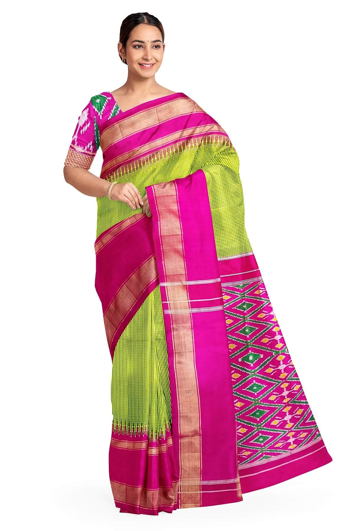 Description : Handwoven Ikat pure silk saree in green in fine checks with diamond pattern in pallu & blouse.