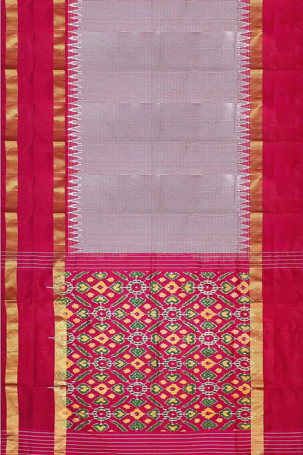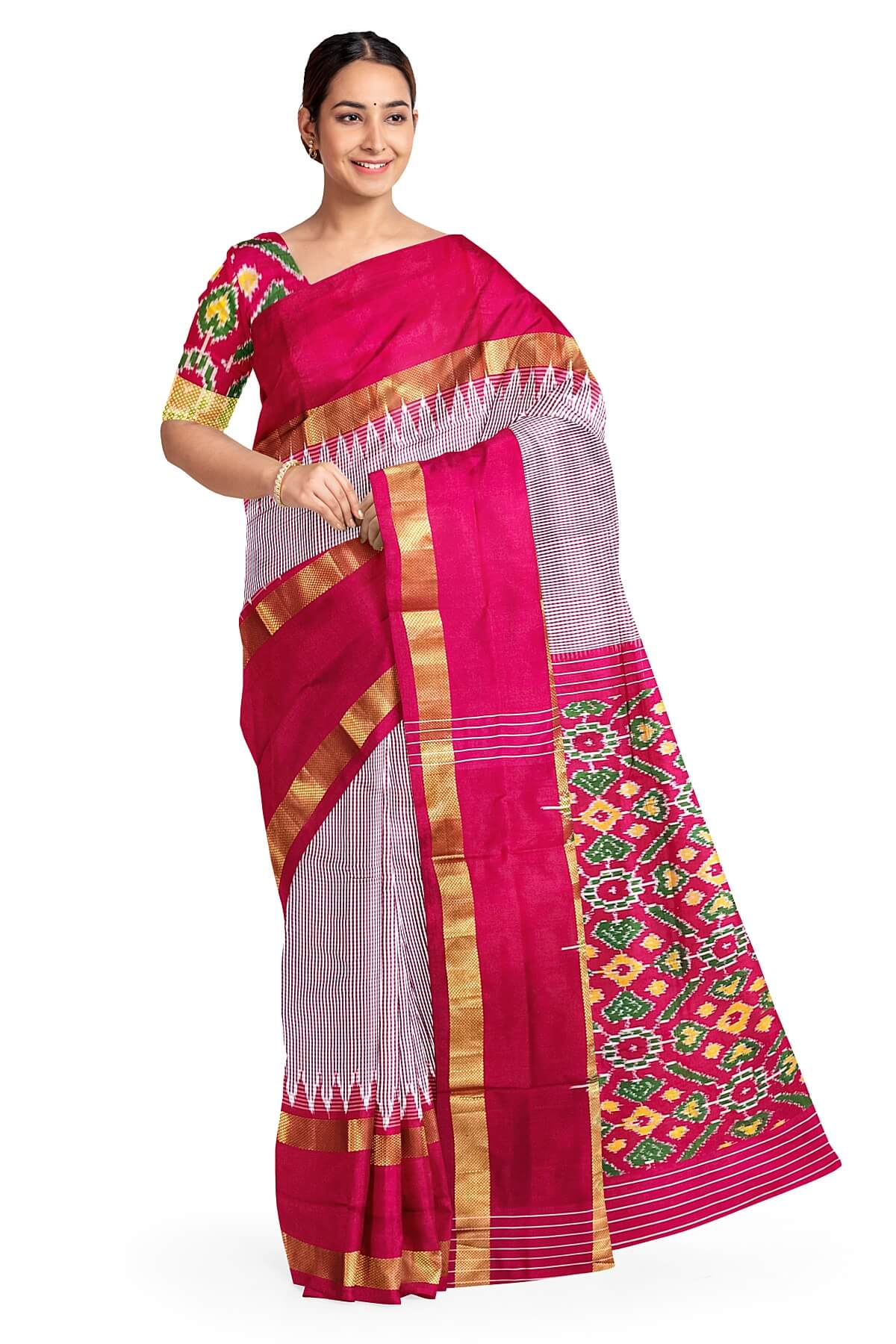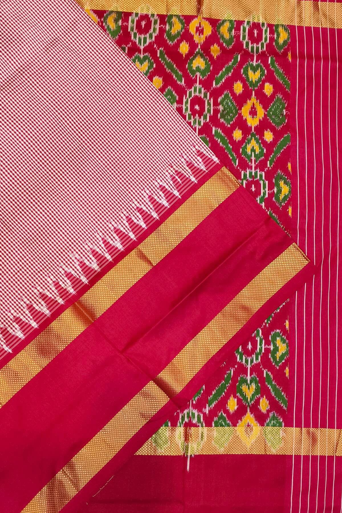 Description: Handwoven Ikat silk saree in pink in fine checks with patola pattern pallu & blouse.