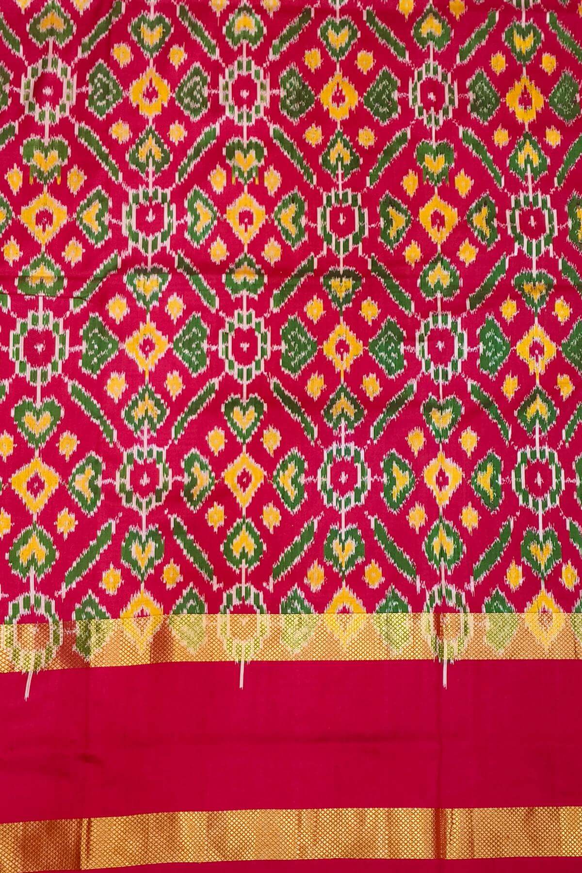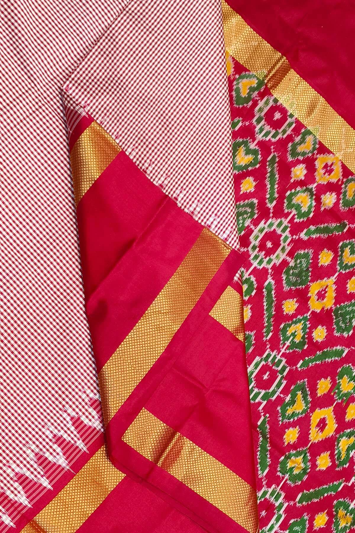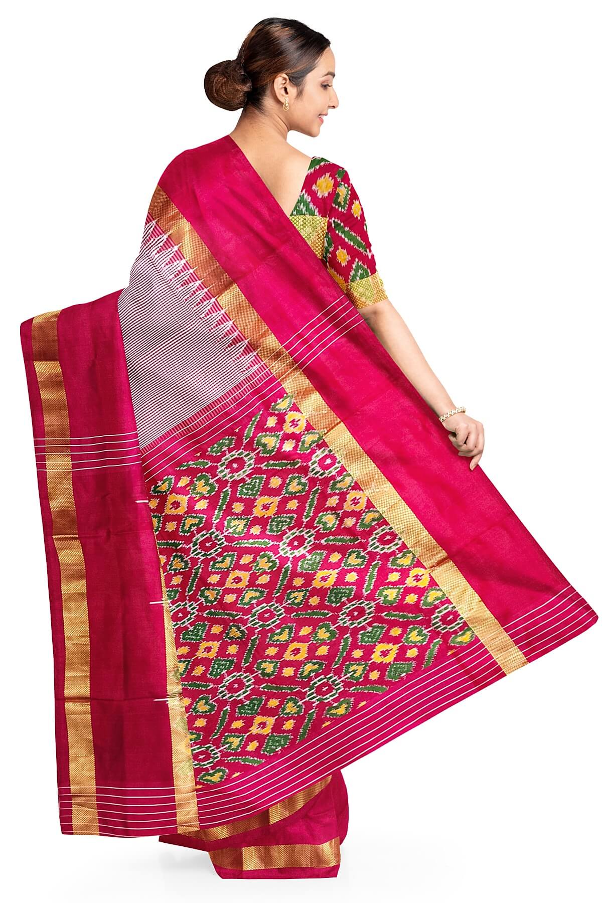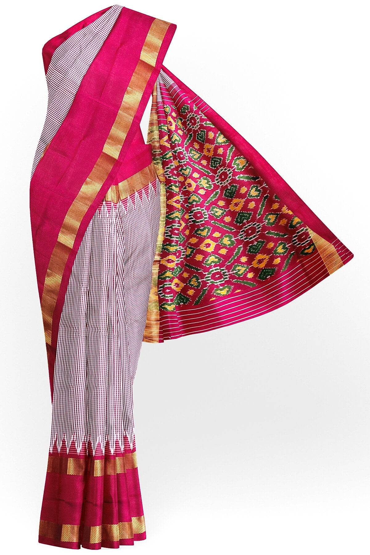 Description: Handwoven Ikat silk saree in pink in fine checks with patola pattern pallu & blouse.