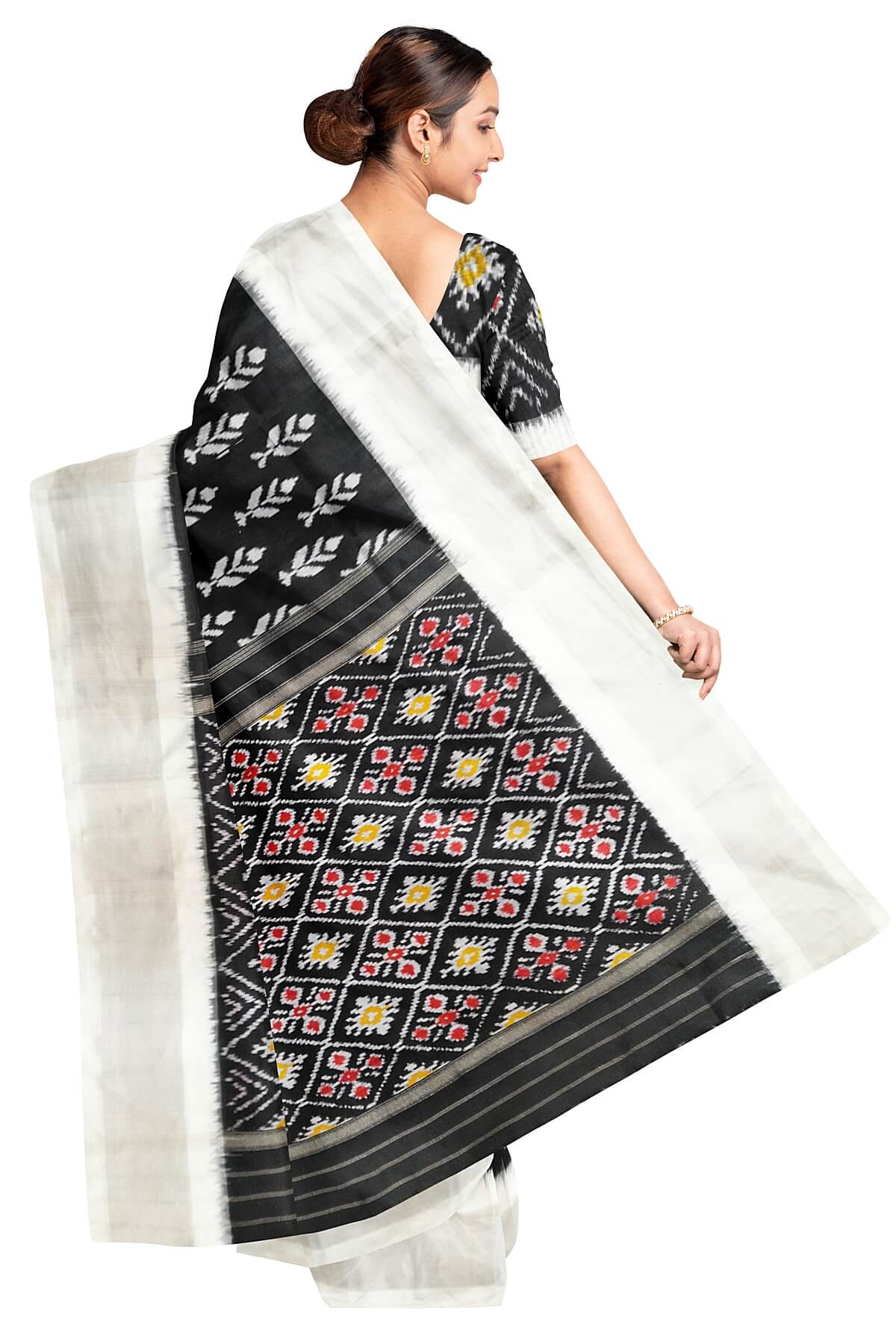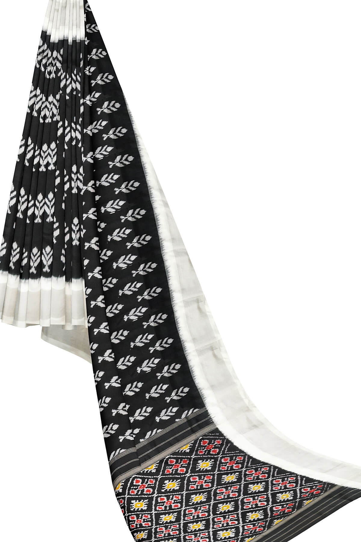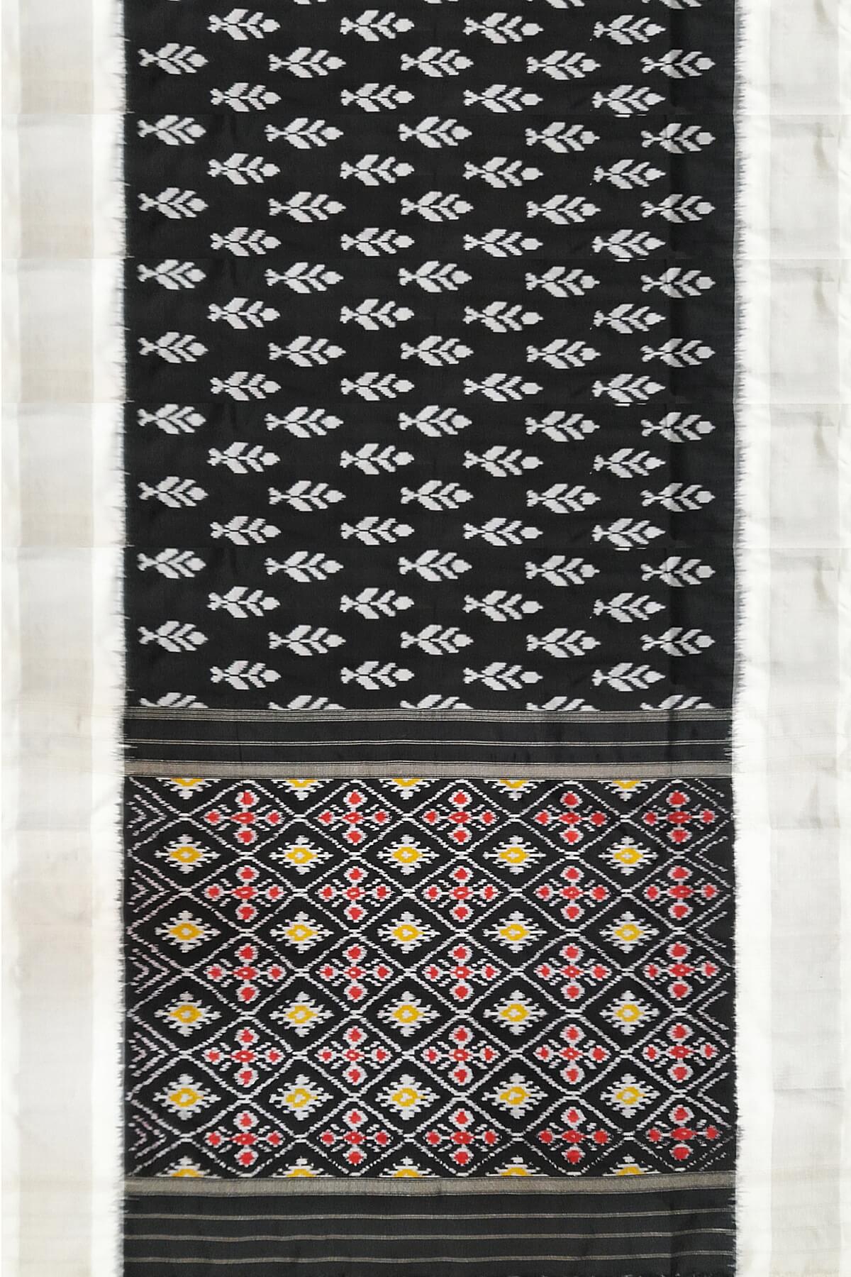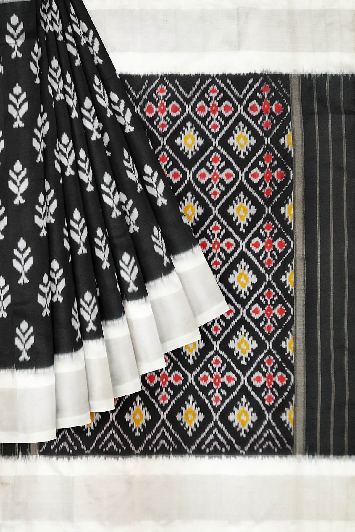 Description : Handwoven ikat pure silk saree in black with floral motifs and silver borders. The pallu is enhanced by patola design diamond pattern