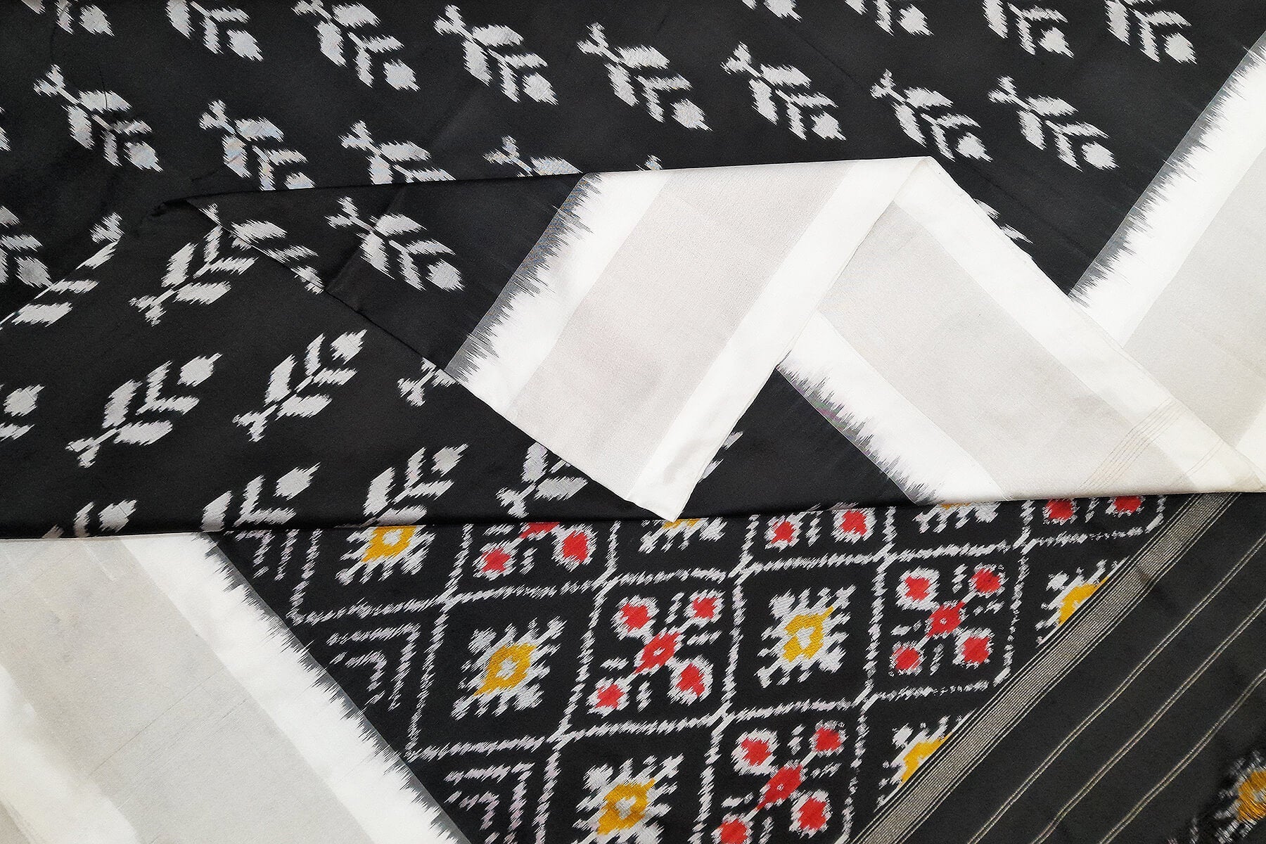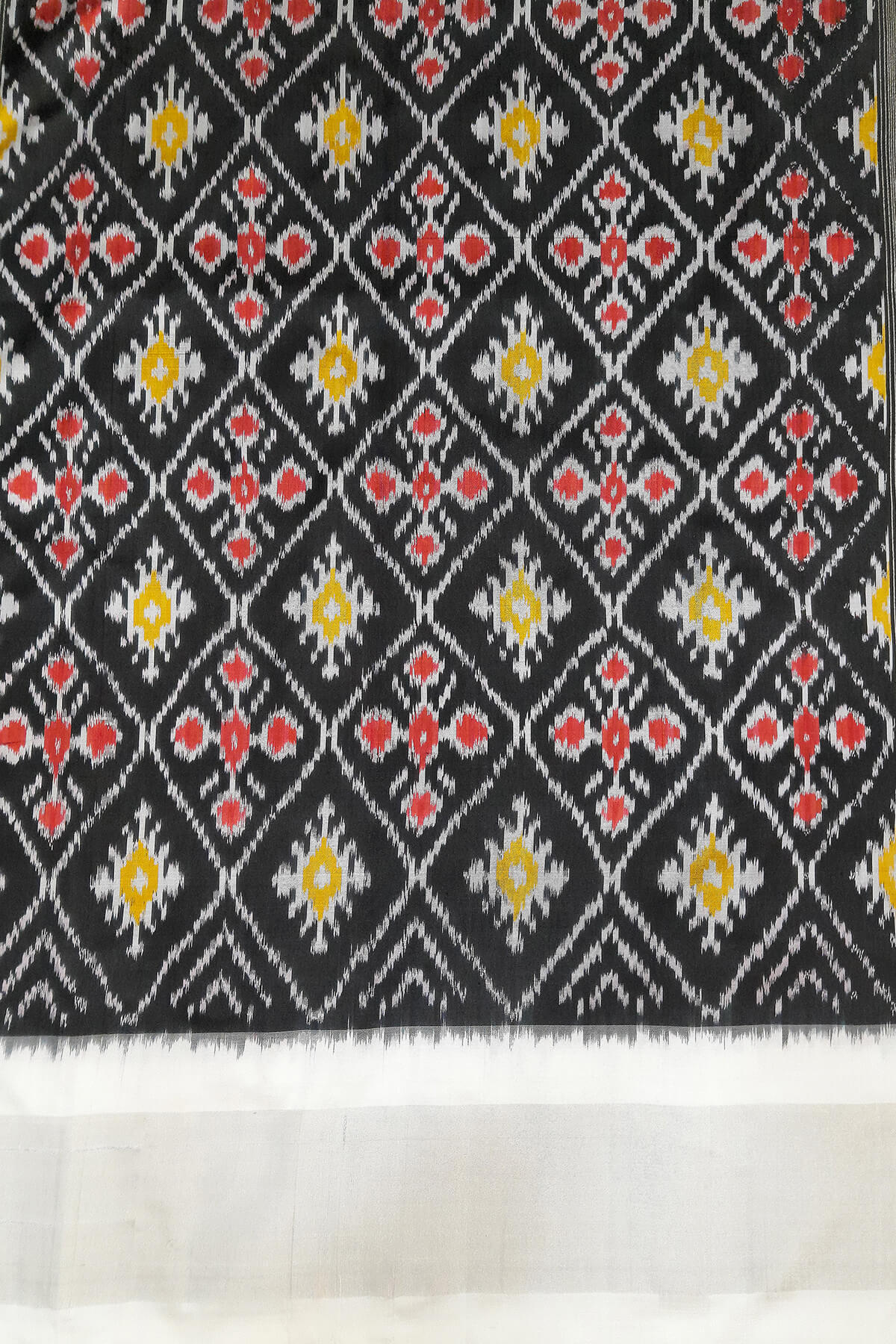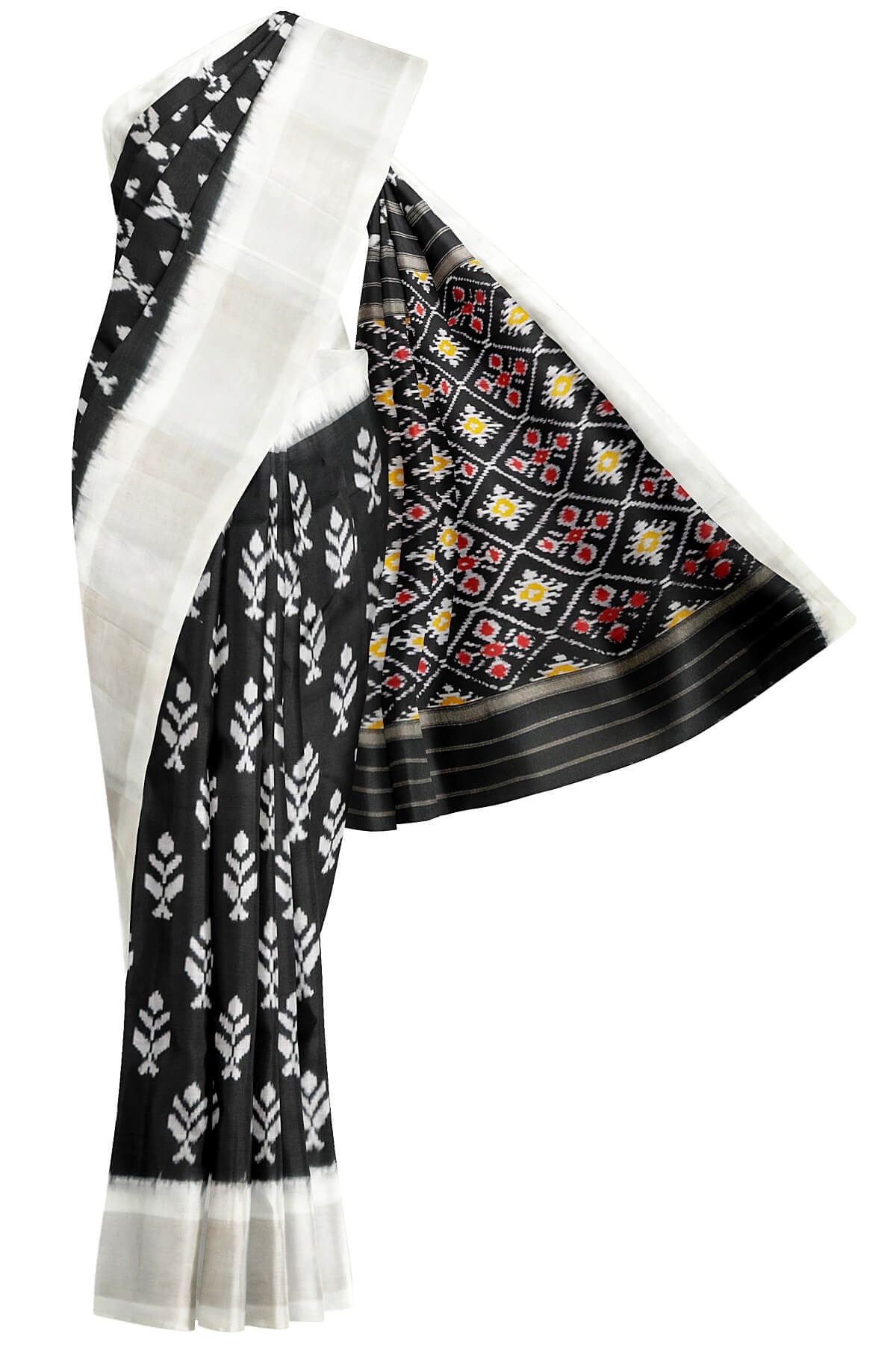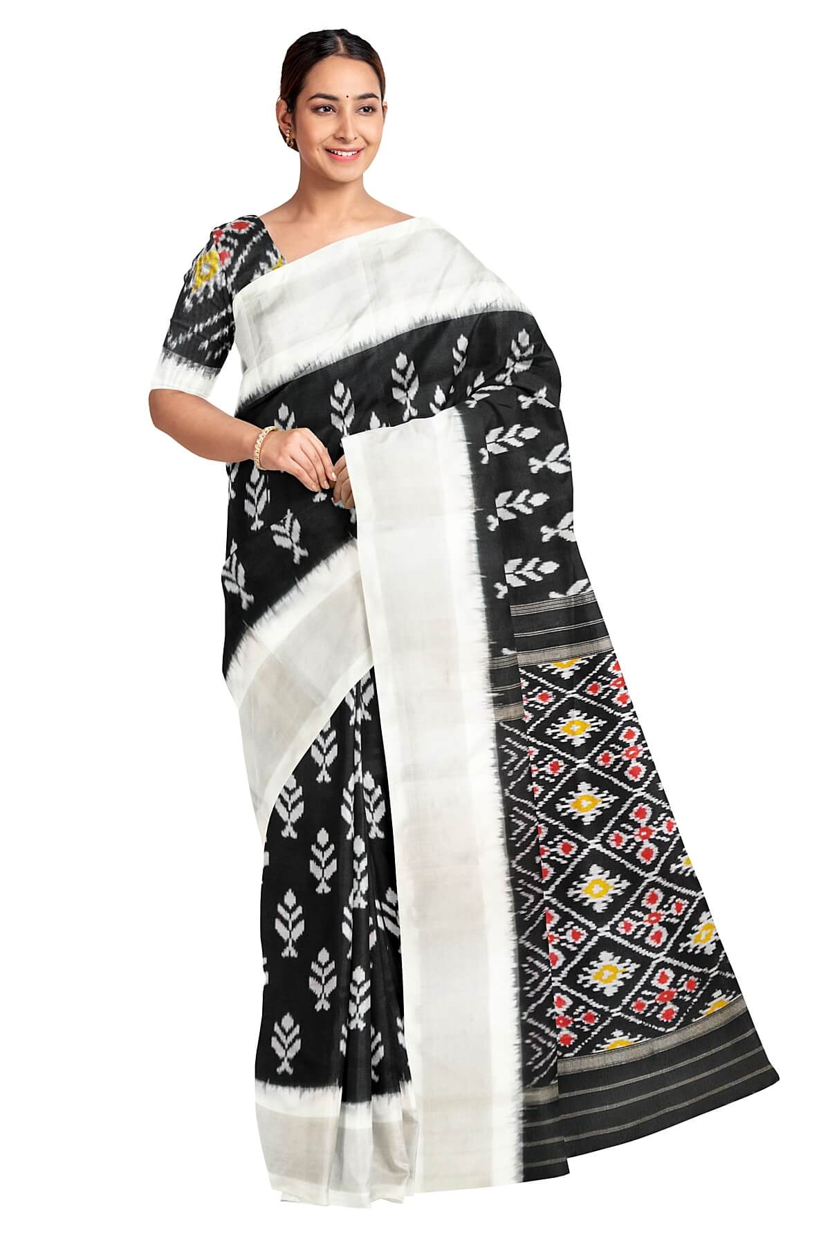 Description : Handwoven ikat pure silk saree in black with floral motifs and silver borders. The pallu is enhanced by patola design diamond pattern