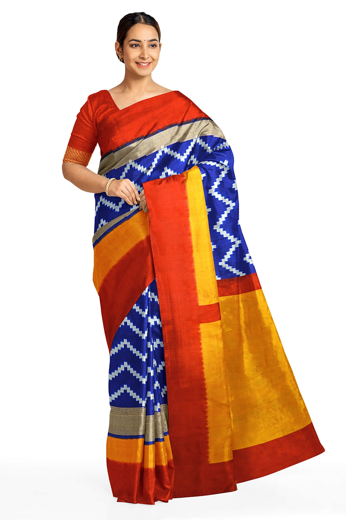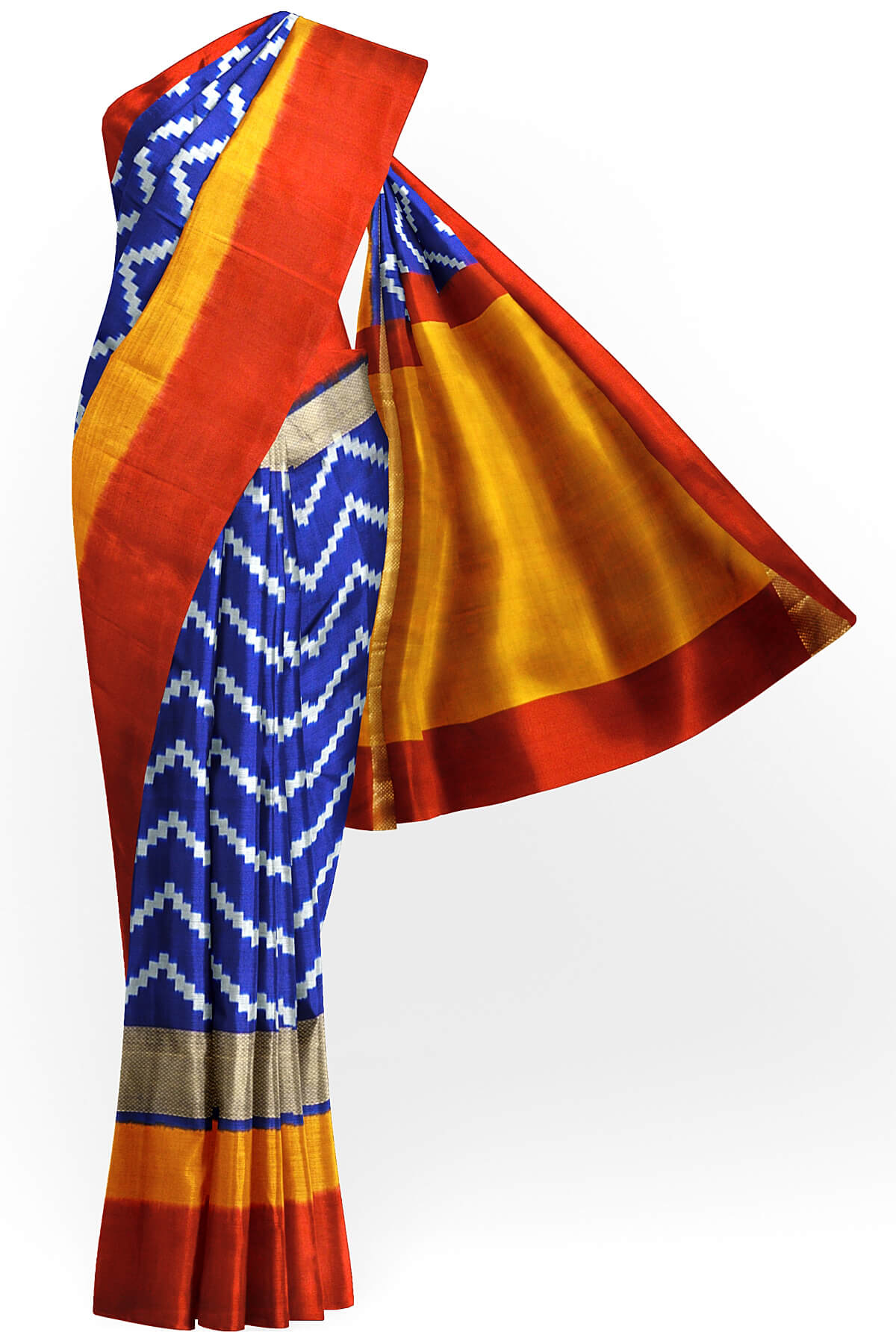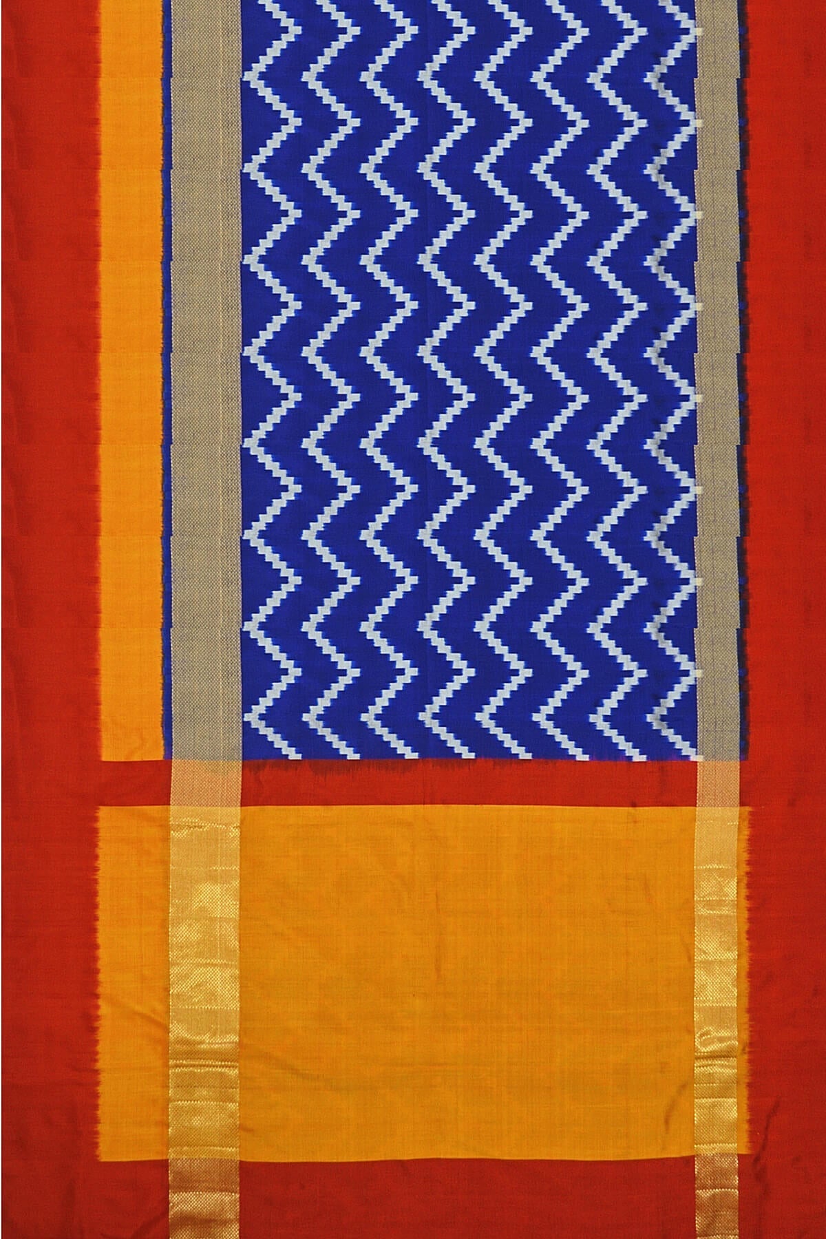 Description : Handwoven Ikat silk saree in royal blue with zig zag pattern and a zari border with contrast pallu