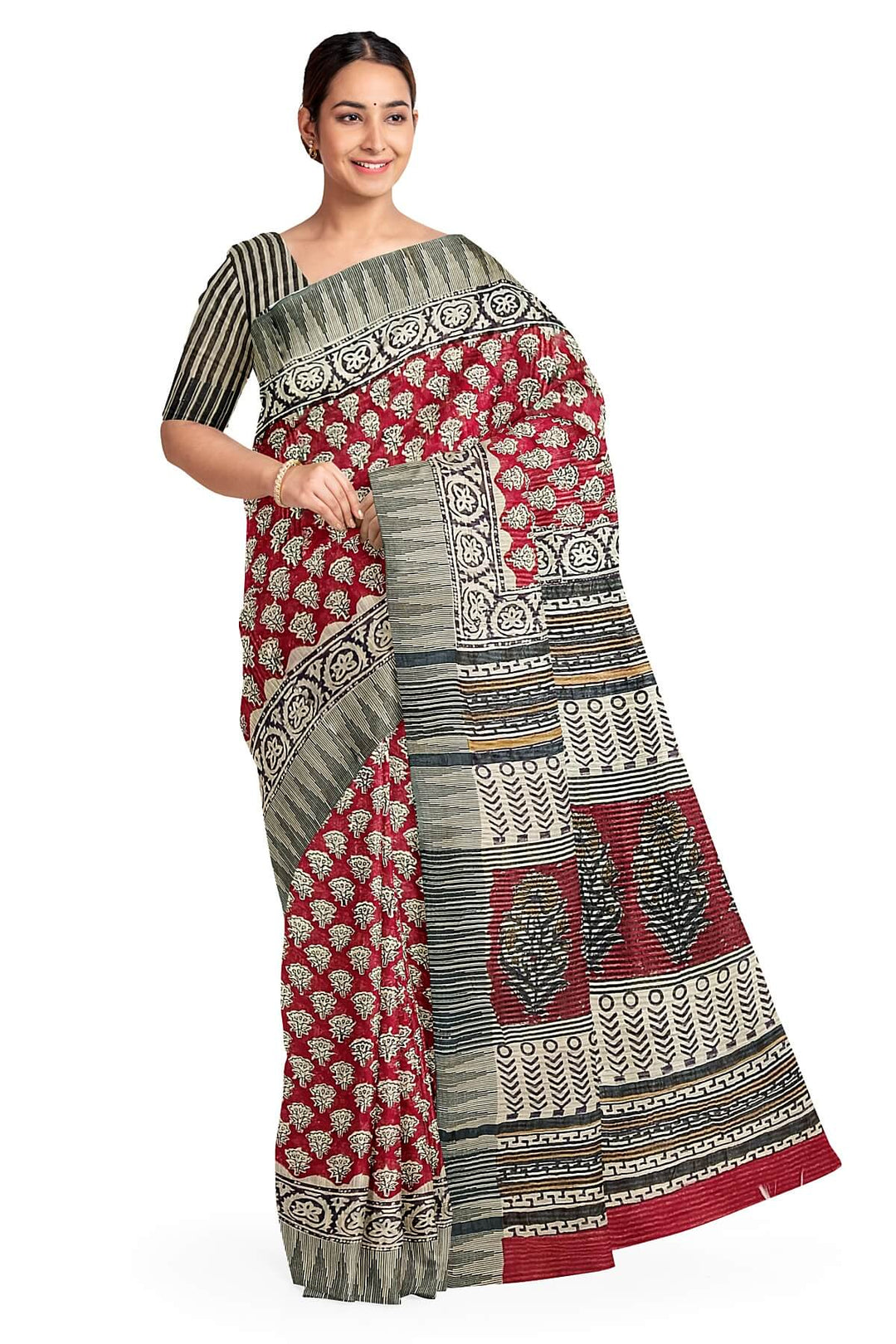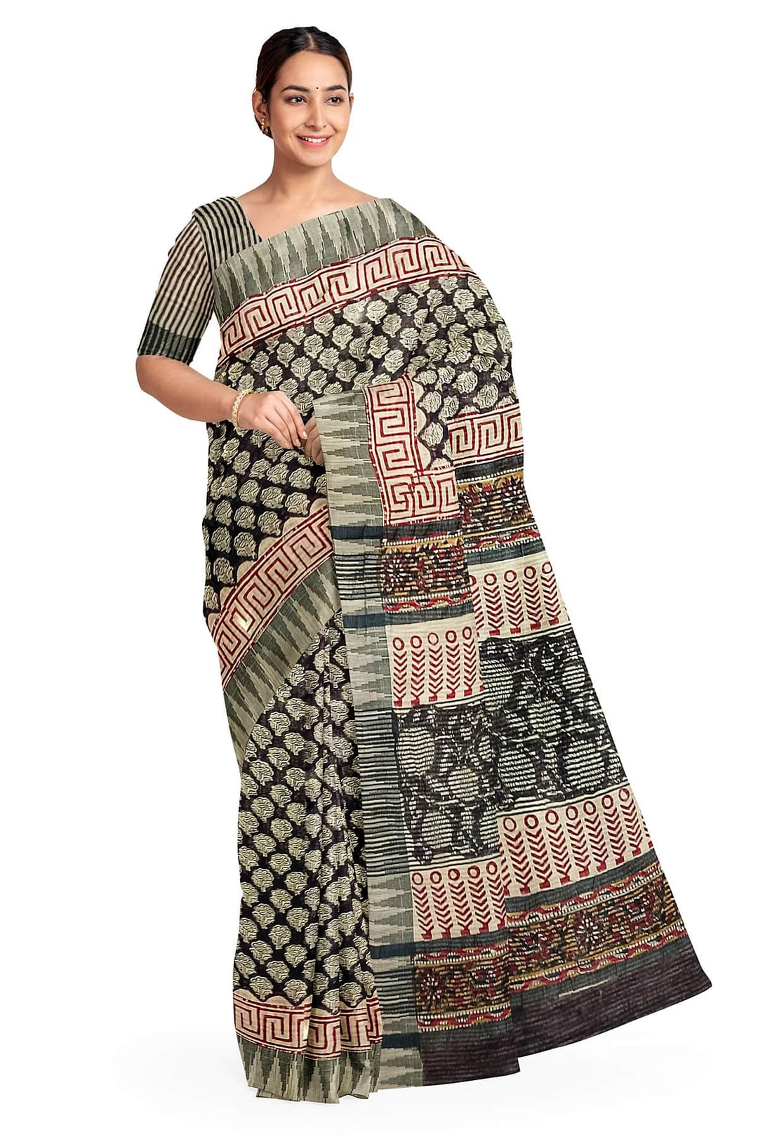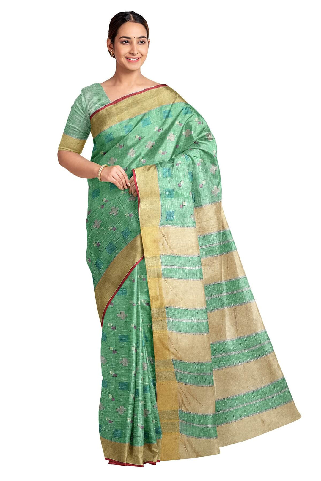 Pure linen saree in green with a pattern on the bodyr & a striped pallu