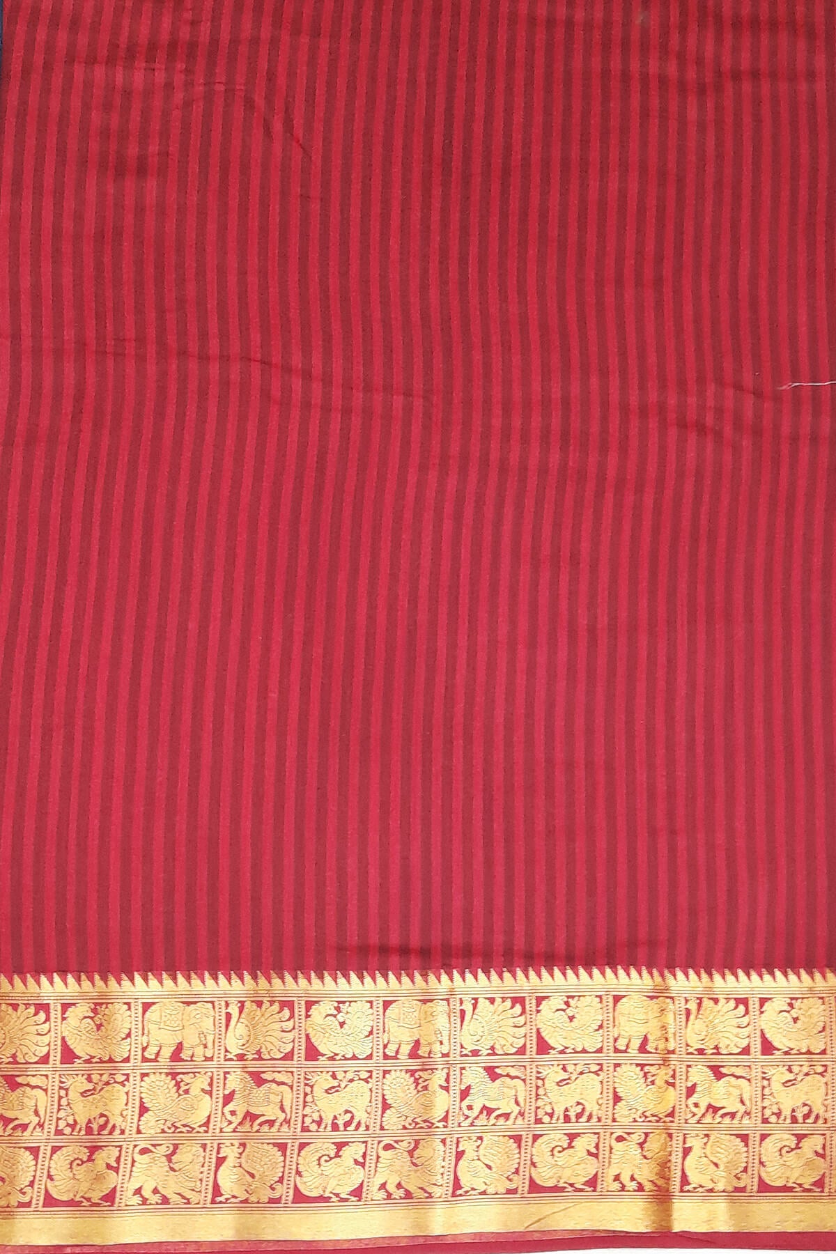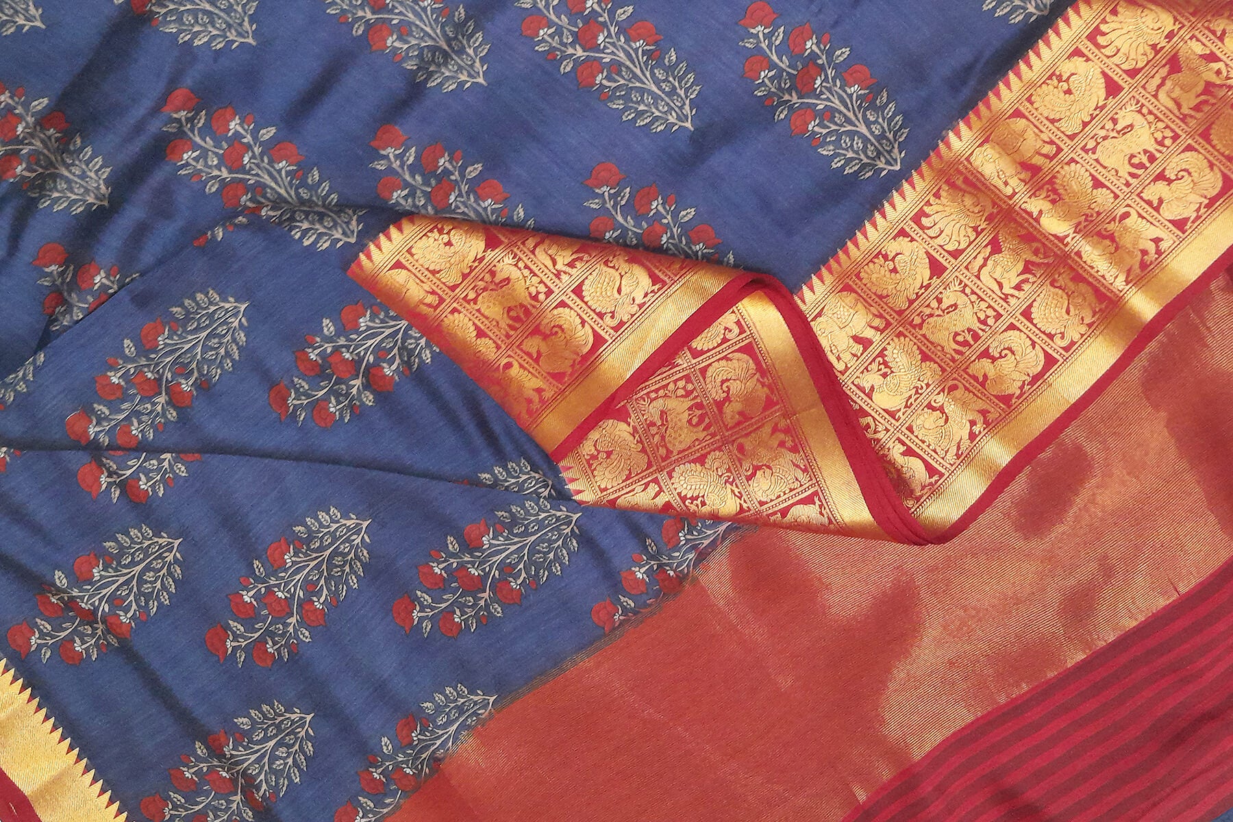 Description: An electric blue shade and copper red weaved zari border, this Moonga silk saree enriched with floral prints is a rich symbol of Benarasi handloom.