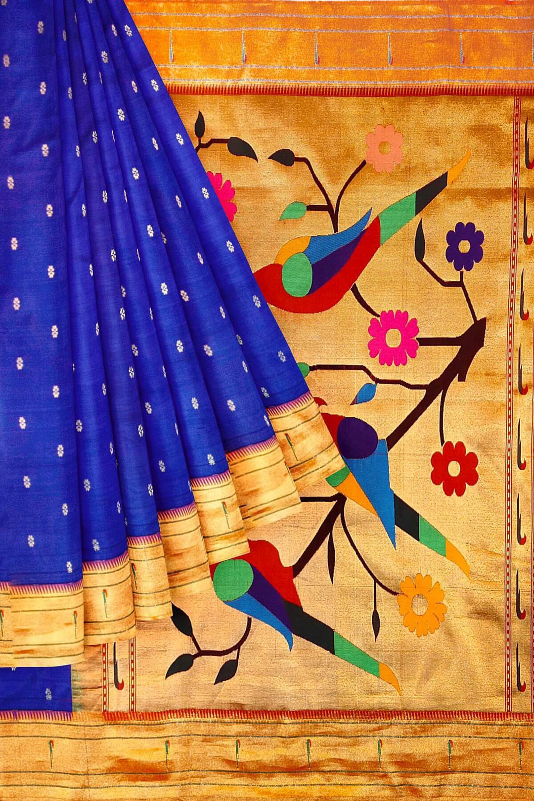 Paithani pure silk saree in royal blue with small floral motifs on the body .