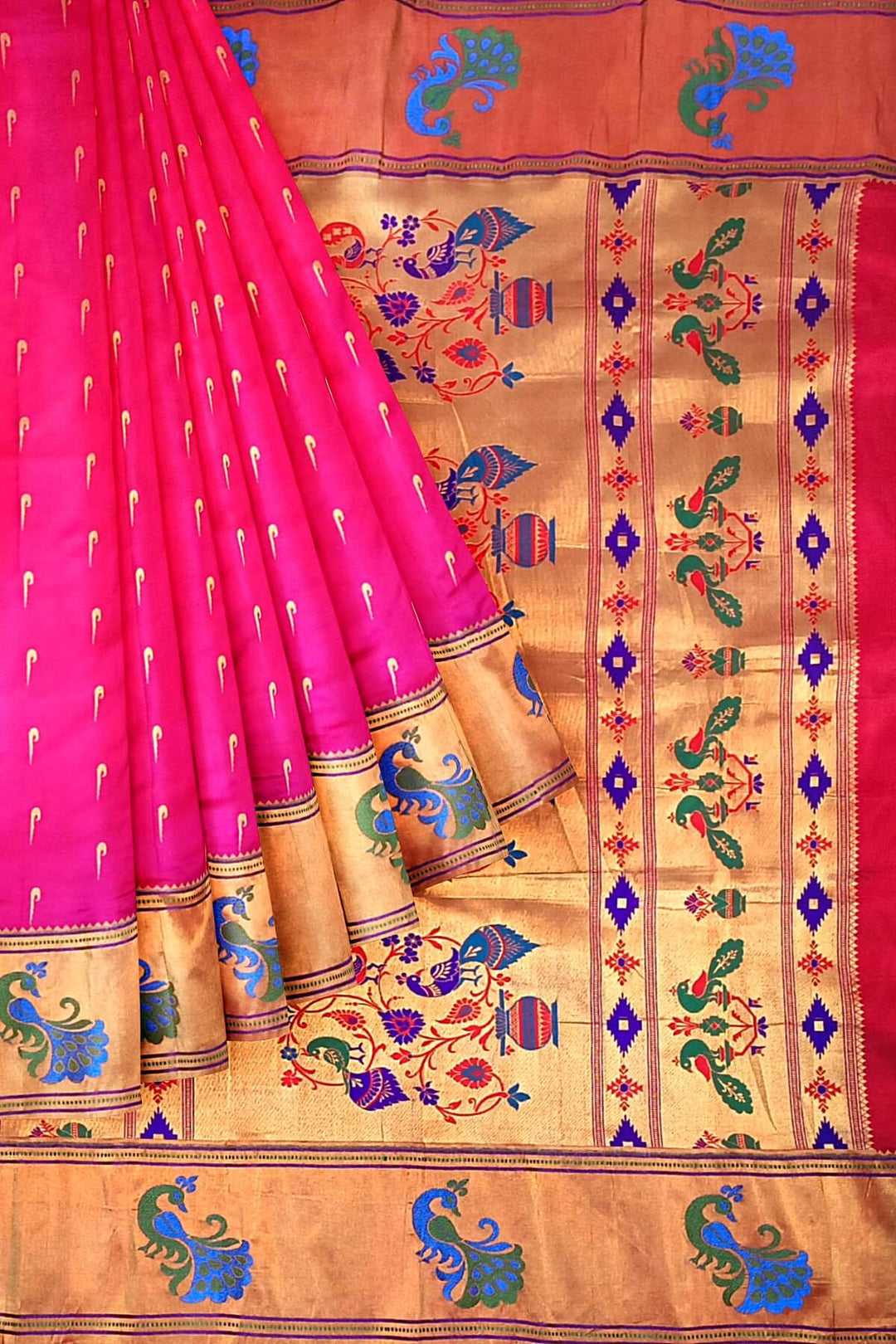 Paithani pure silk saree in pink with muniya motifs on the body.