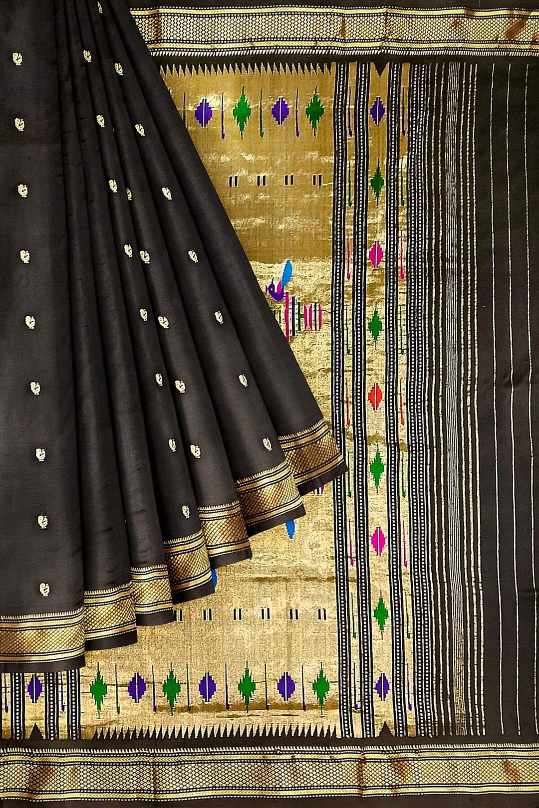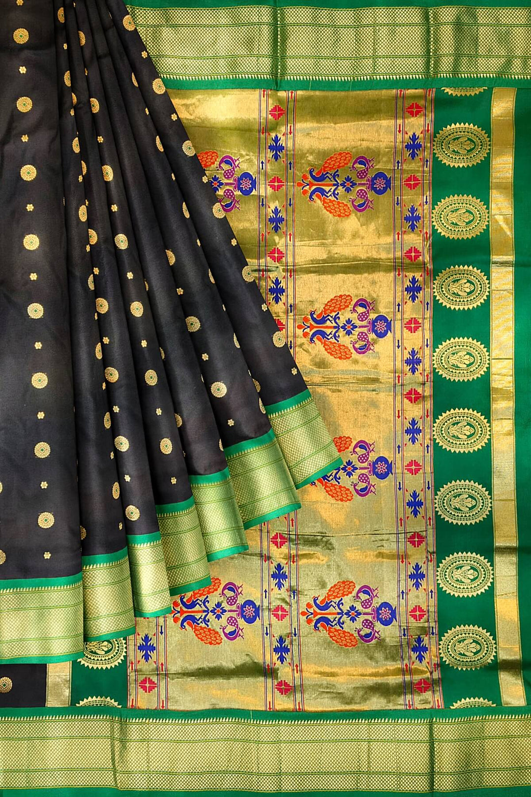 Handwoven Paithani pure silk saree in black with peacock motifs