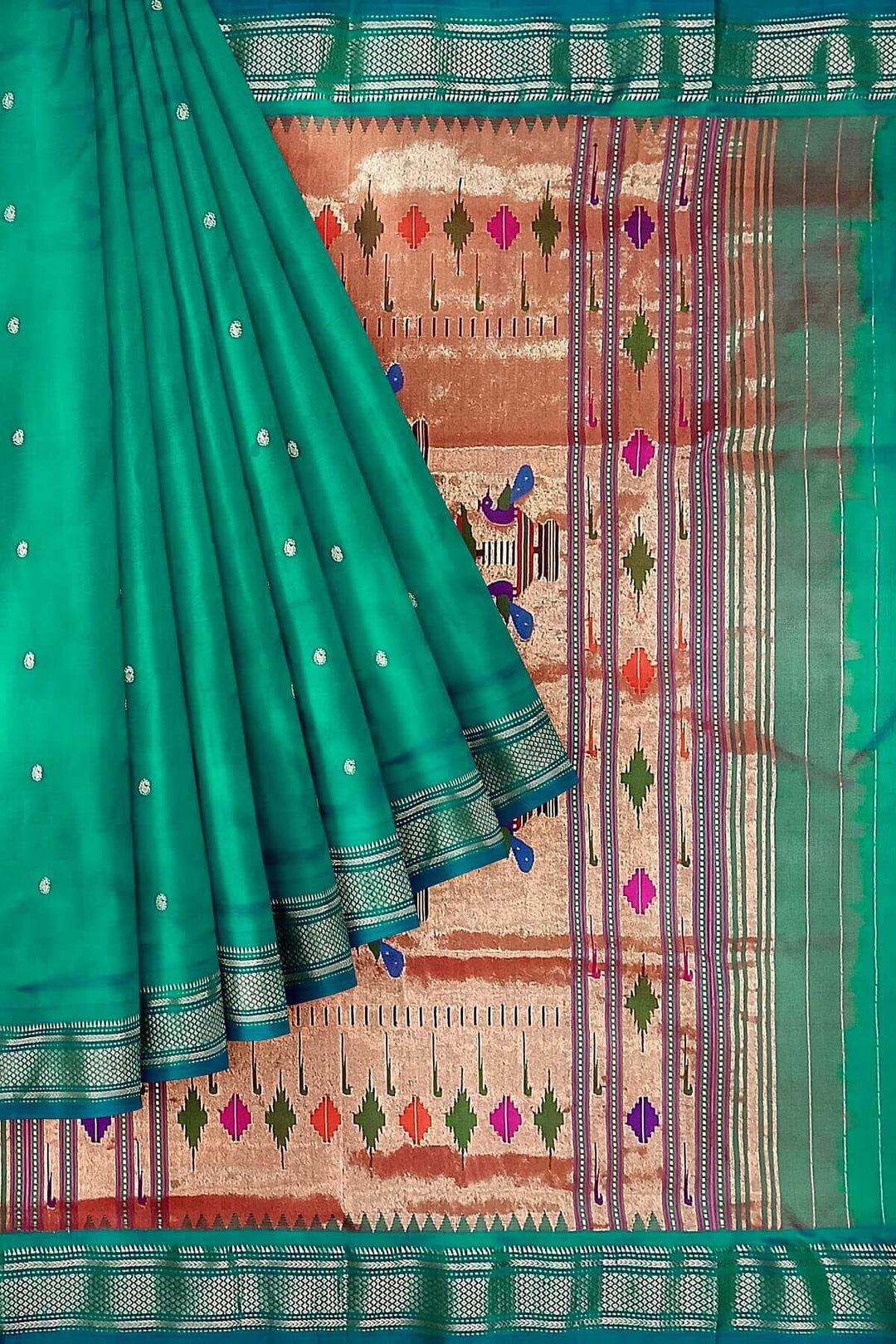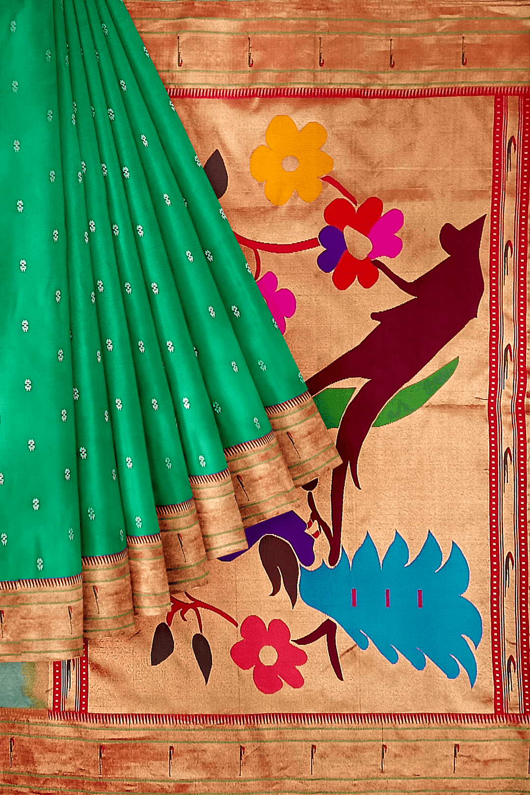 Paithani pure silk saree in Rama green with small motifs with a muniya border