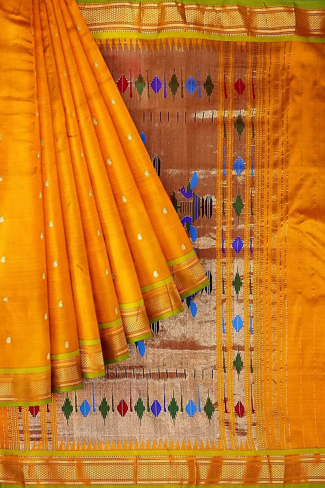 Handwoven Paithani pure silk saree in mustard yellow with paisley motifs