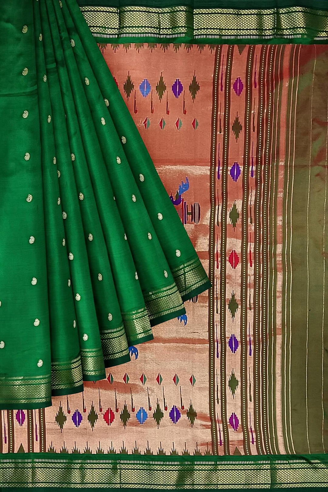 Handwoven Paithani pure silk saree in dark green with paisley motifs