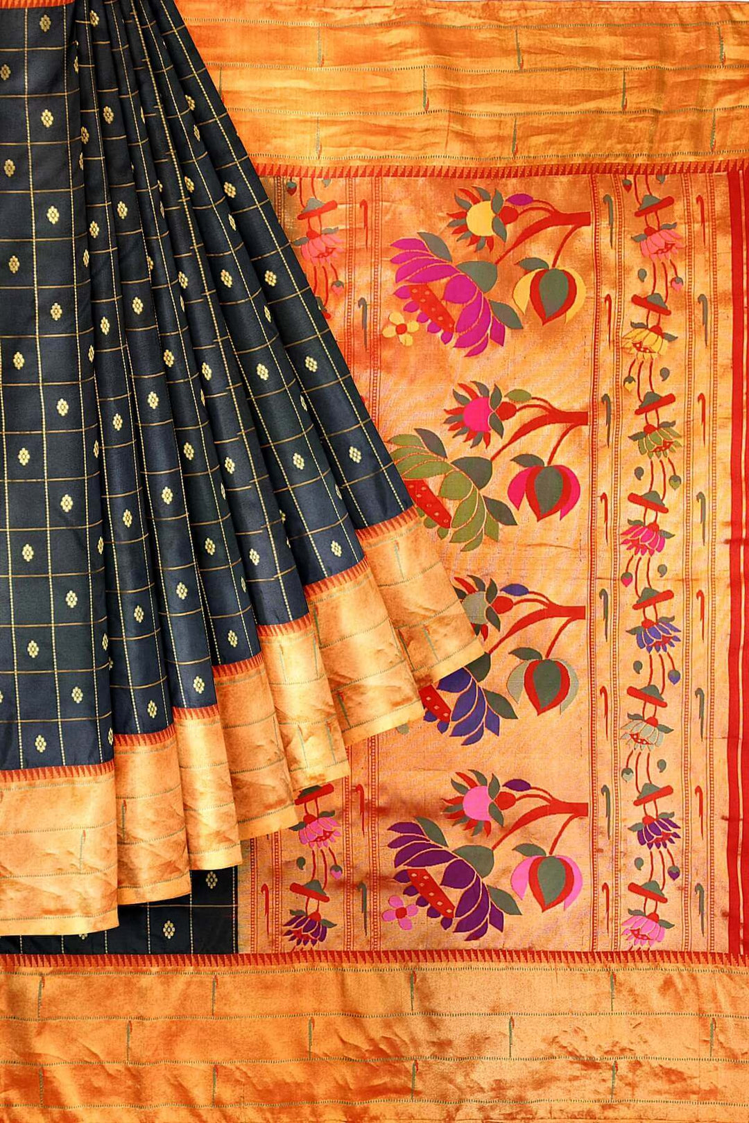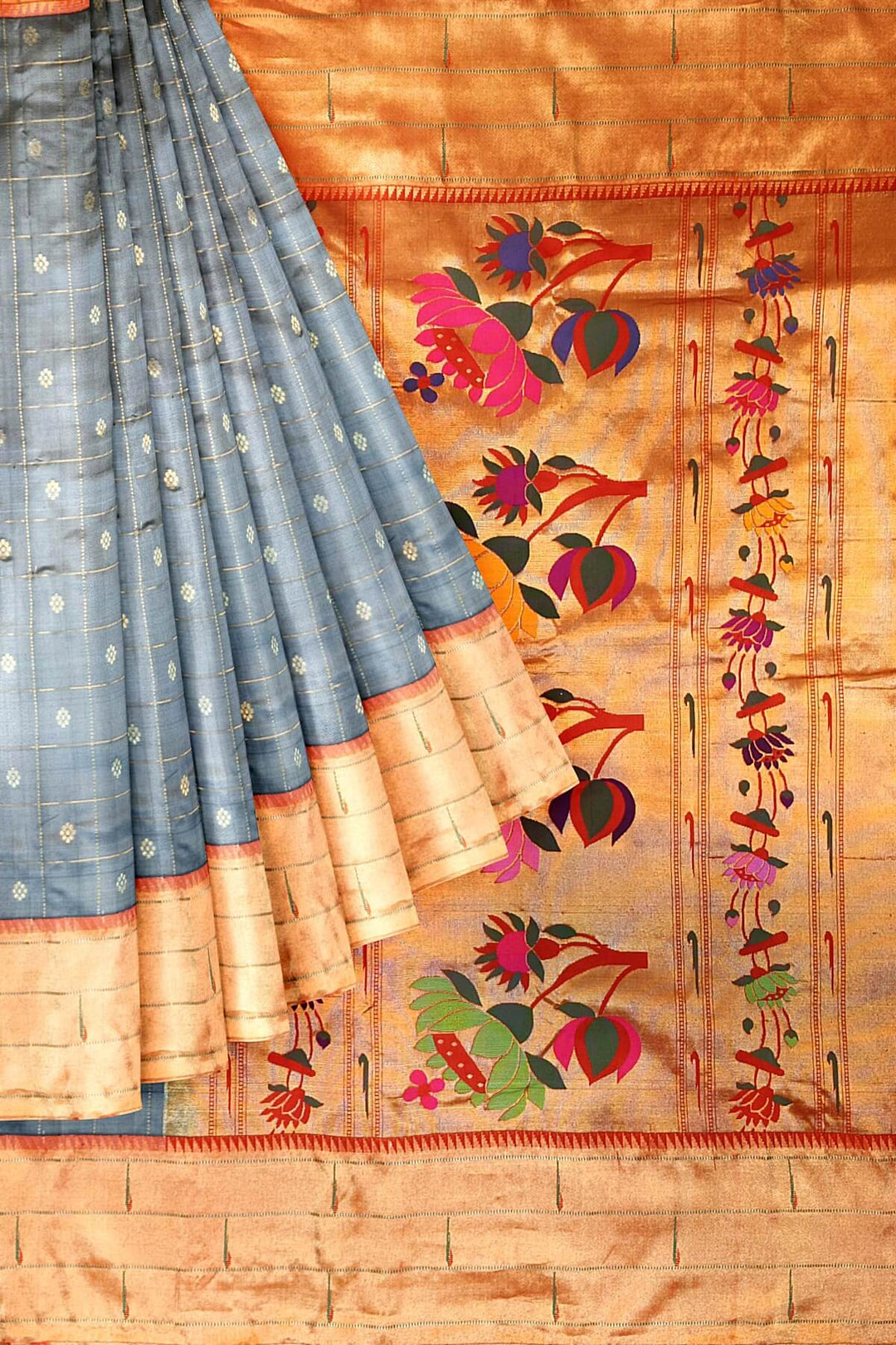 Paithani pure silk saree in grey with checks & buttis on the body .