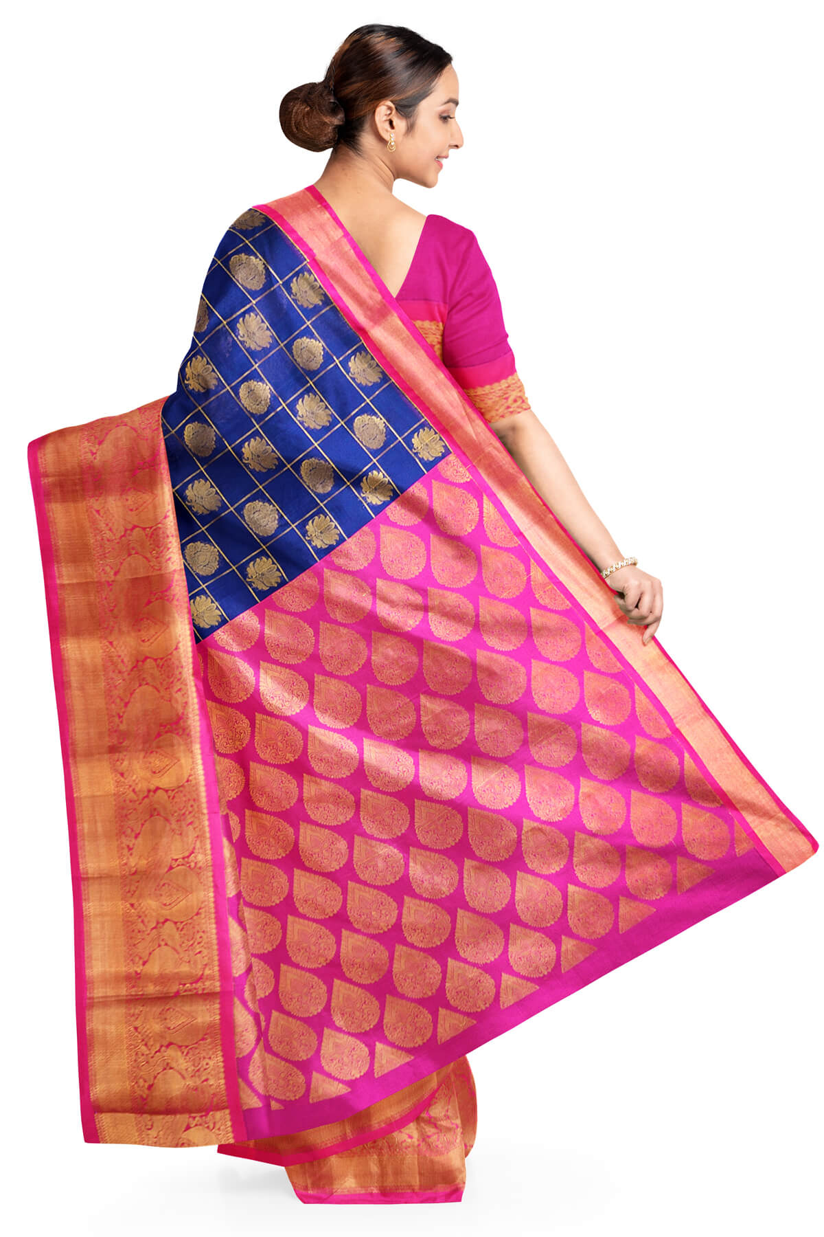 Description: Kanchi pure silk organza saree in blue & pink with floral motifs