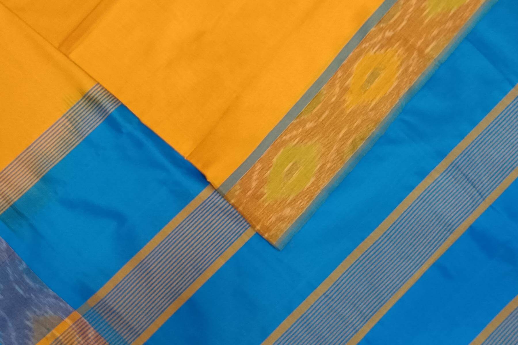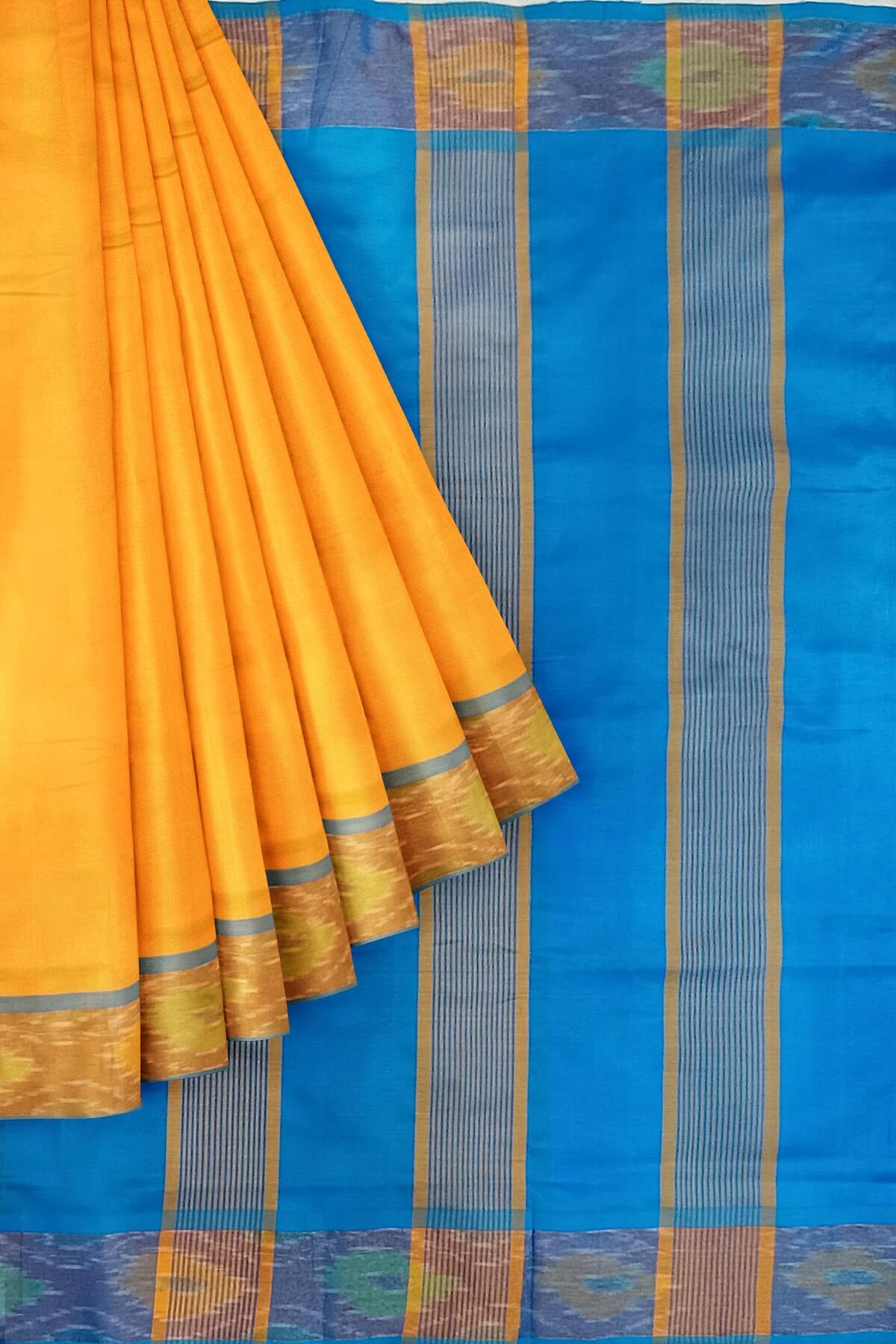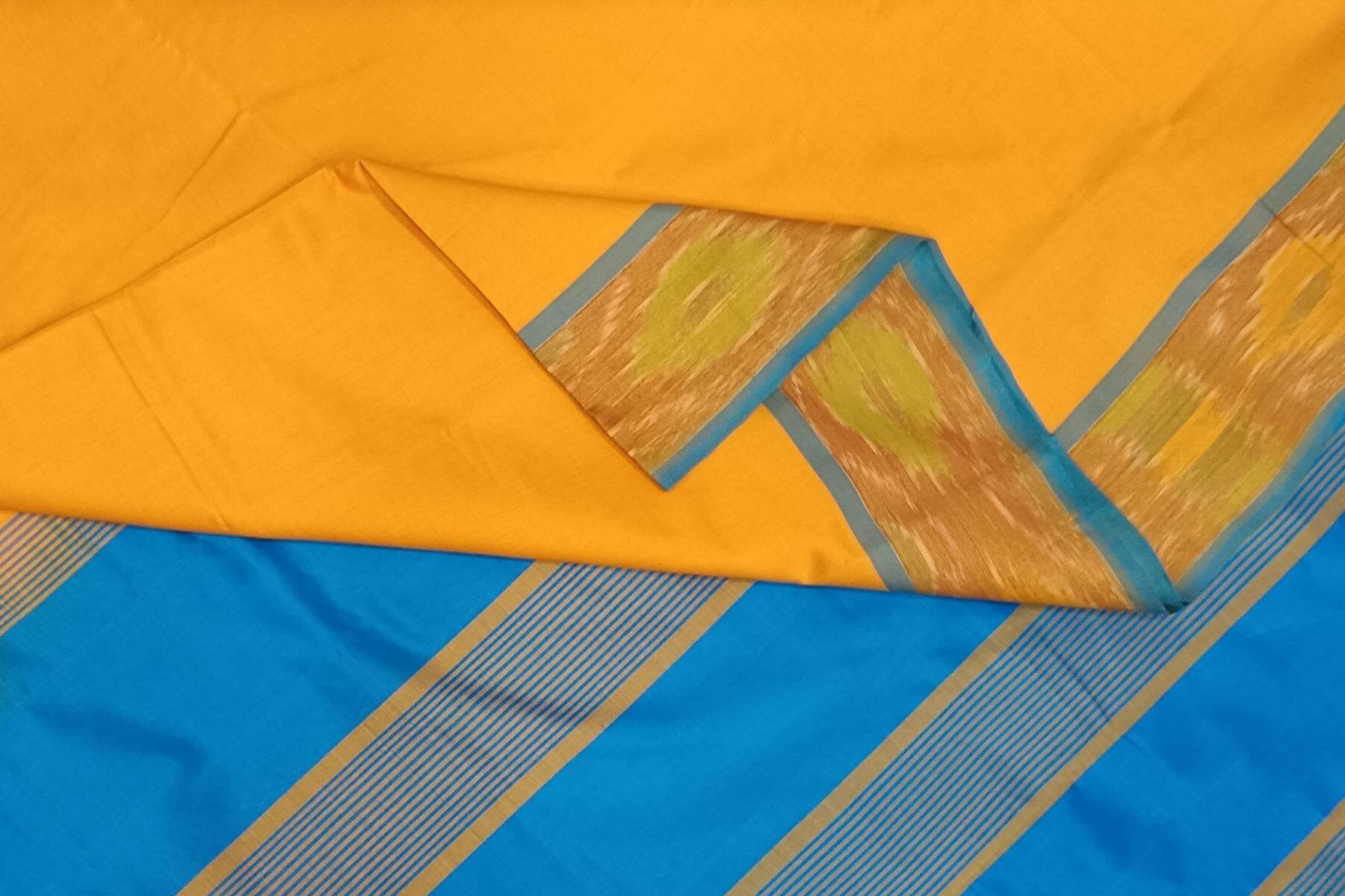 Description: Handloom Uppada silk cotton saree in mango yellow & blue with pochampalli pattern border